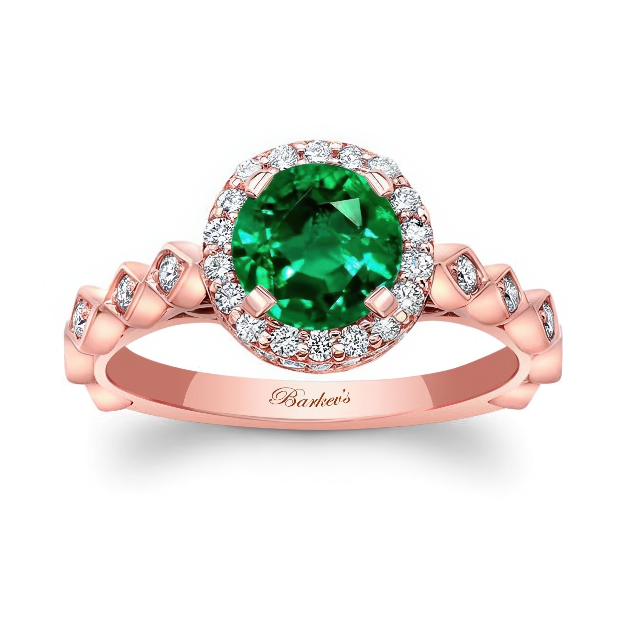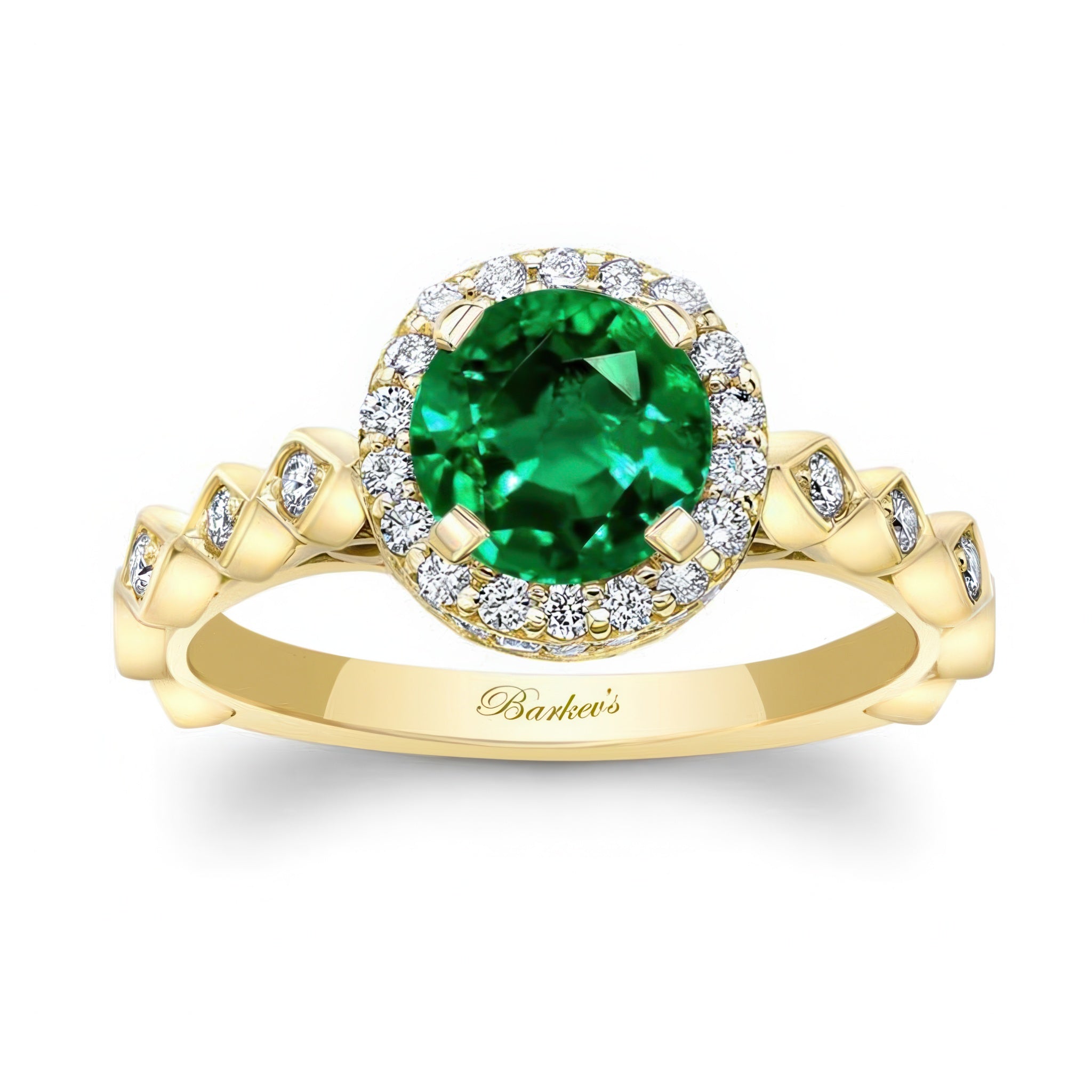 A vintage halo emerald and diamond ring featuring a prong set round center with a pave set diamond halo and a shank adorned with diamonds set in marquise shaped frames that add graceful sparkle to this brilliant ring.