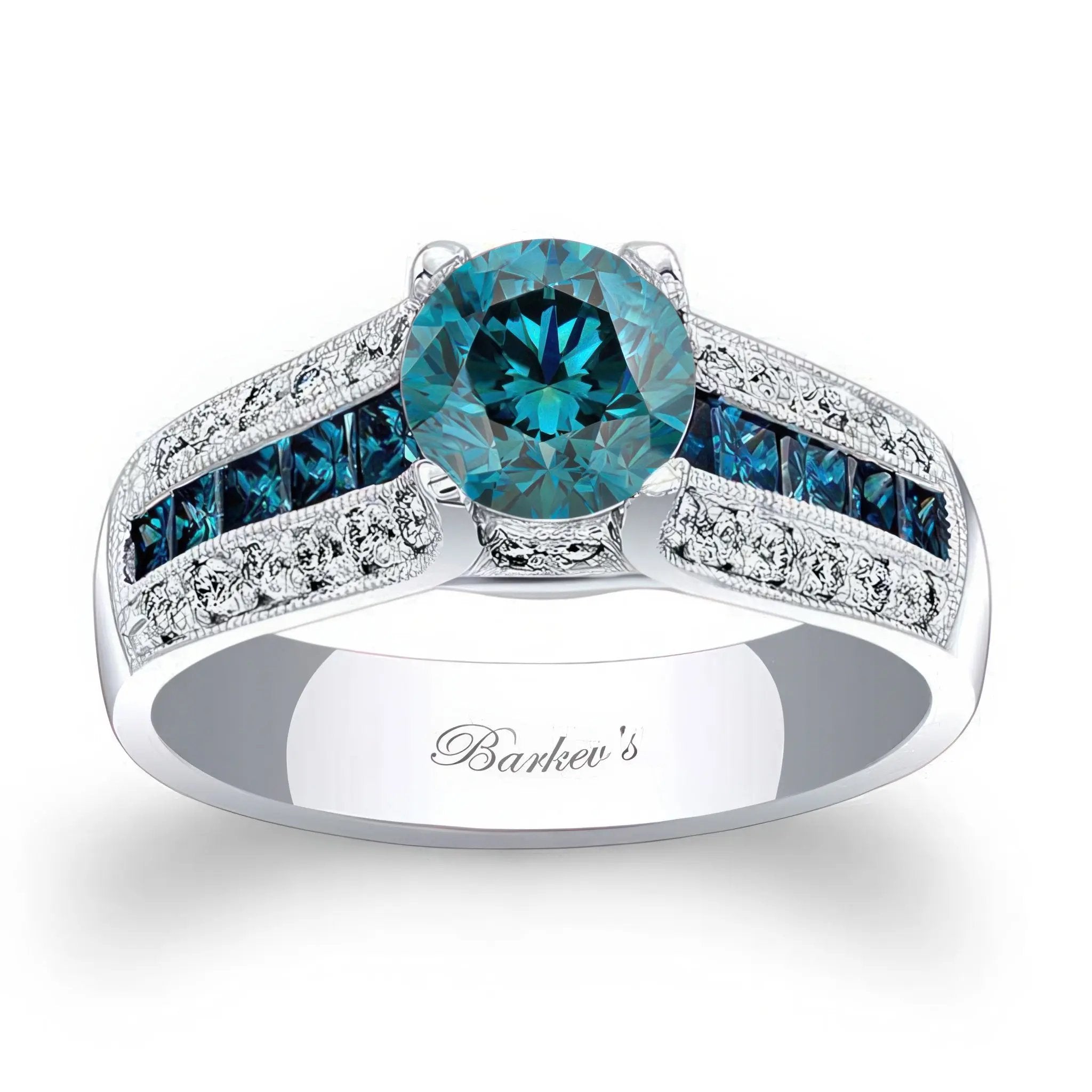 This vintage milgrain blue diamond engagement ring sports a prong set round center with three rows of channel set princess cut blue diamonds and pave set round diamonds for a touch of elegance.