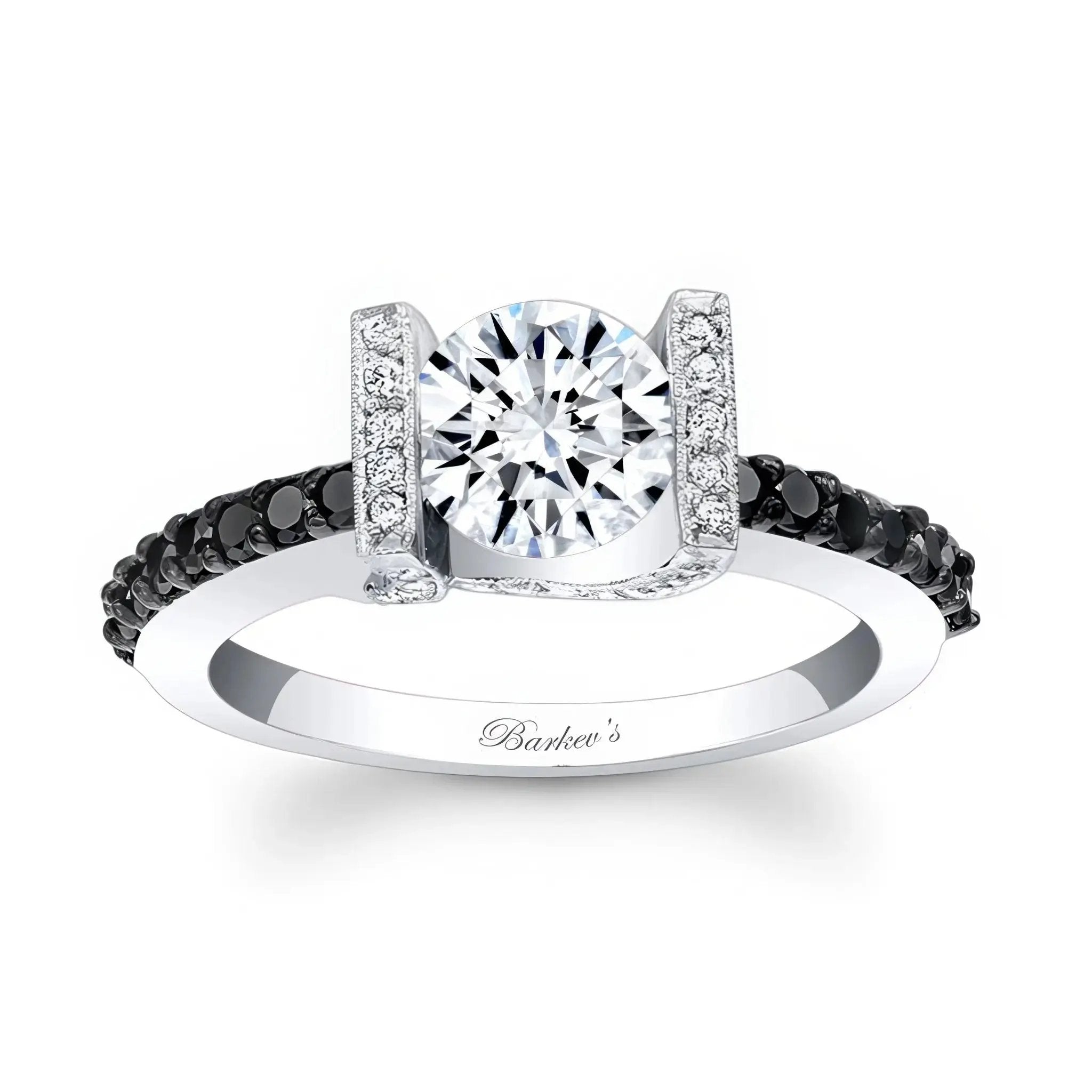 A vintage pave black diamond accent ring sporting a channel set round center with pave set diamonds gracing the top and side walls and black diamonds cascading down the shank adding a touch of drama.