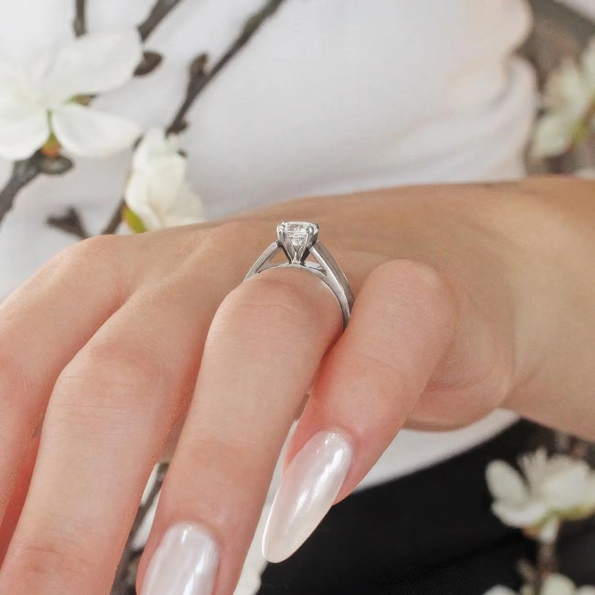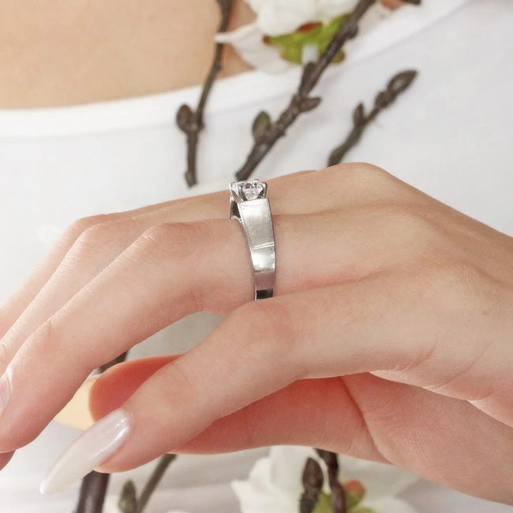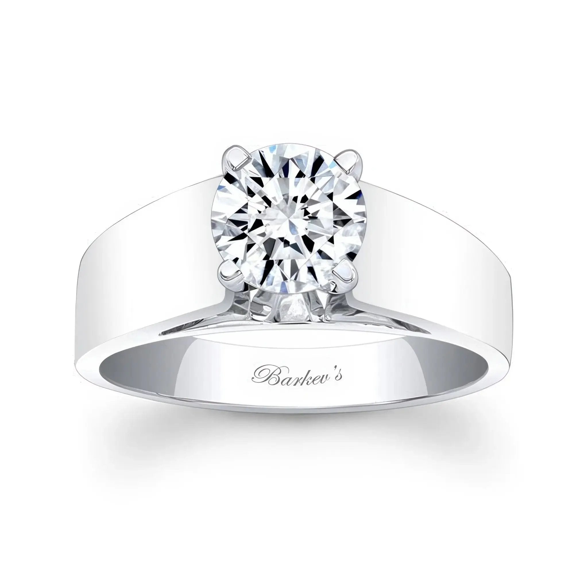 This wide band solitaire ring makes a strong statement with a prong set round center and broad cathedral shoulders.