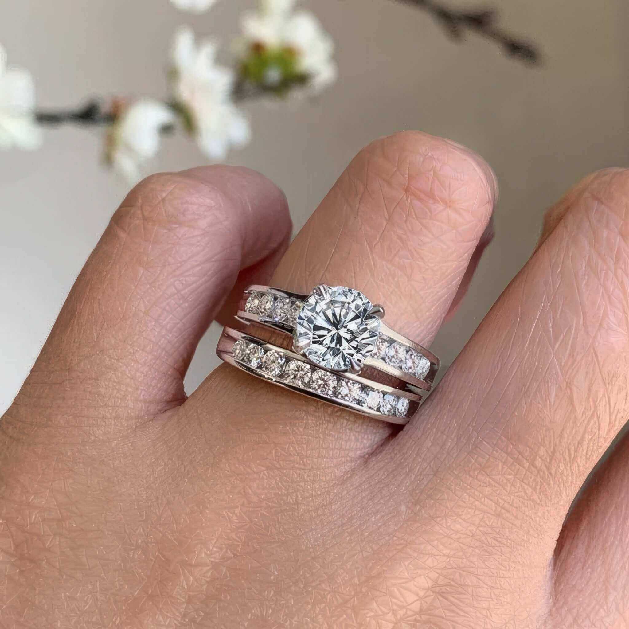 A beautiful 1 carat lab diamond wedding ring set featuring a prong set round center with channel set diamonds on the sides for a stunning look. Comes with a matching diamond wedding band.
