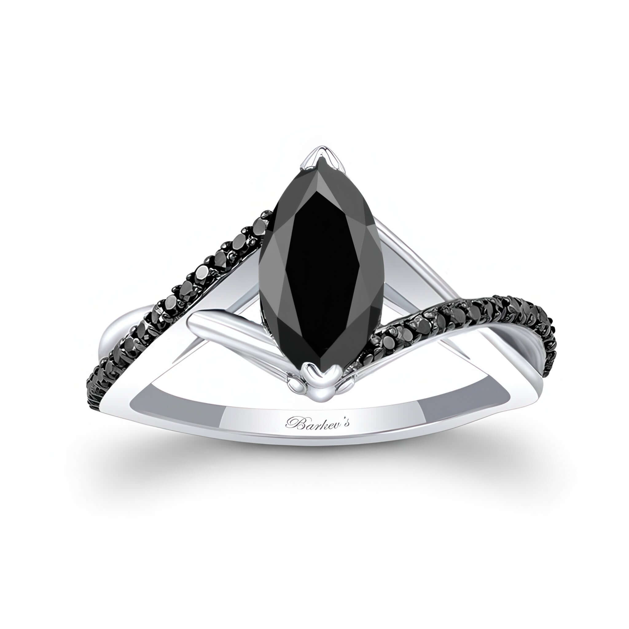 This 1 carat marquise black diamond ring features an overlapping black diamond shank, a prong set marquise center and flower motif.