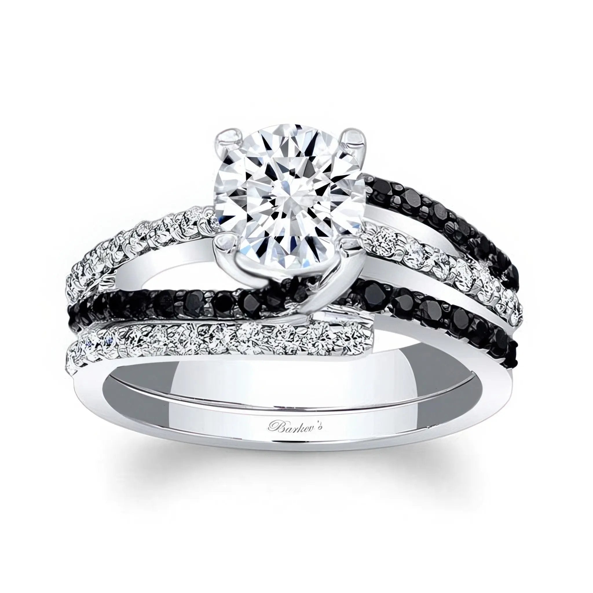 A classic 1 carat round cut lab diamond bridal set with black diamond accents featuring a prong set center with shared prong set black diamonds adorning the sides and white diamonds set on the bridge for an elegant touch of drama. Comes with a matching black and white diamond wedding band.