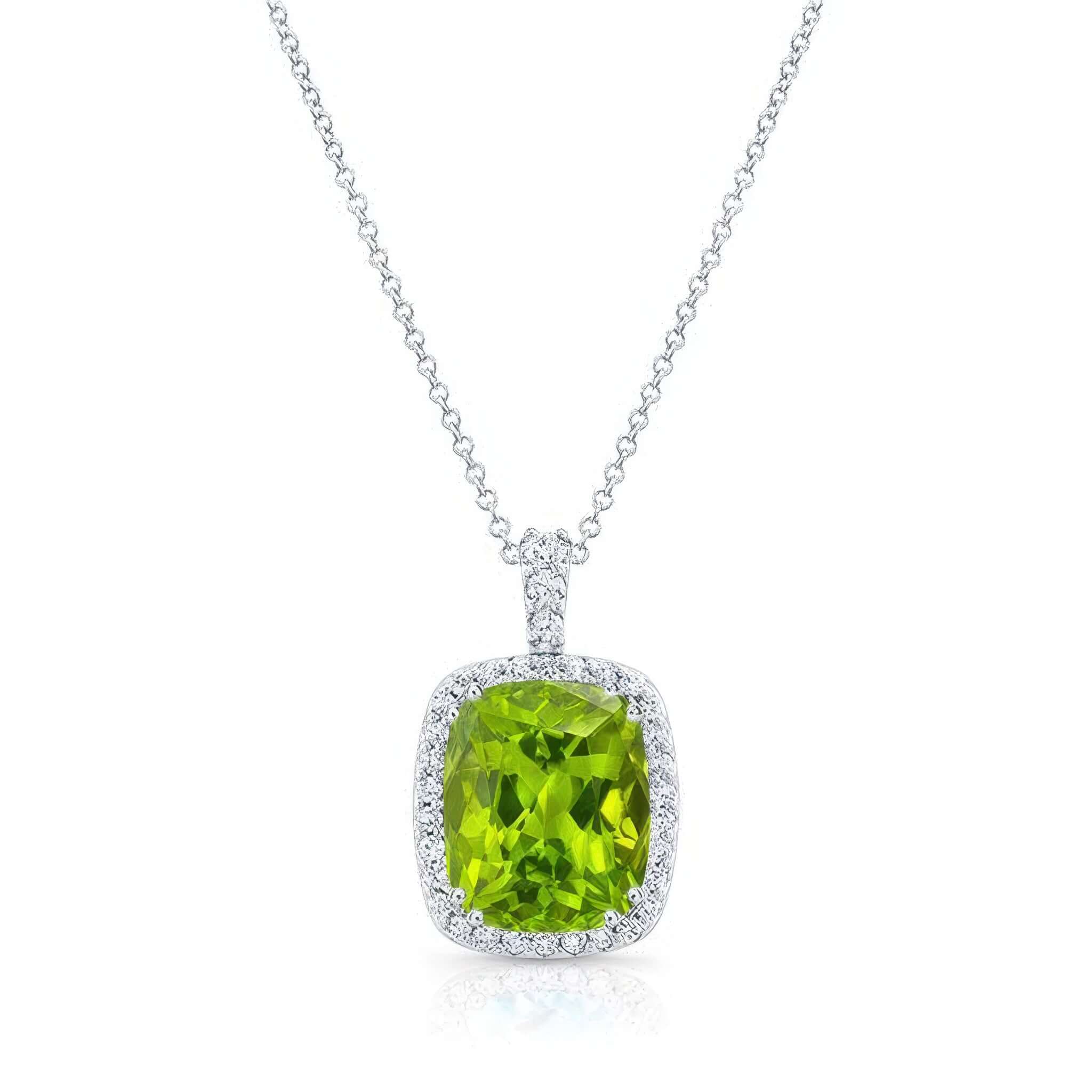 This 5 carat cushion peridot diamond necklace features a prong set cushion cut center with glittering shared prong set diamonds all around it for a unique look.
