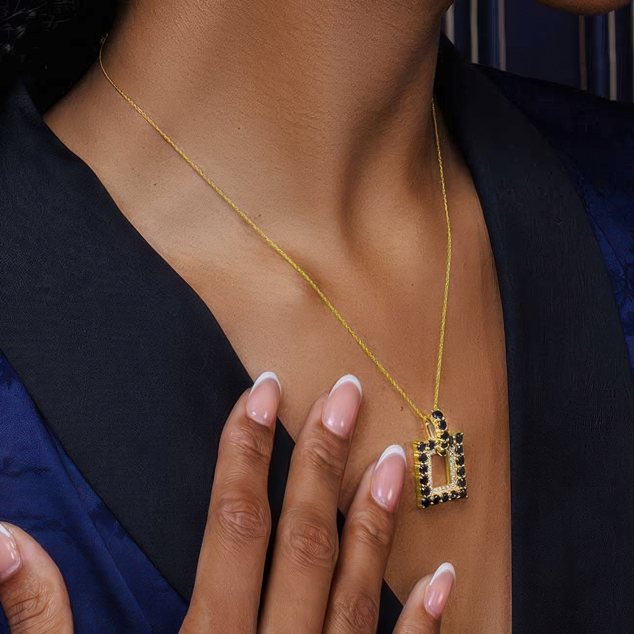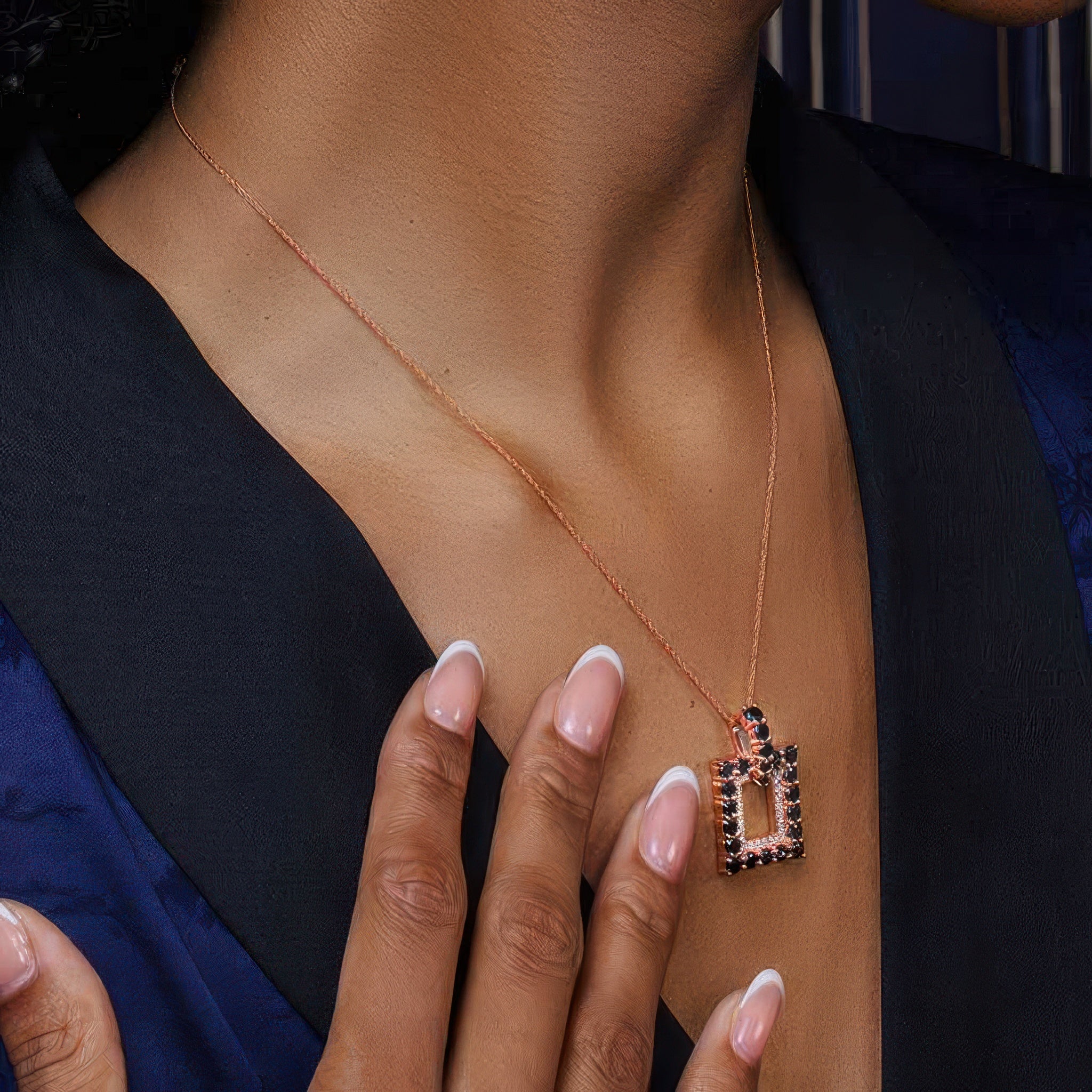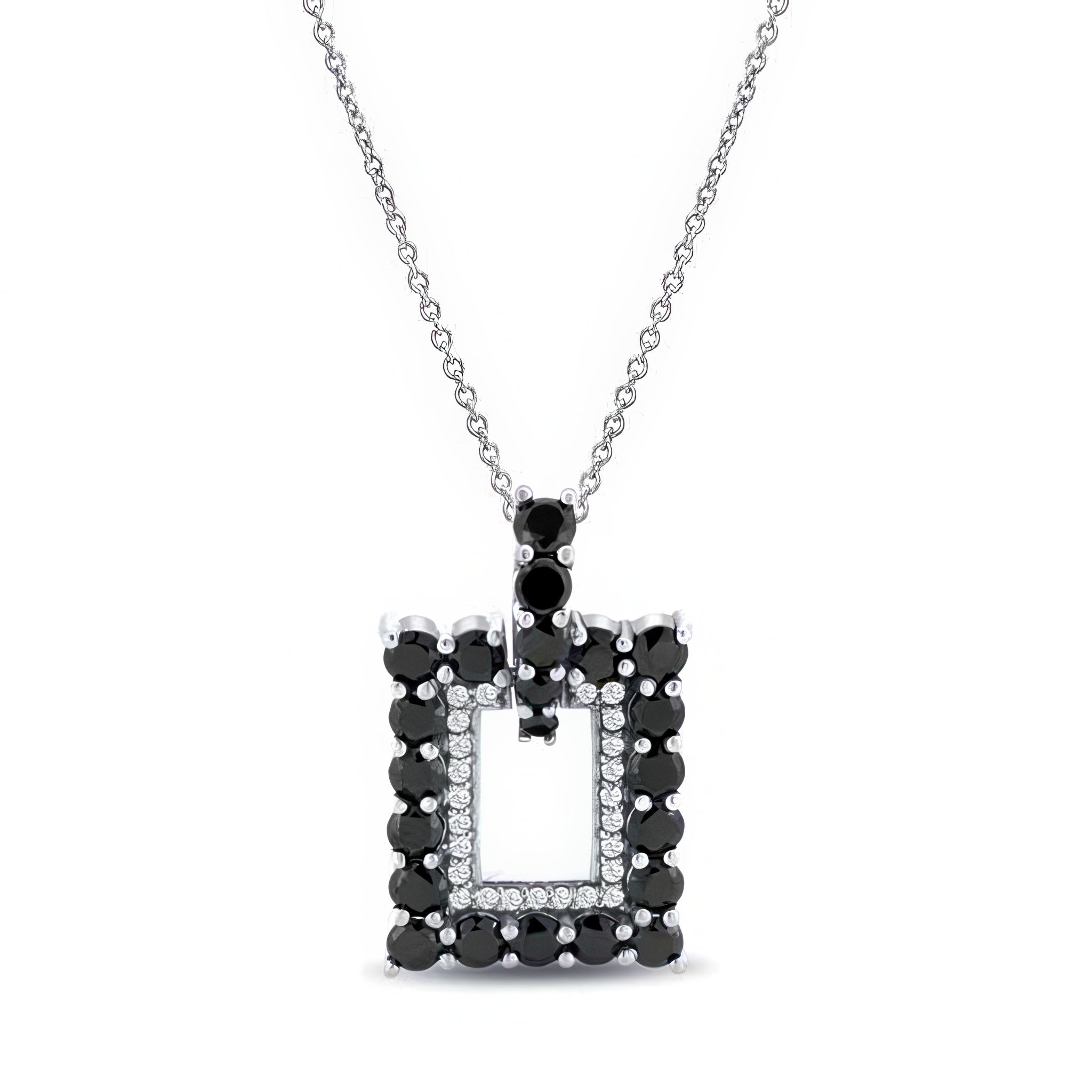 A stunning black diamond necklace featuring a square shape with shared prong set black diamonds on the outside and white diamonds on the inside for an elegant look.