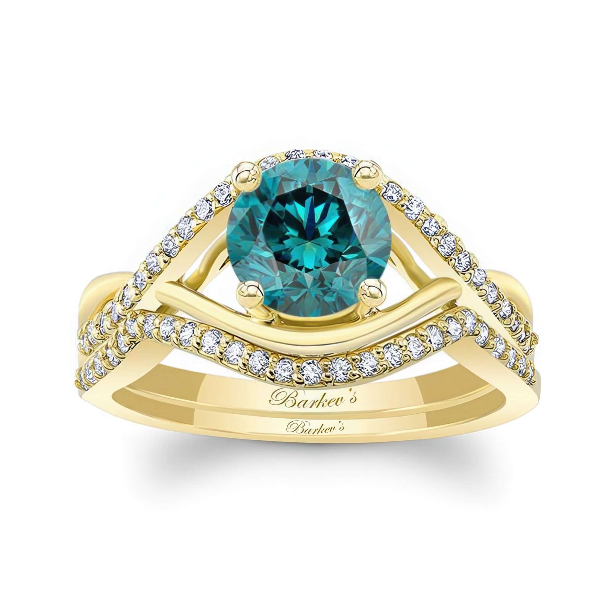 A beautiful blue and white diamond criss cross ring set featuring a curving shank, shared prong set diamond melees and a round center stone. Also comes with a wedding band.