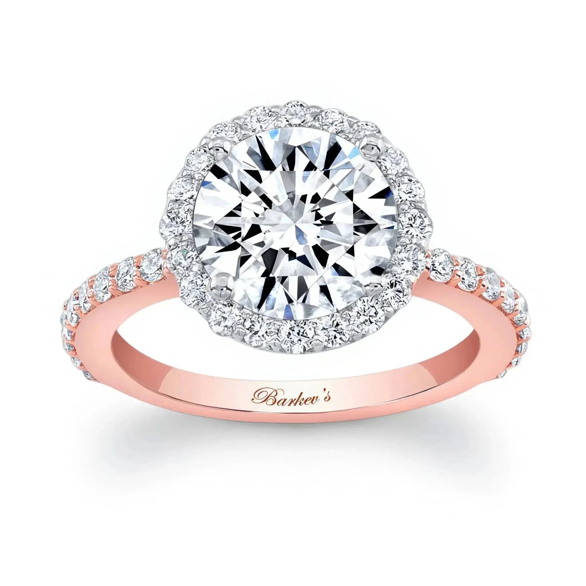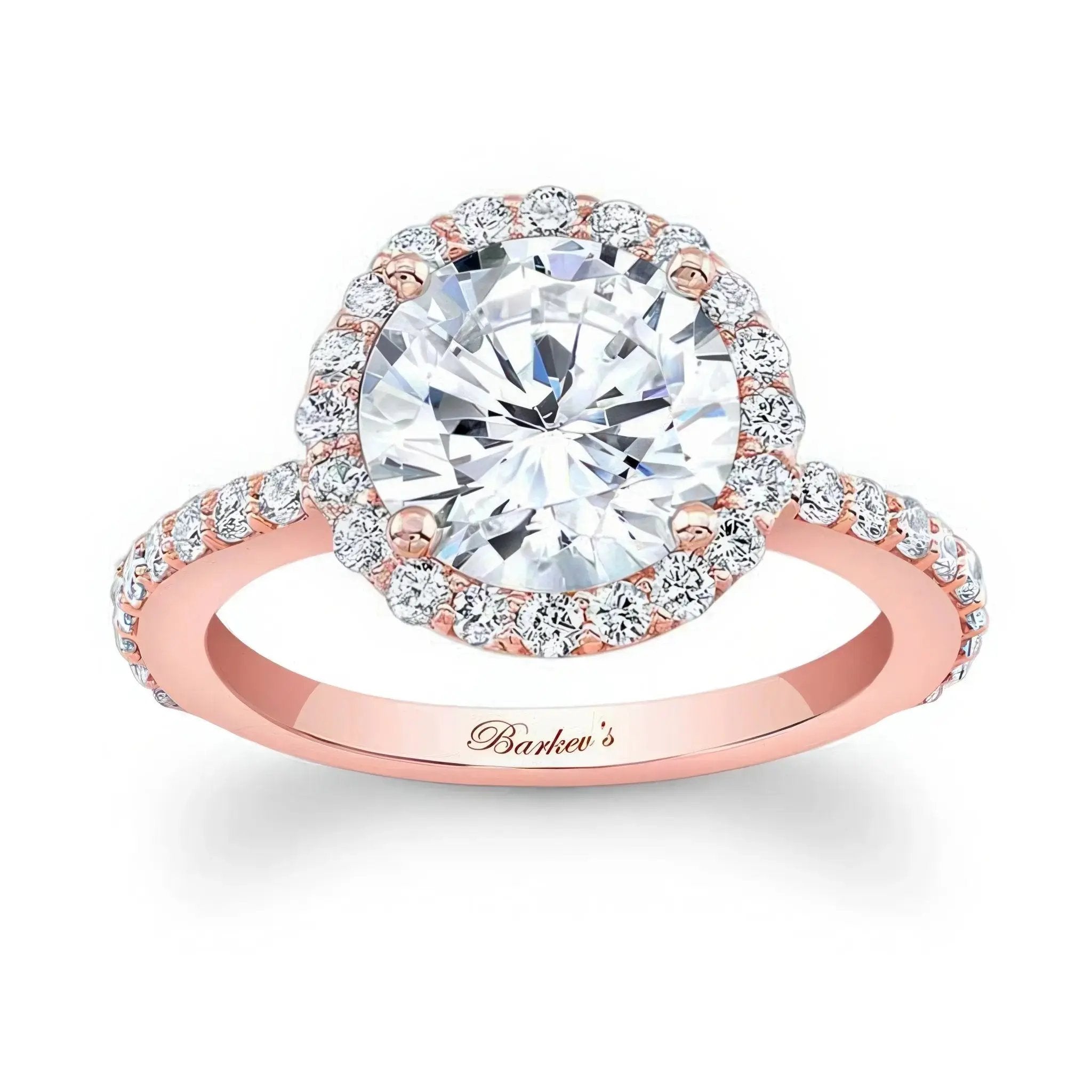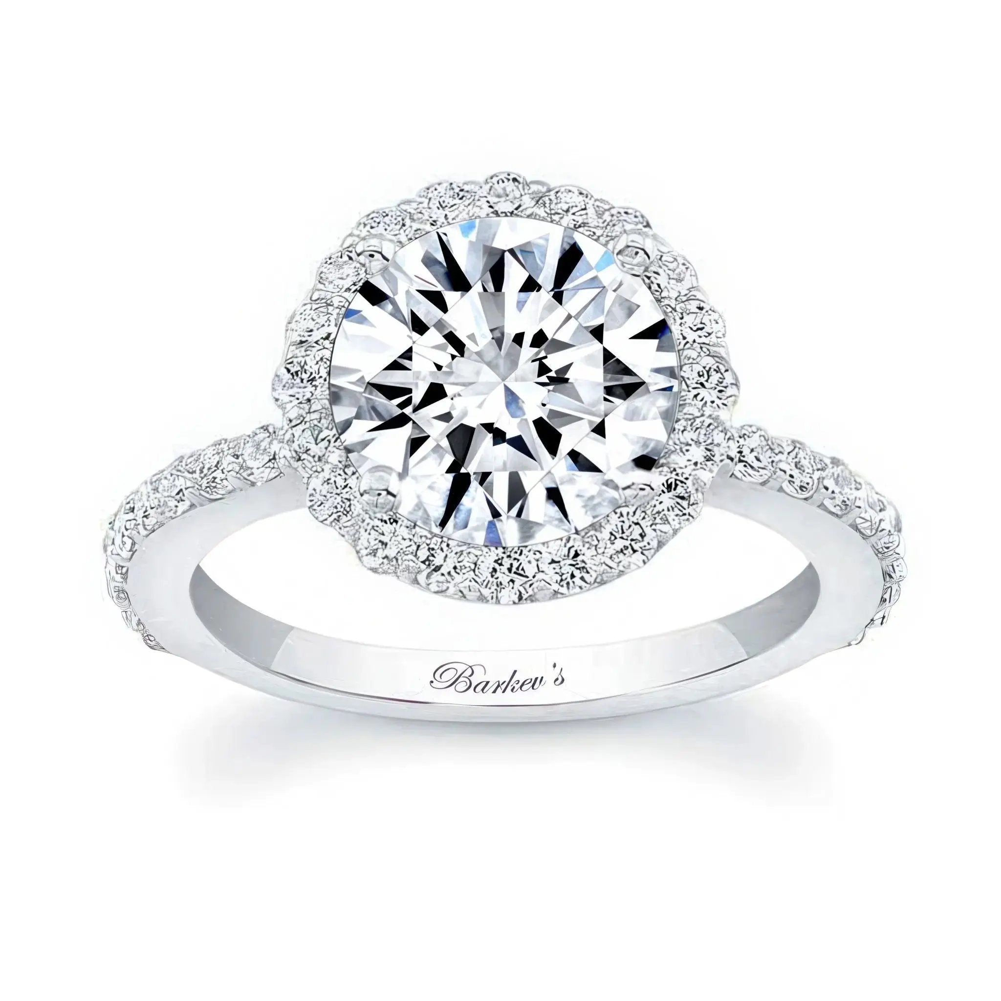 This 2 carat moissanite halo engagement ring features shared prong set diamonds around the center and more cascading down the shank for a look of sheer elegance.