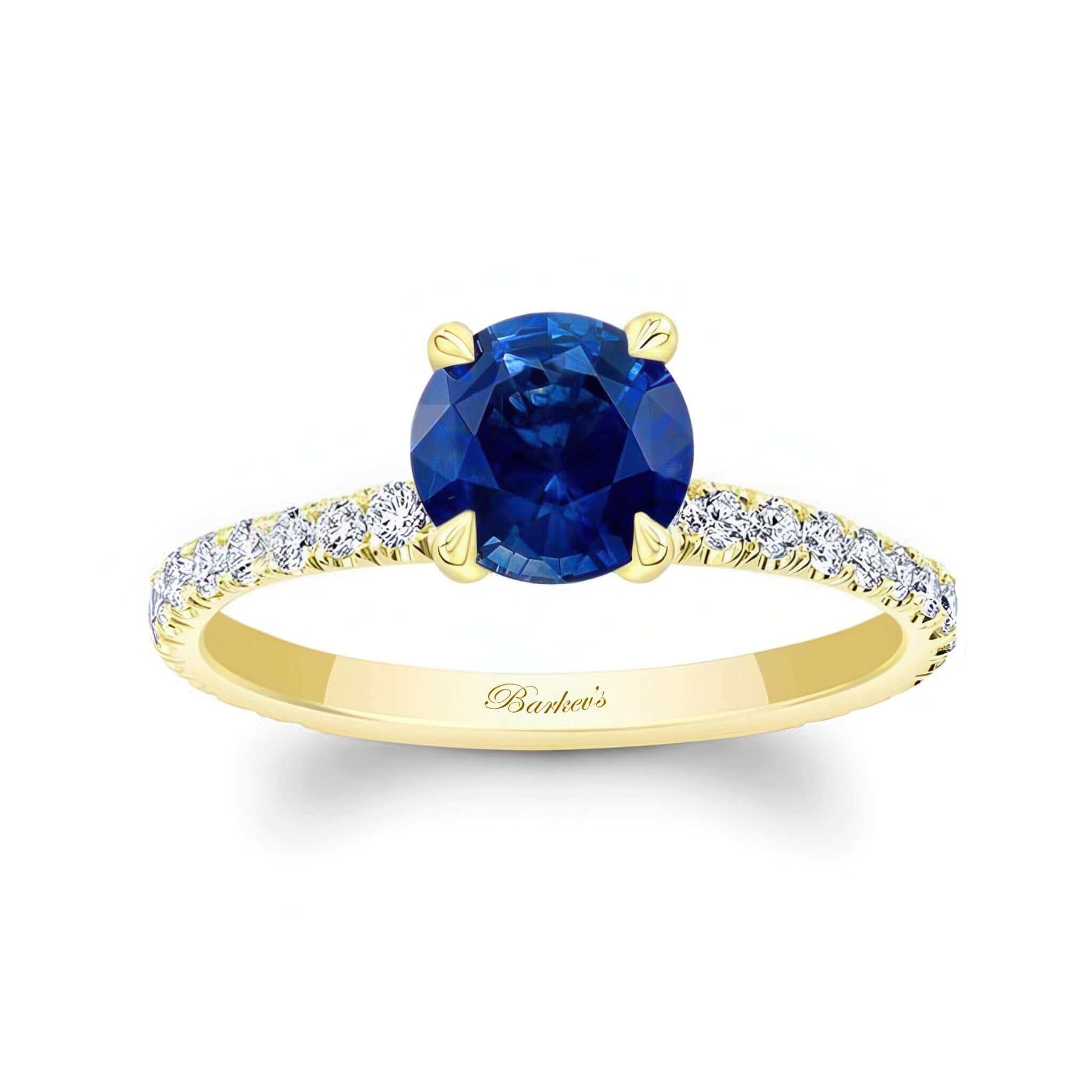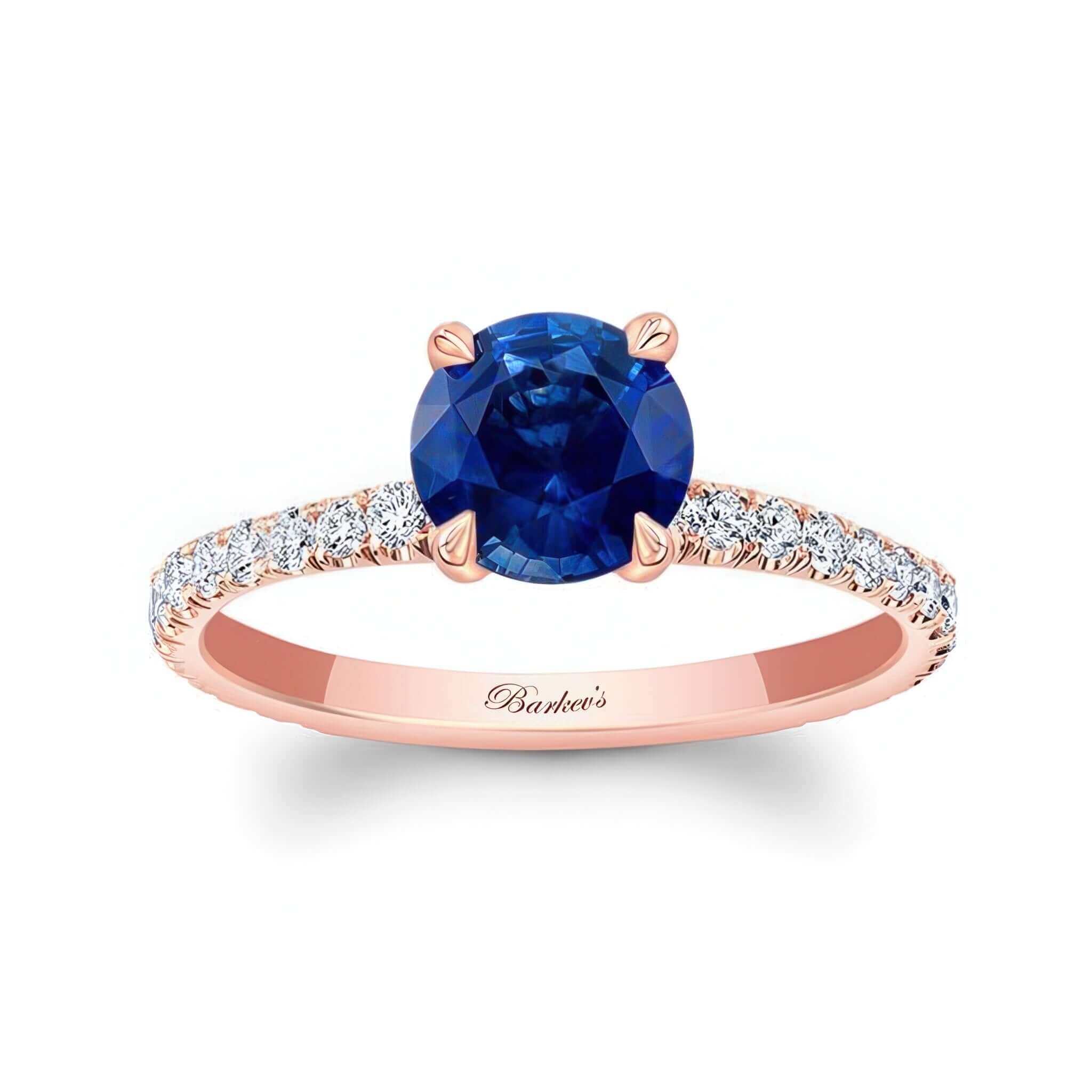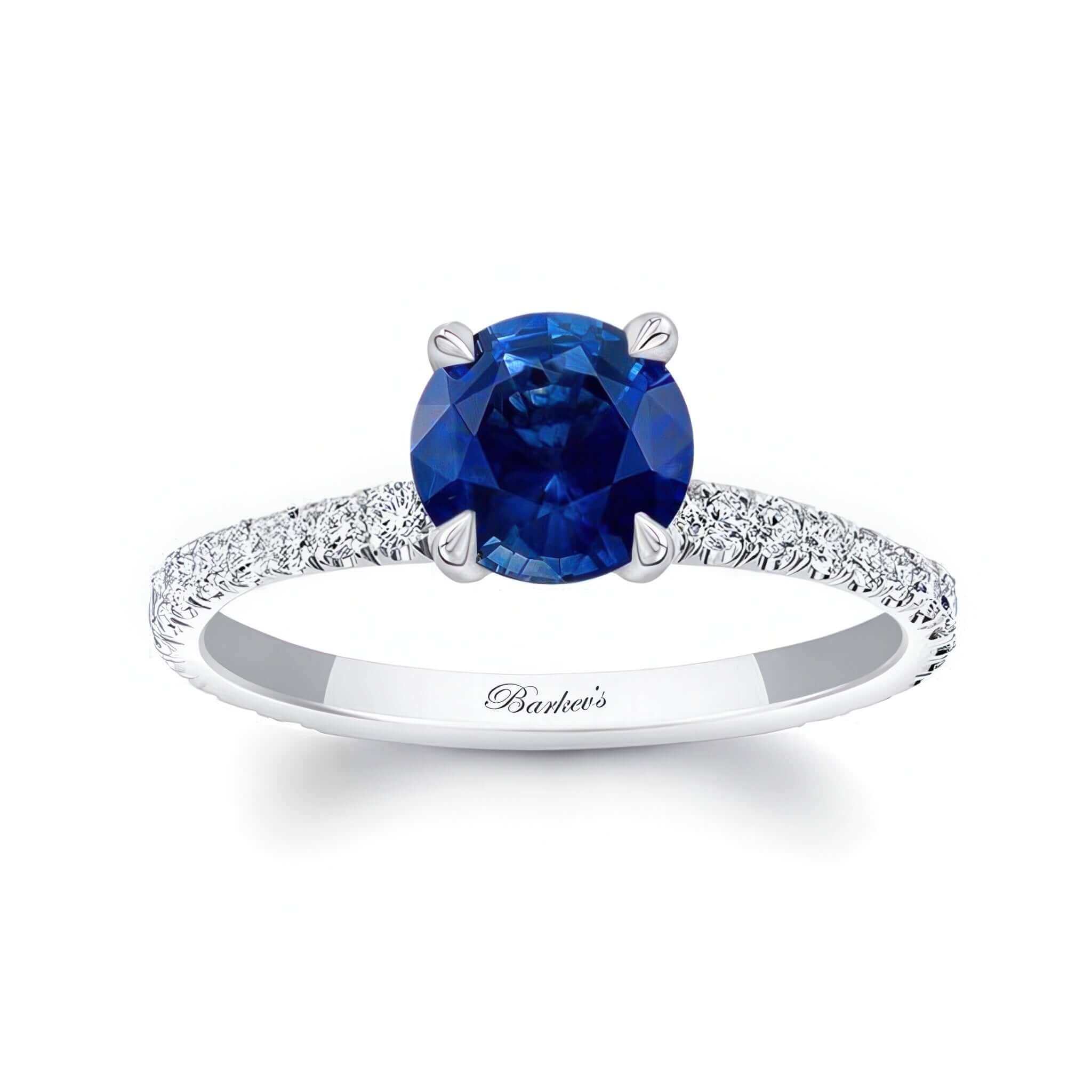 This stunning blue sapphire and diamond ring features a prong set round center with a french cut pave set diamond halo underneath it and more brilliant diamonds cascading down the shank for a look that's nothing short of spectacular.