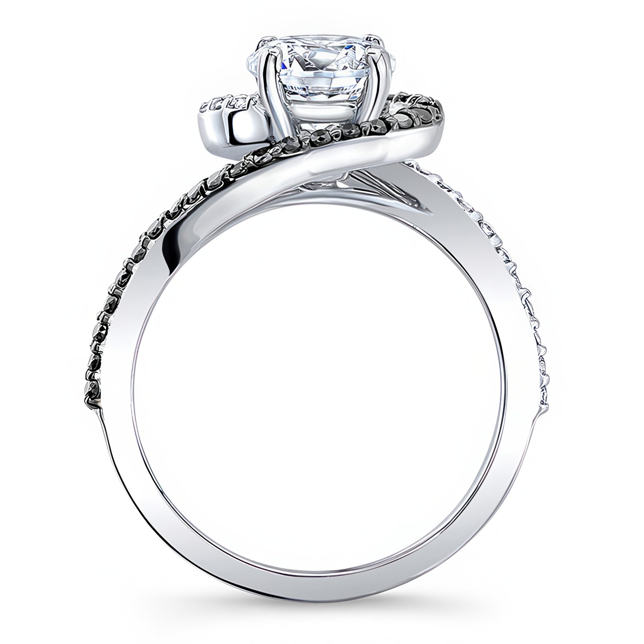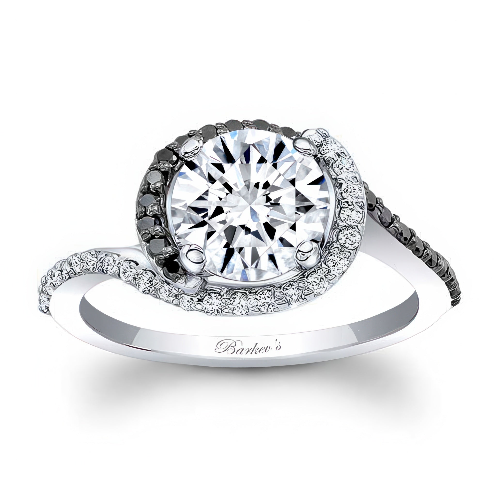 This black diamond accent half halo engagement ring features a prong set round center adorned with shared prong set black and white diamonds swirling around and down the dainty shoulders.