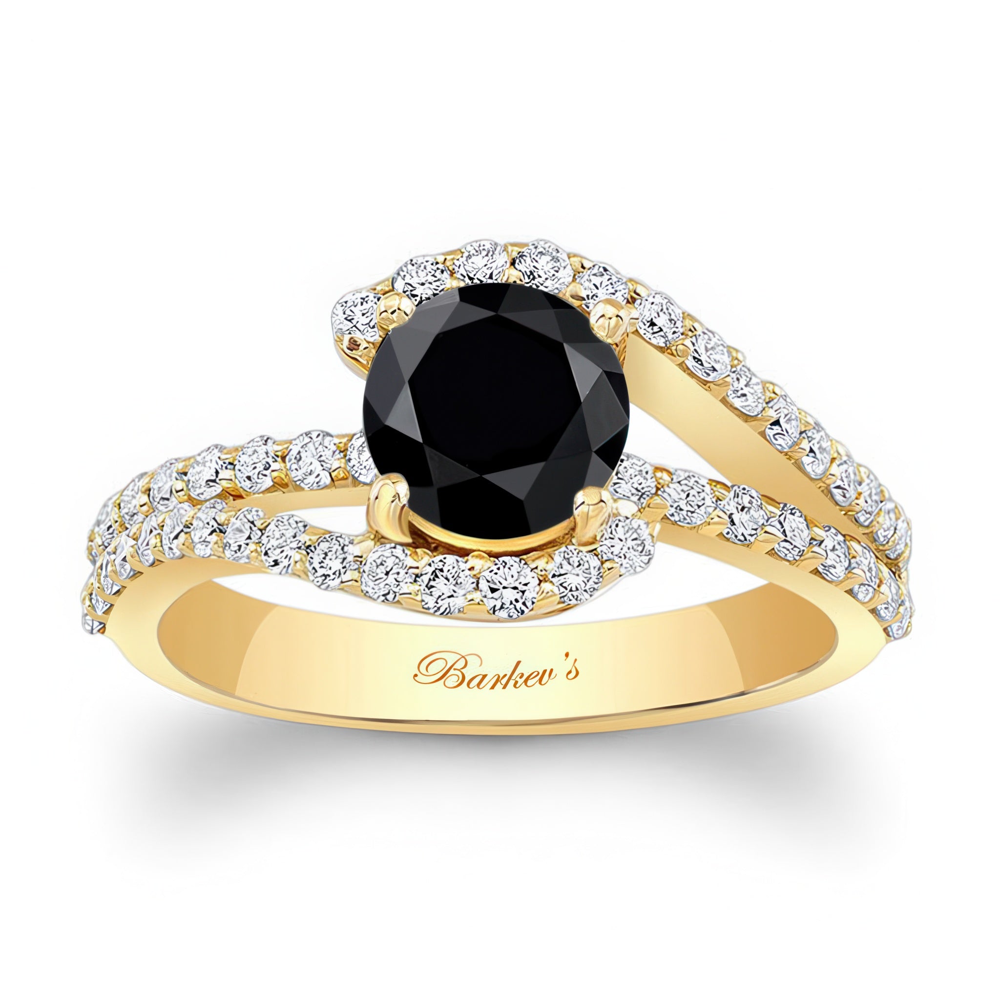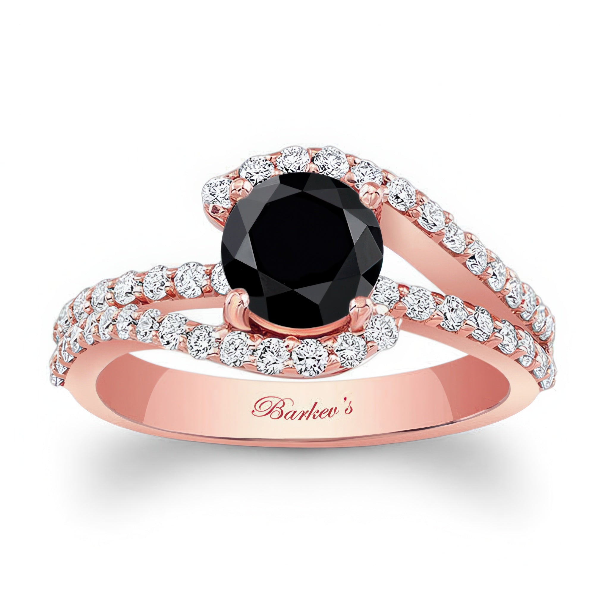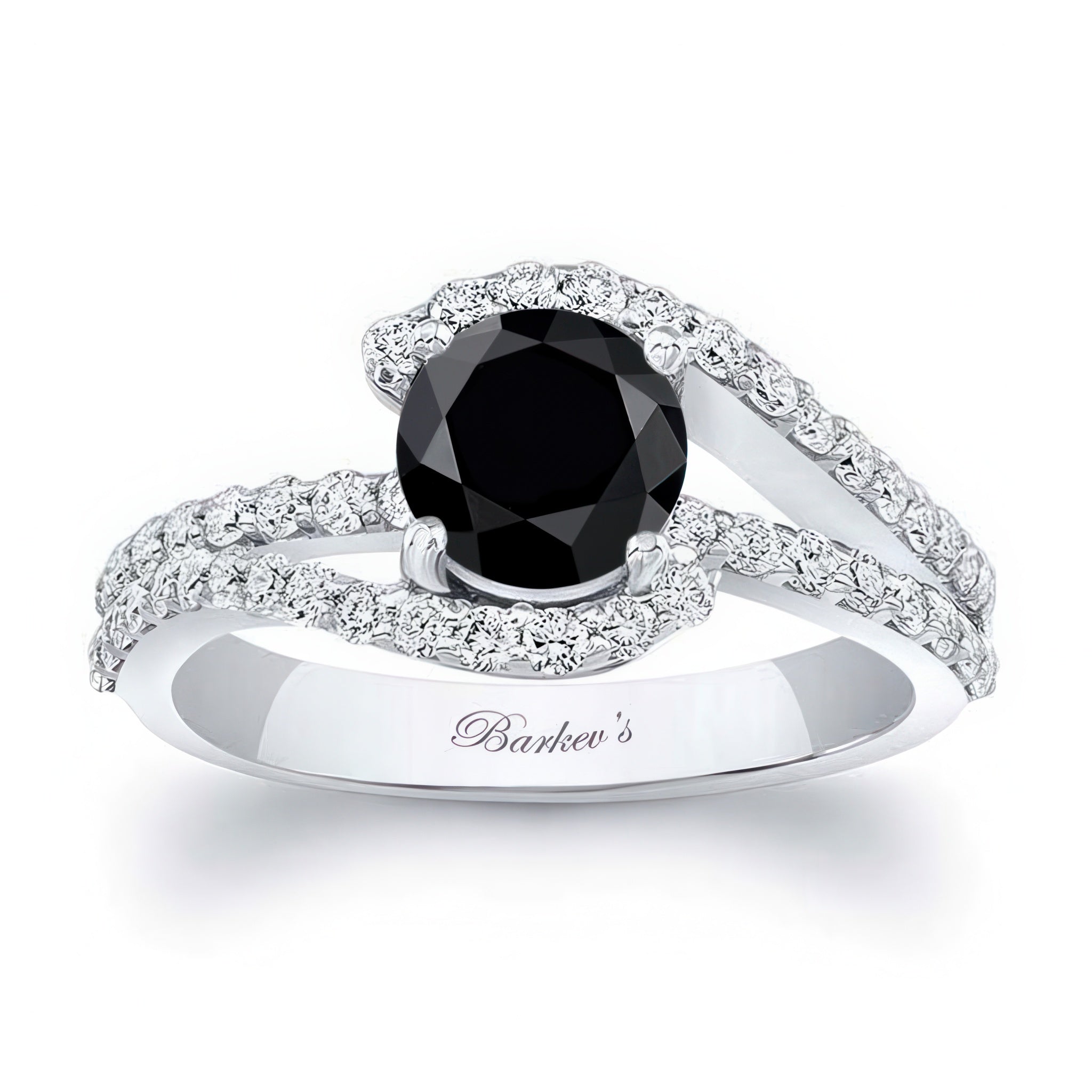 This 1 carat black and white diamond ring features a split shank that curves around the prong set round center and a bridge running underneath adorned with shared prong set diamonds for a classic yet brilliant look.