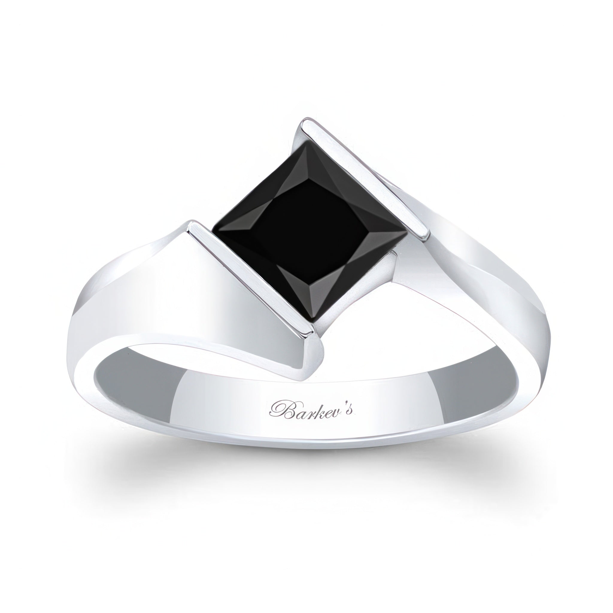 This princess black and white diamond solitaire ring features a channel set center with a polished shank and twisted ridges for a stunning look.