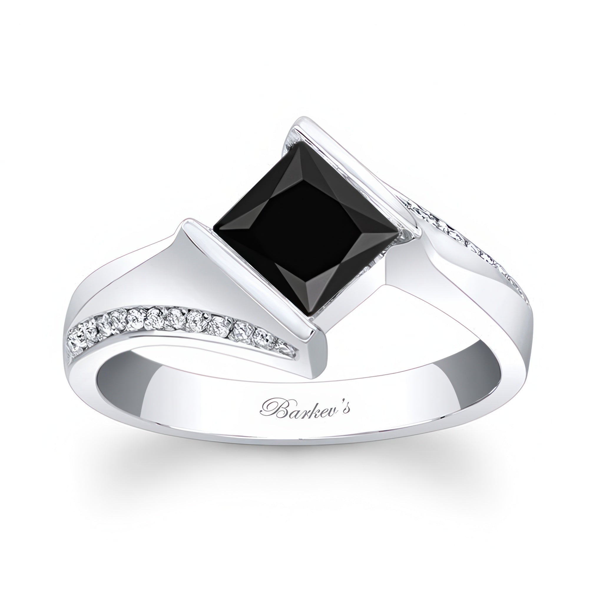 A stunning princess cut square black and white diamond ring featuring a channel set center that's captured by the ridges while pave set melees accent the bright polished shoulders for an elegant look.