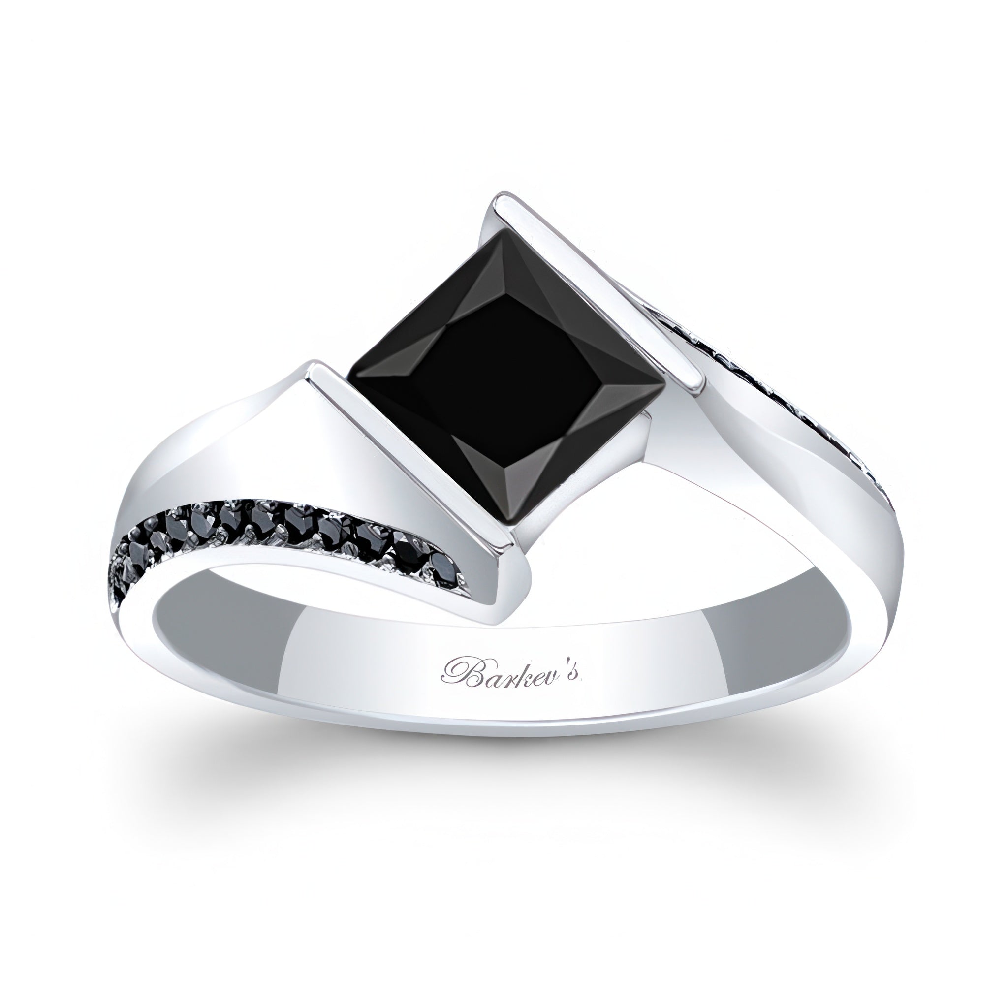 A stunning princess cut square black diamond ring featuring a channel set center that's captured by the ridges while pave set black diamonds accent the bright polished shoulders for an elegant look.