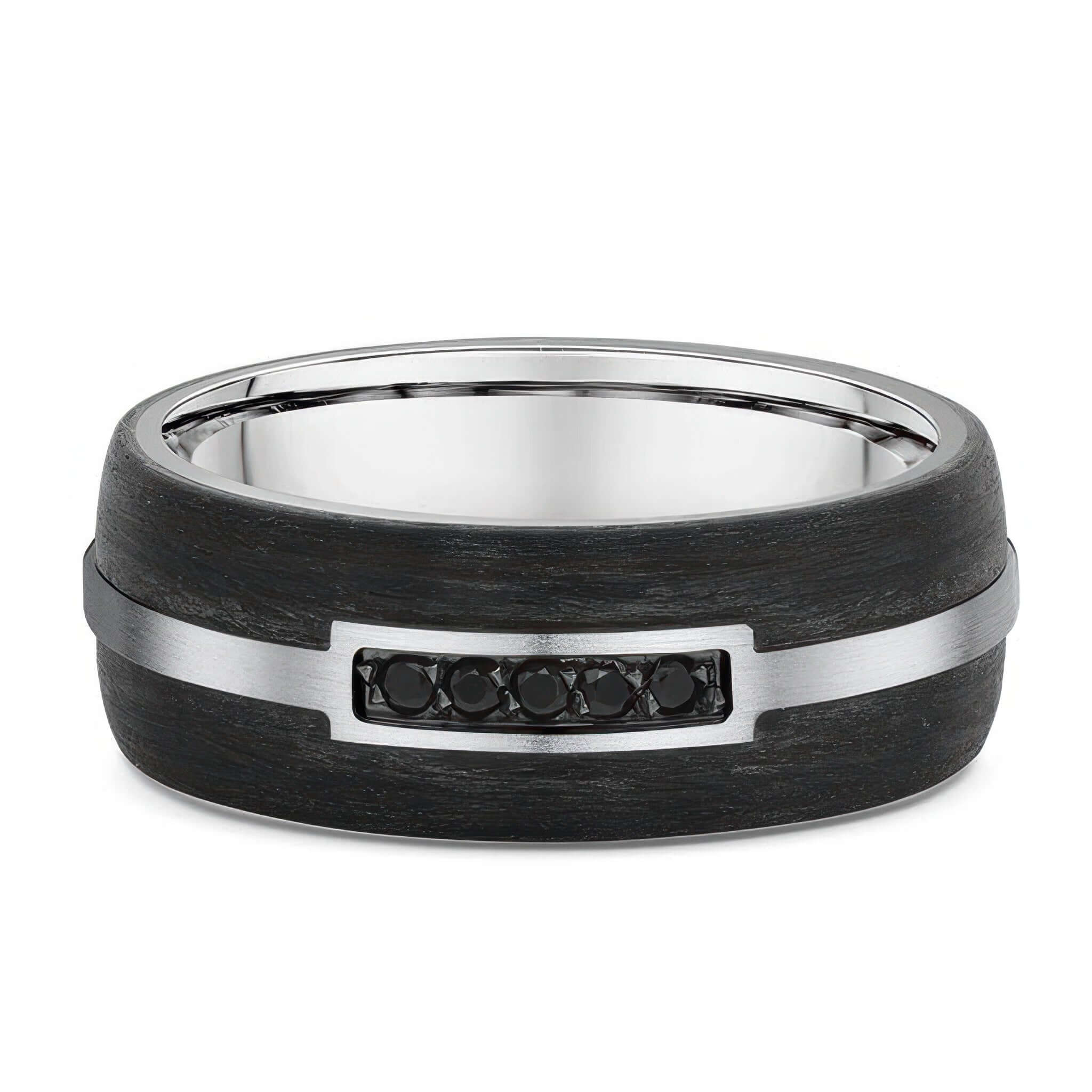 This captivating Dora men's black diamond trim wedding band features carbon fiber and a white gold trim with 5 gorgeous black diamonds.