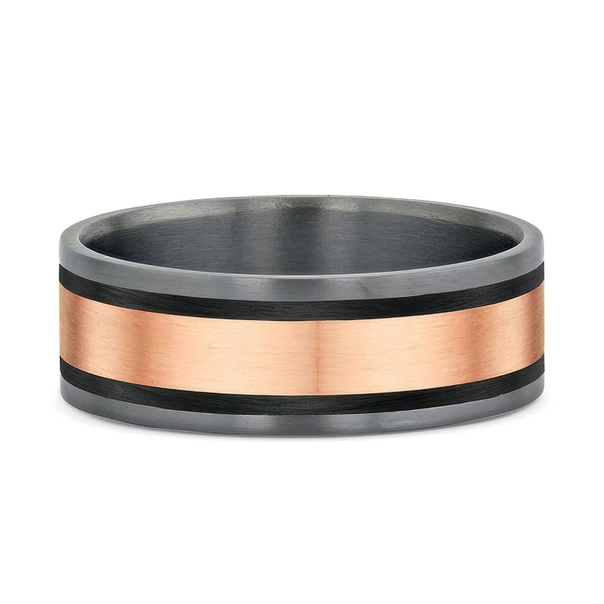 A comfort fit Dora men's rose gold and carbon fiber trim wedding band featuring tantalum with a rose gold center trim and 2 equally spaced carbon fiber trims.