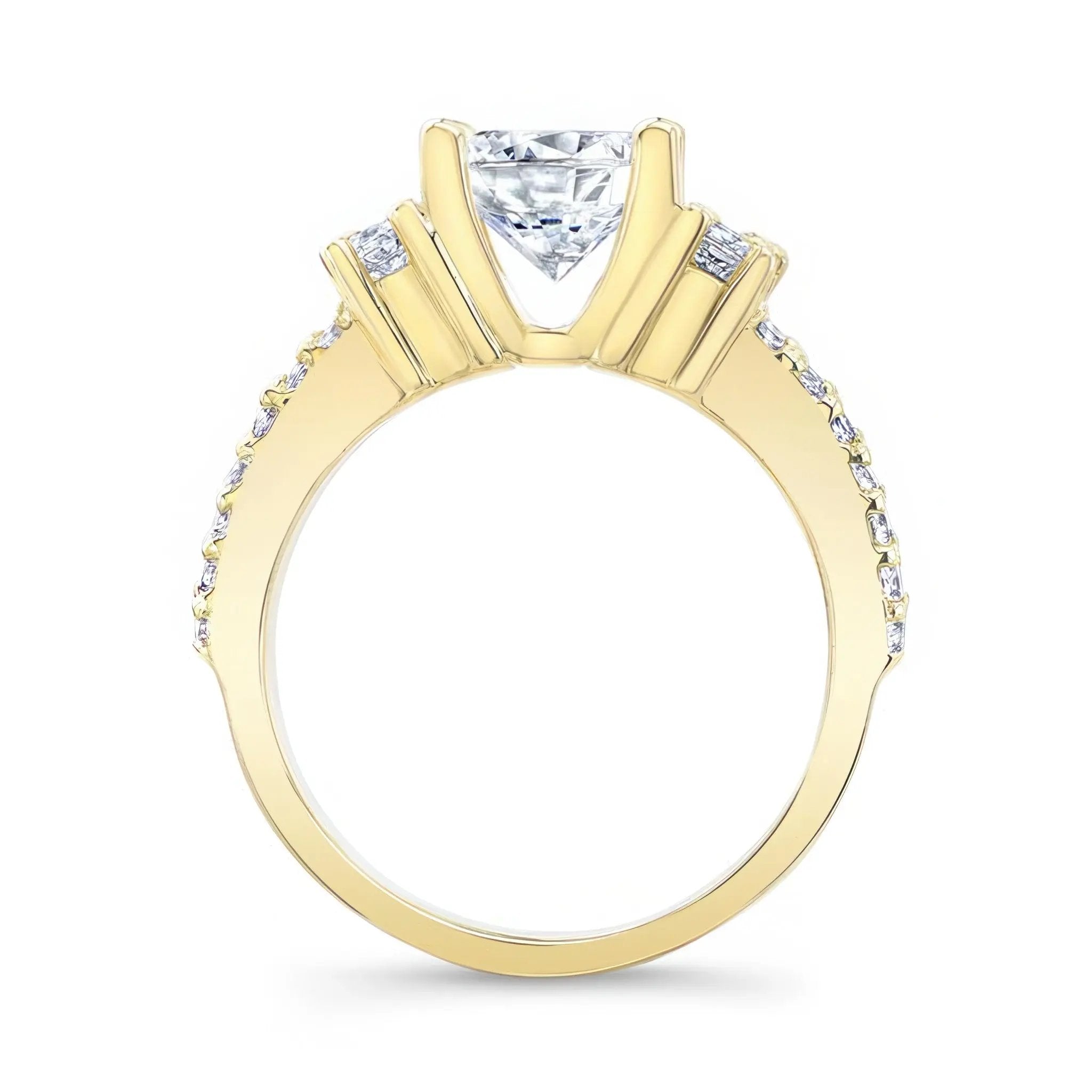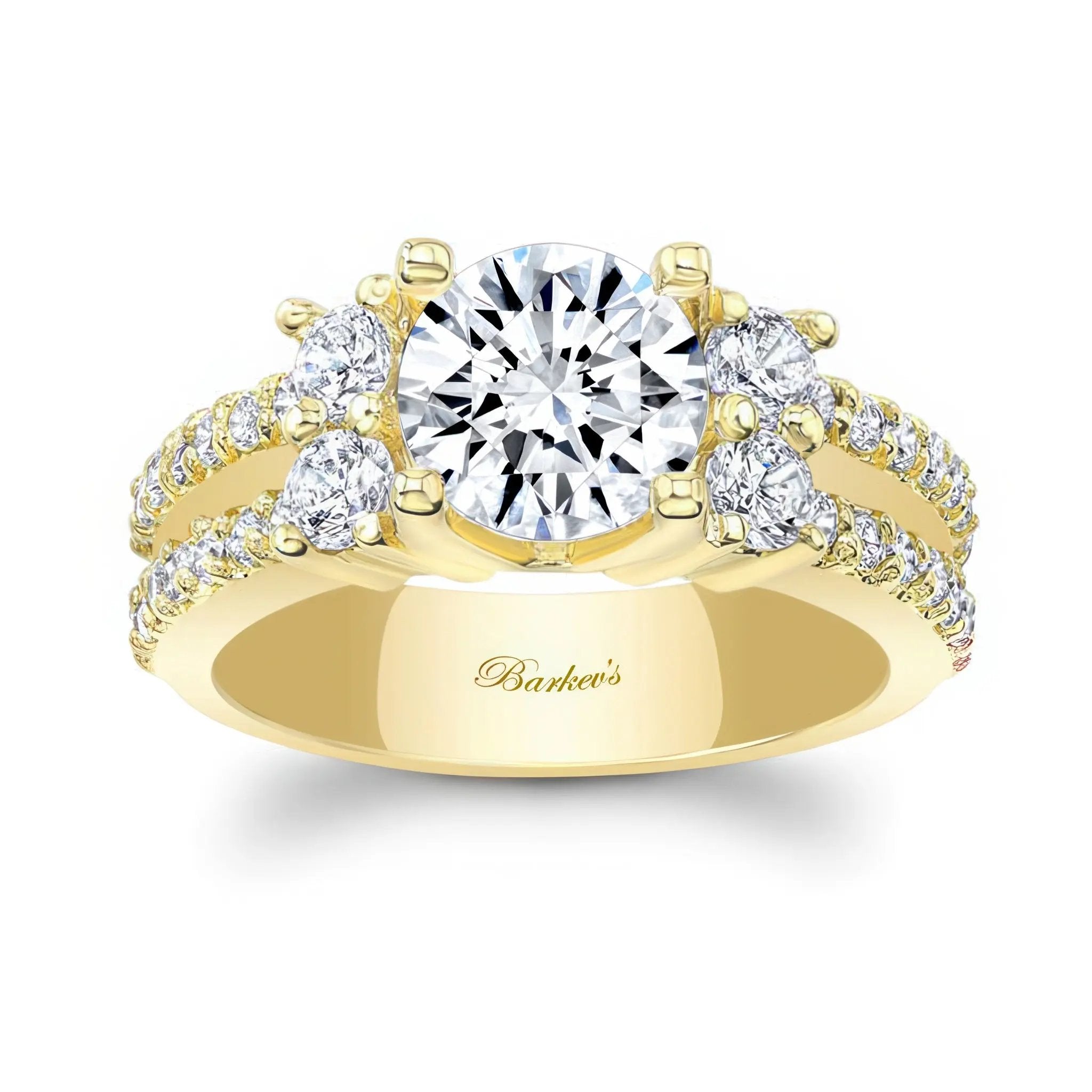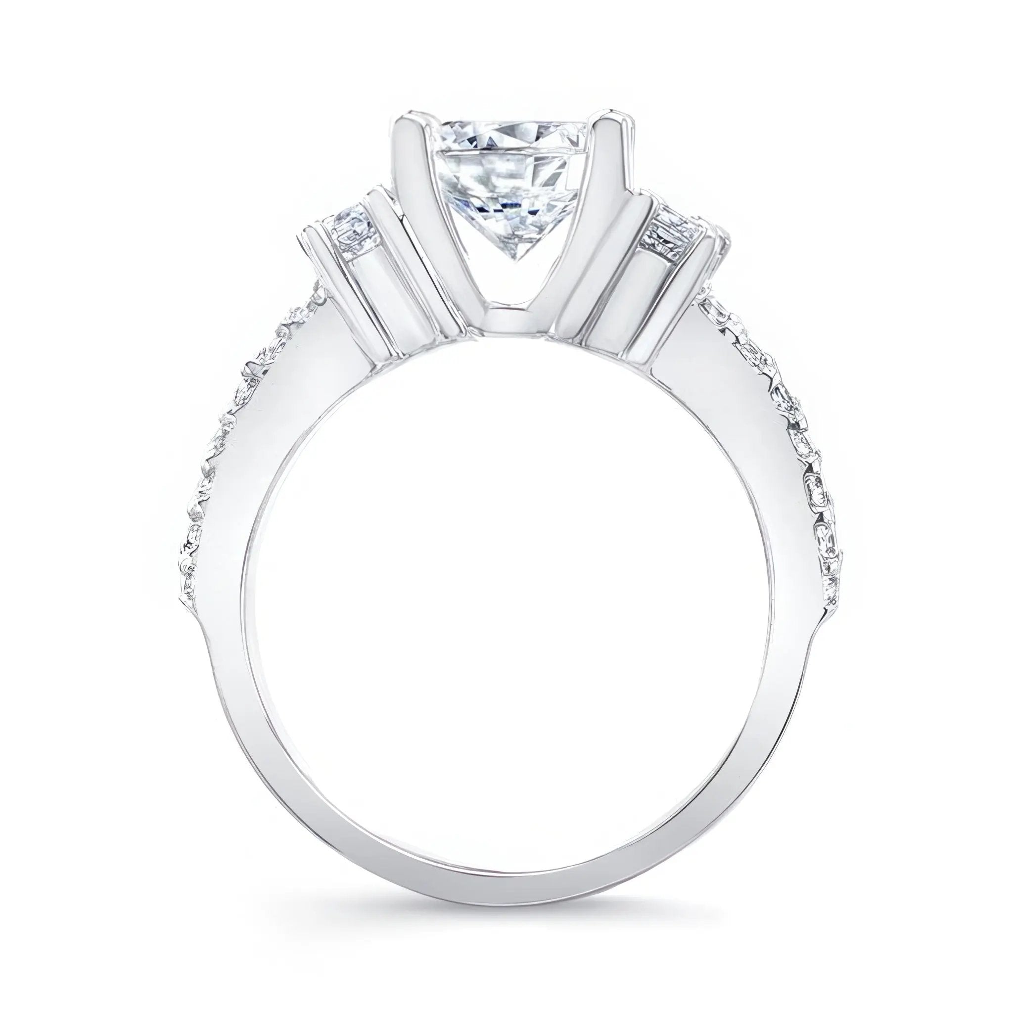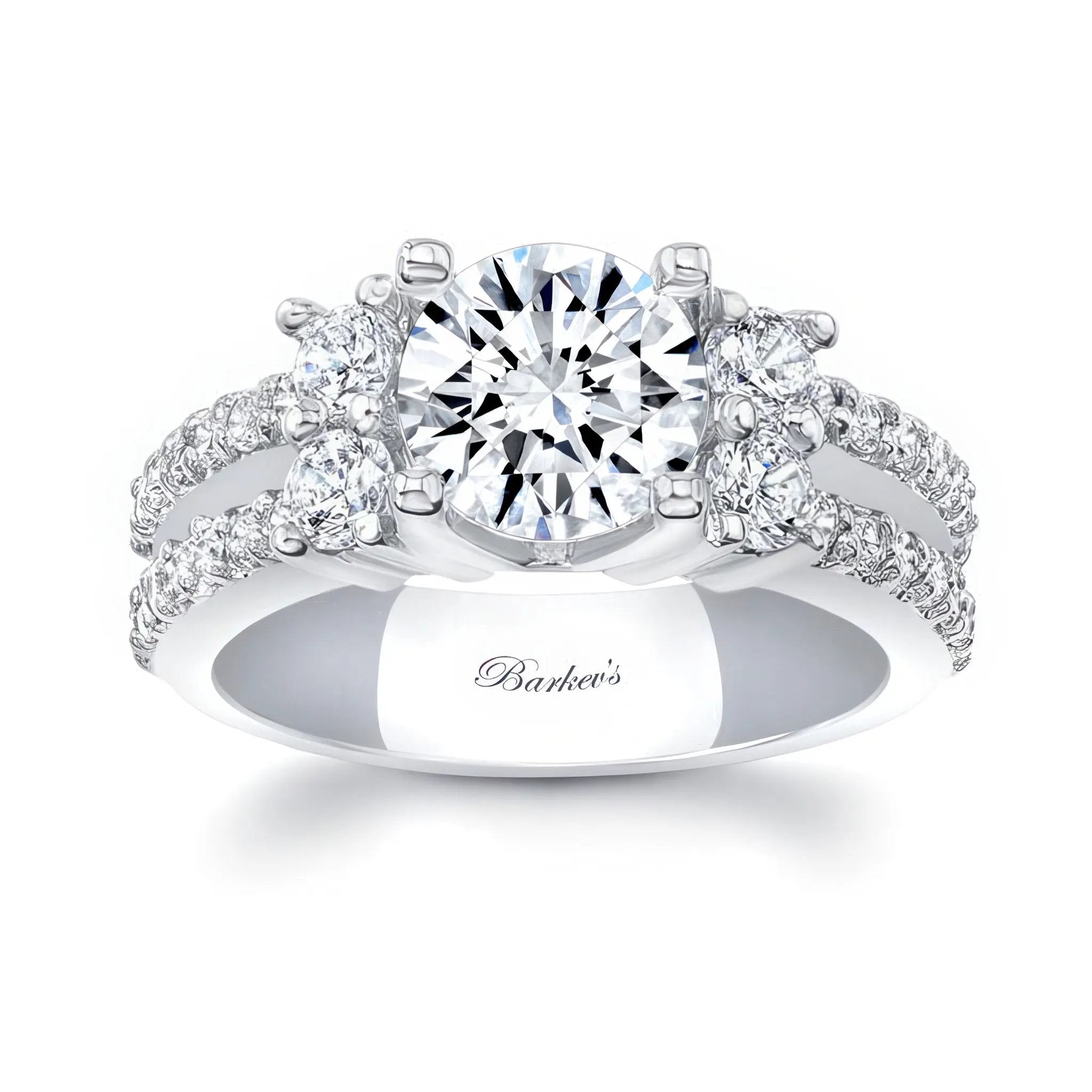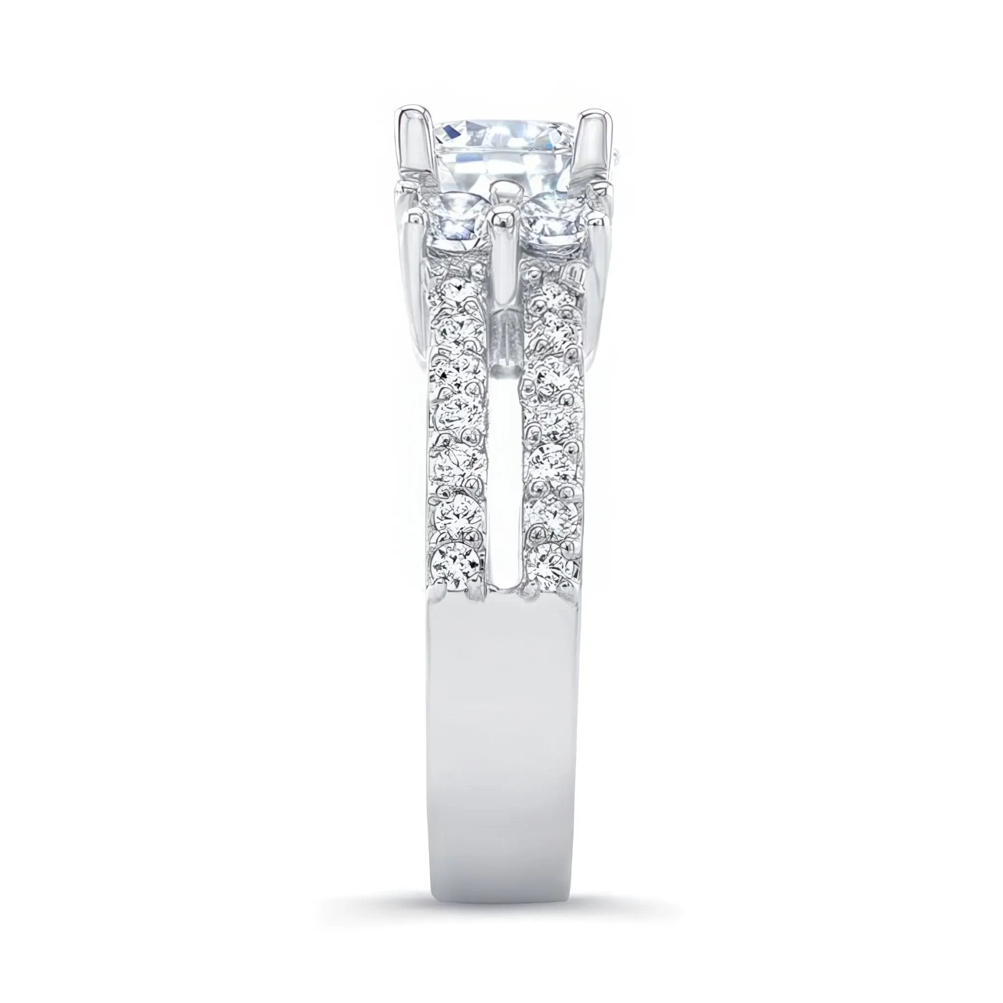 A unique 4 stone diamond ring featuring a round center framed by smaller diamonds on each side and a split shank adorned with shared prong set diamonds.