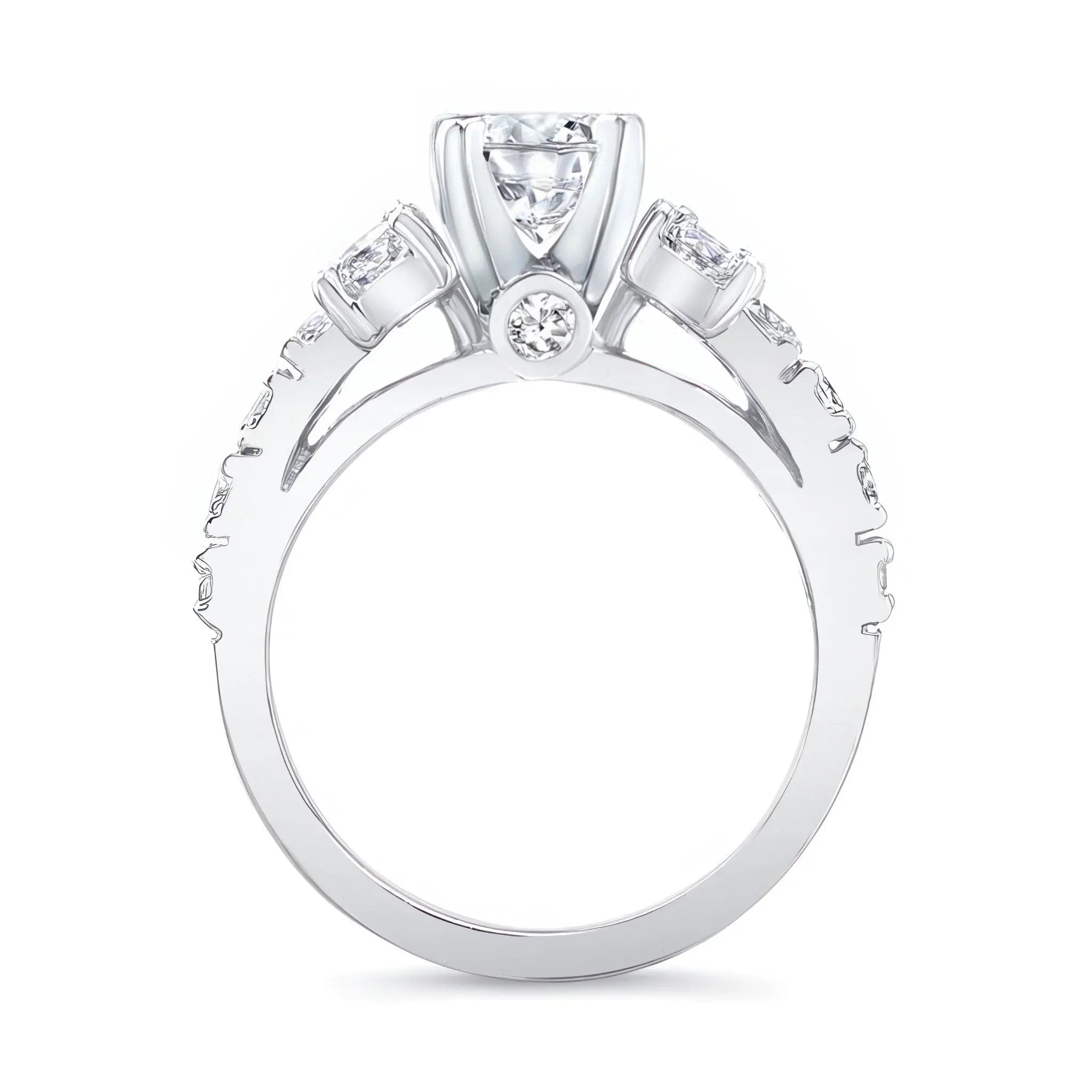 An elegantly unique diamond ring featuring a round center that's framed by two smaller diamonds on each side while other melees continue along the shank gradually decreasing in size. The profile view also features a surprise bezel set diamond for a truly stunning look.