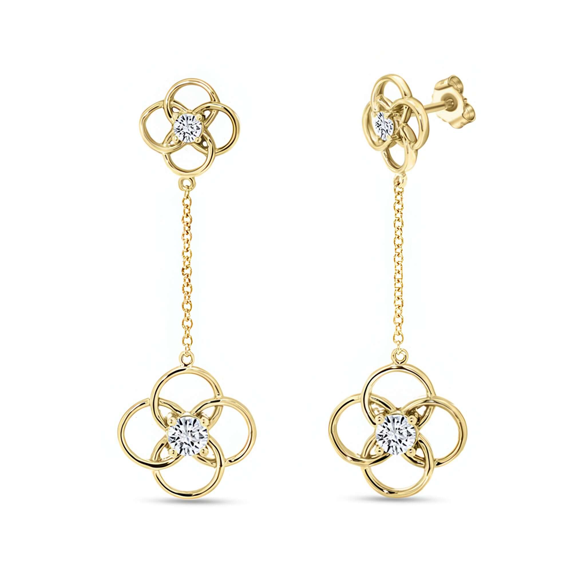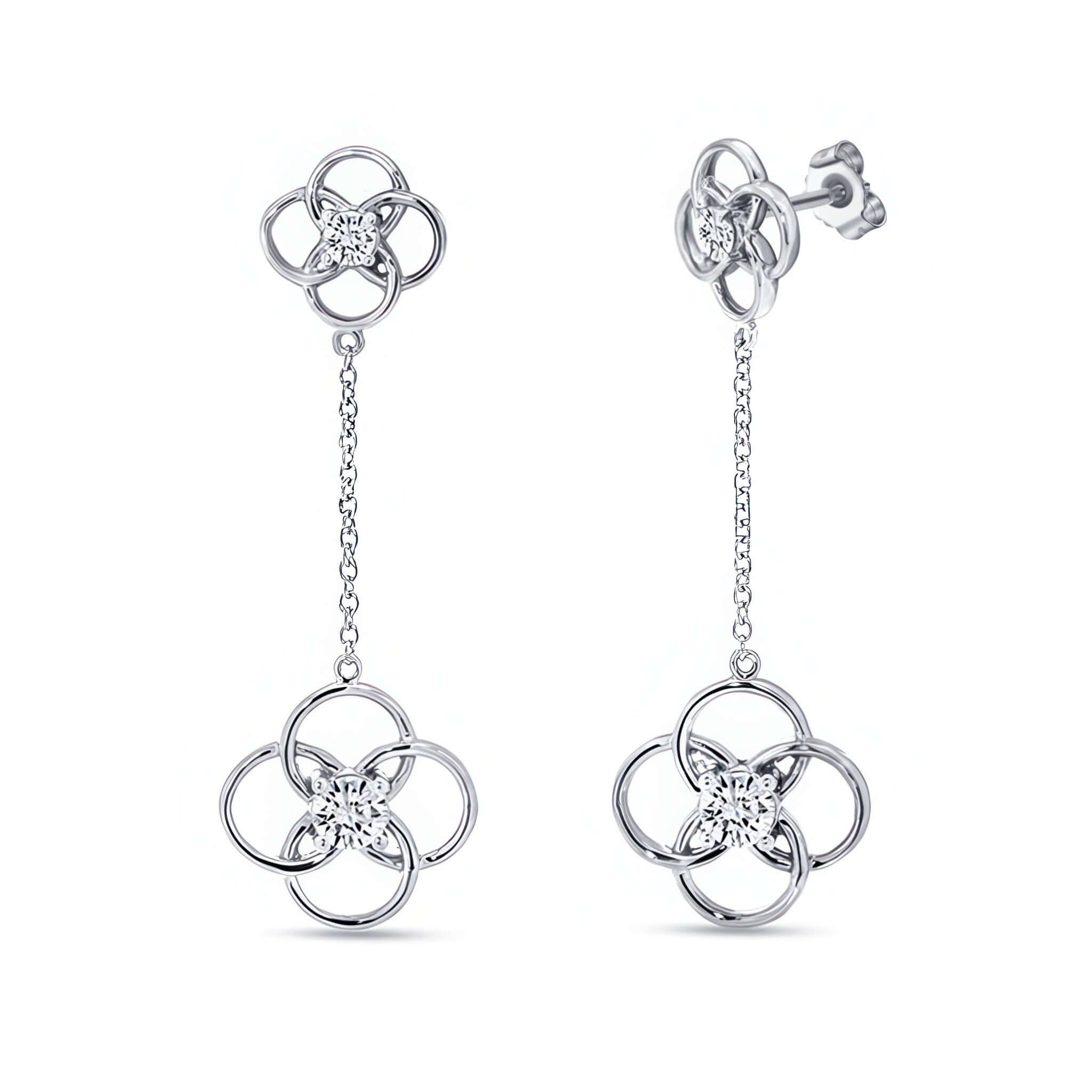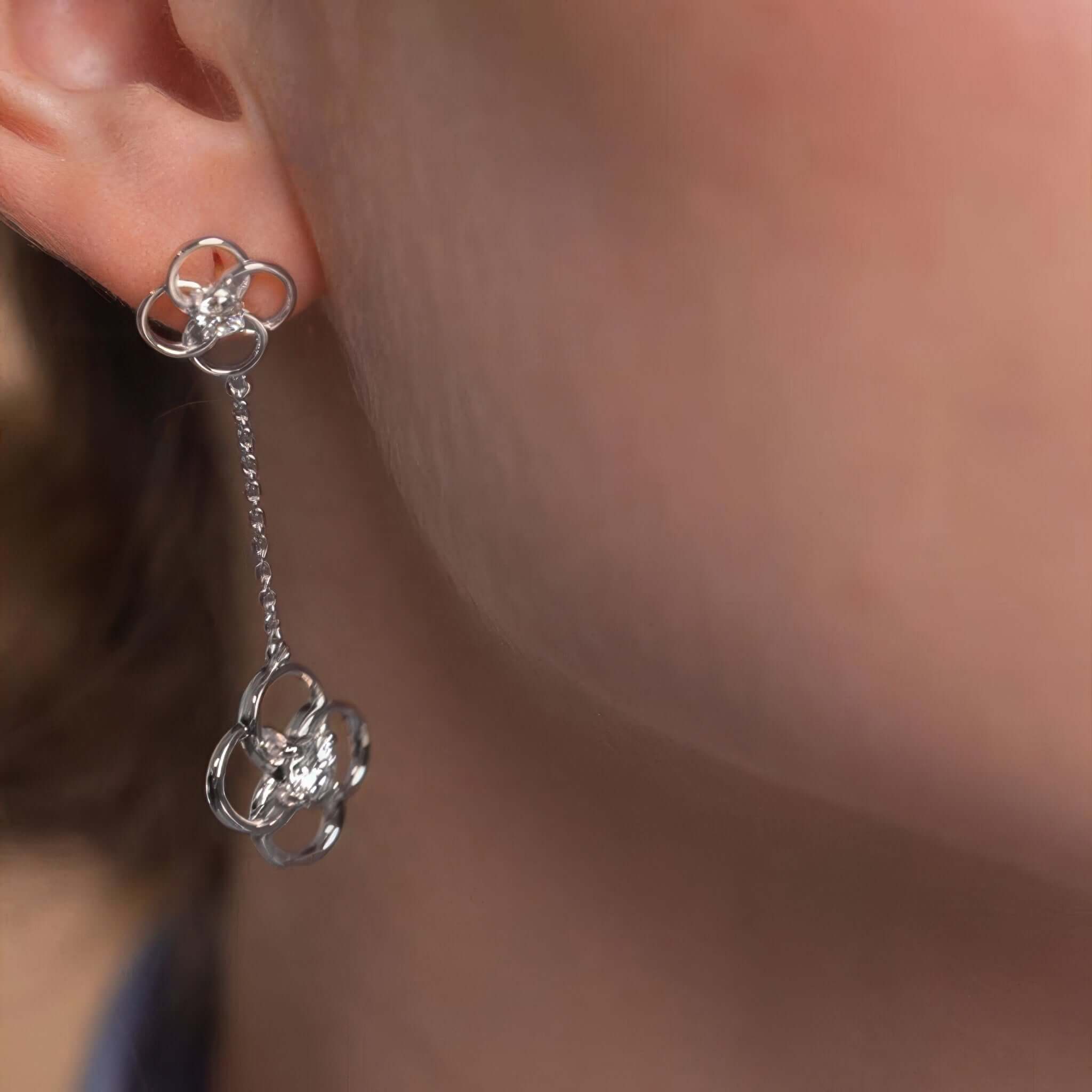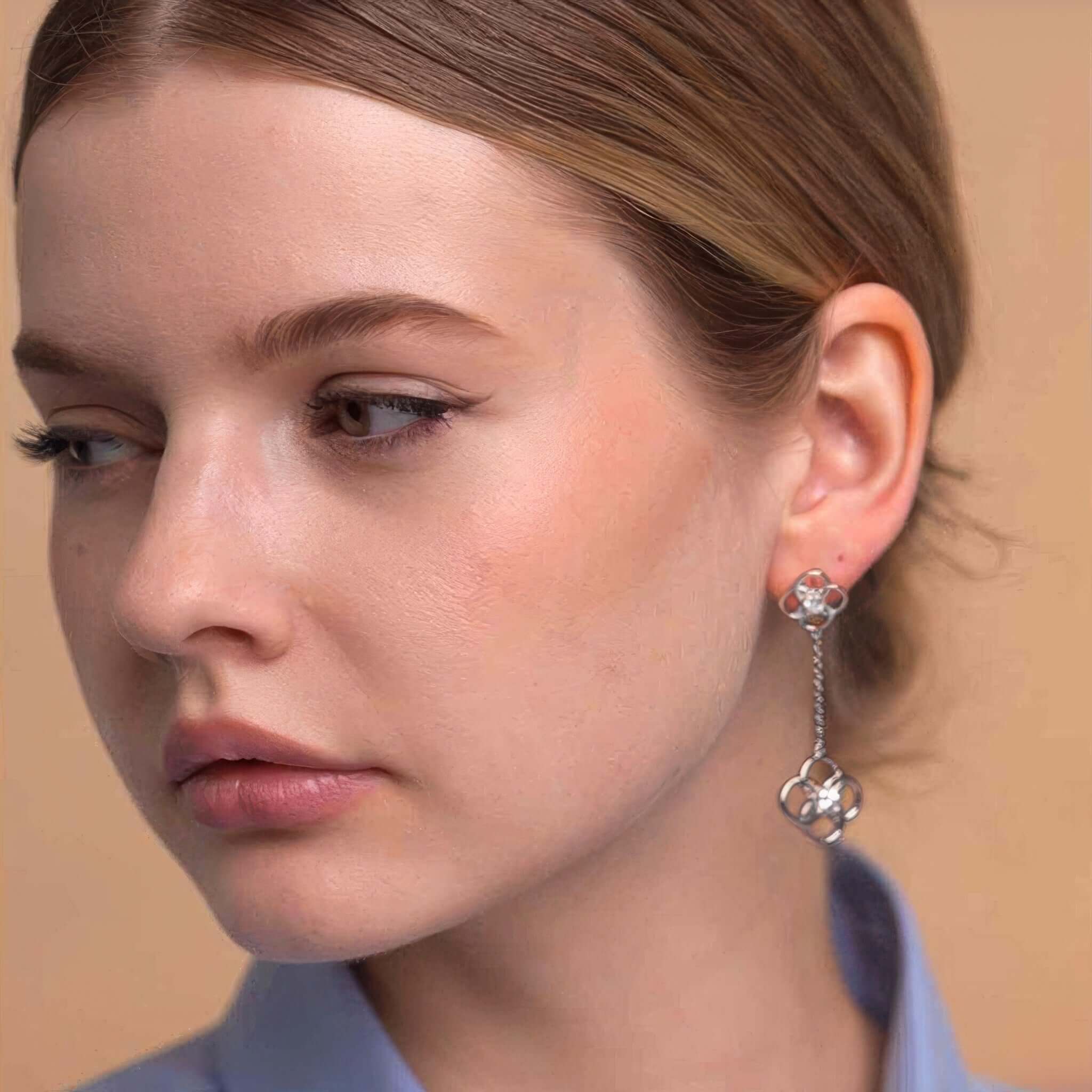 Elevate your elegance with these captivating moissanite dangle earrings. Featuring a floral inspired design, each earring boasts two sparkling moissanites, a 0.25 carat moissanite adorning the top and a 0.50 carat moissanite at the bottom totaling an impressive 1.50 carats for the pair. The intricate open petal motif is delicately suspended on a fine chain, adding graceful movement and charm.