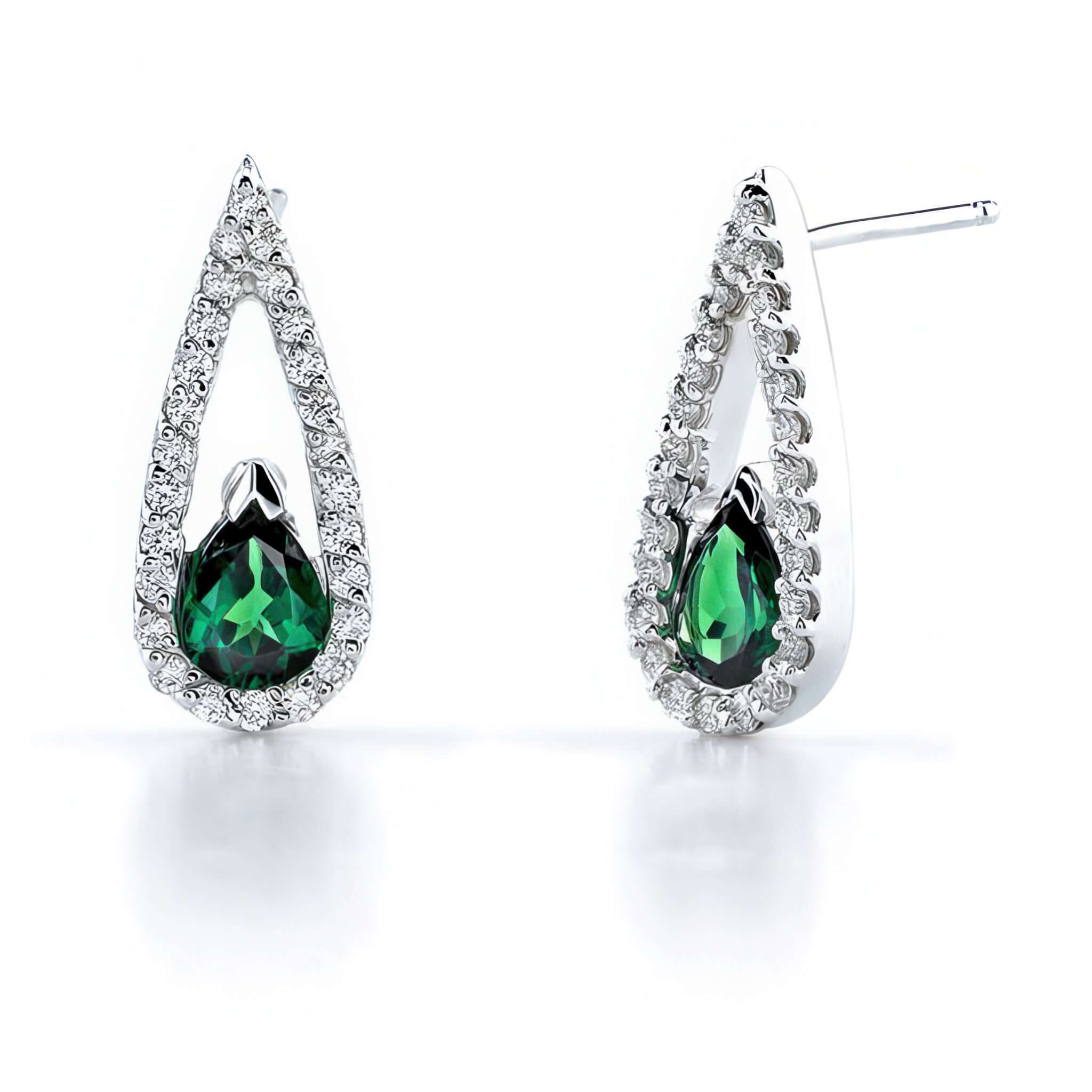 Tsavorite and diamond earrings, featuring a prong set pear shape tsavorite encircled in a pear shape open frame set with shared prong set diamonds for an elegant look.
