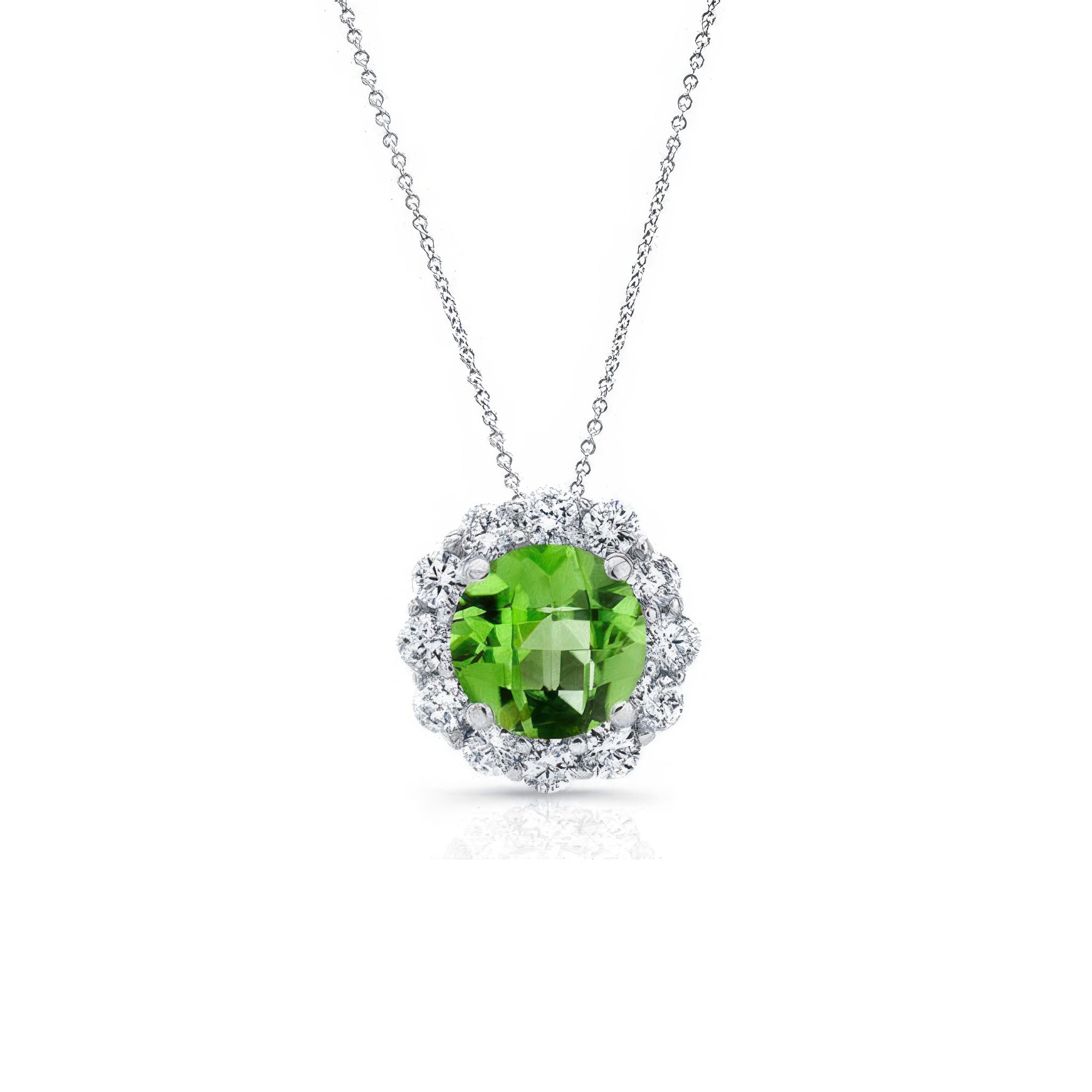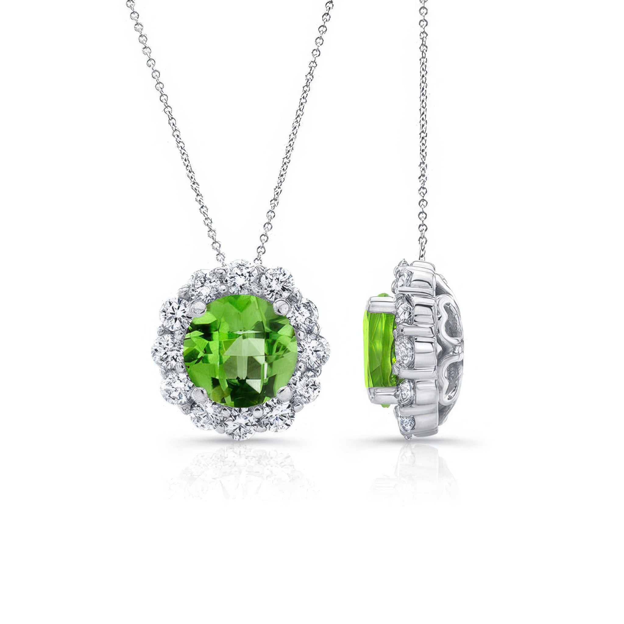 A stunning peridot and diamond halo necklace featuring a prong set half carat round peridot center adorned with a halo of shared prong set diamonds for a touch of sophistication.