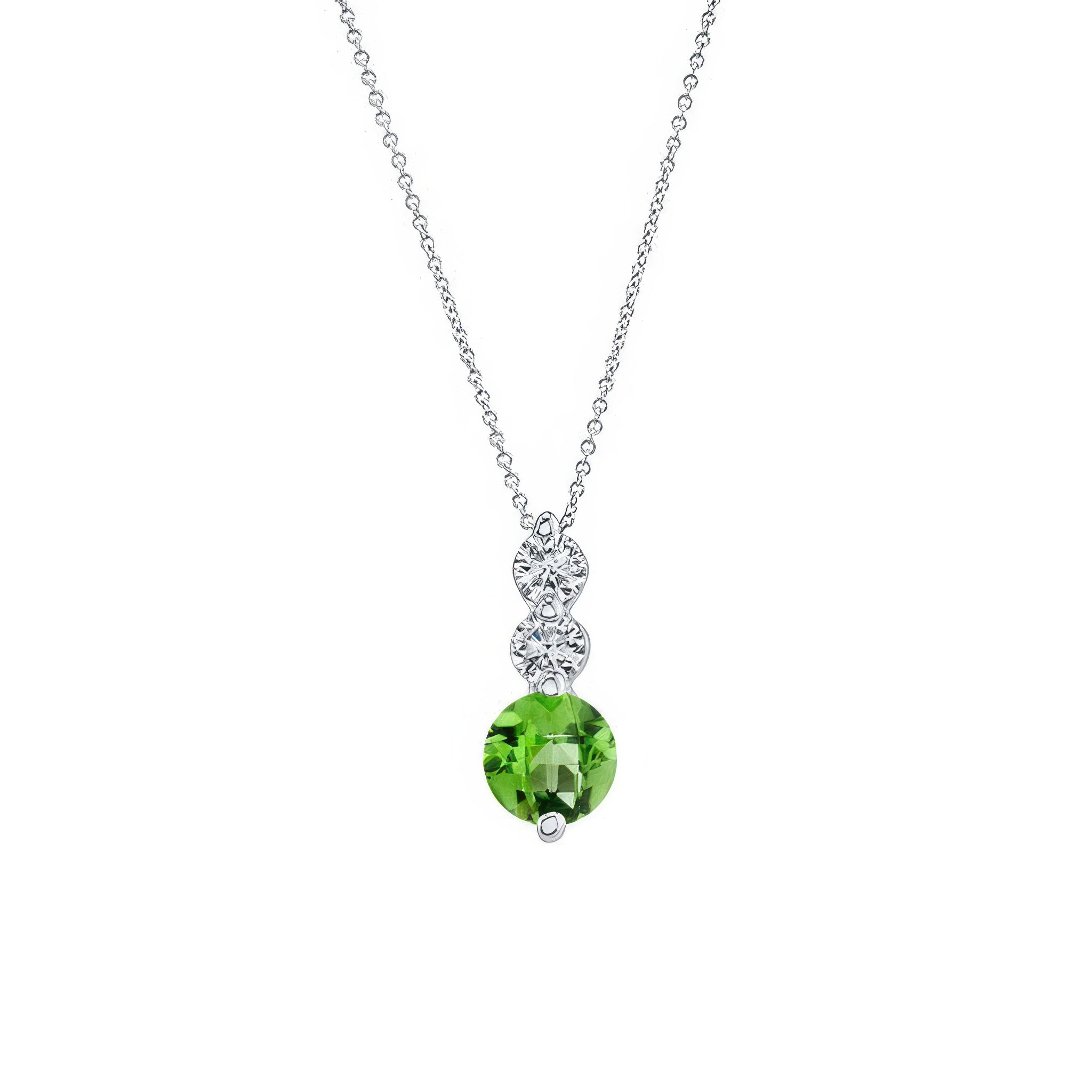 This beautiful peridot and diamond necklace features shared prong set diamonds for a sparkling look.