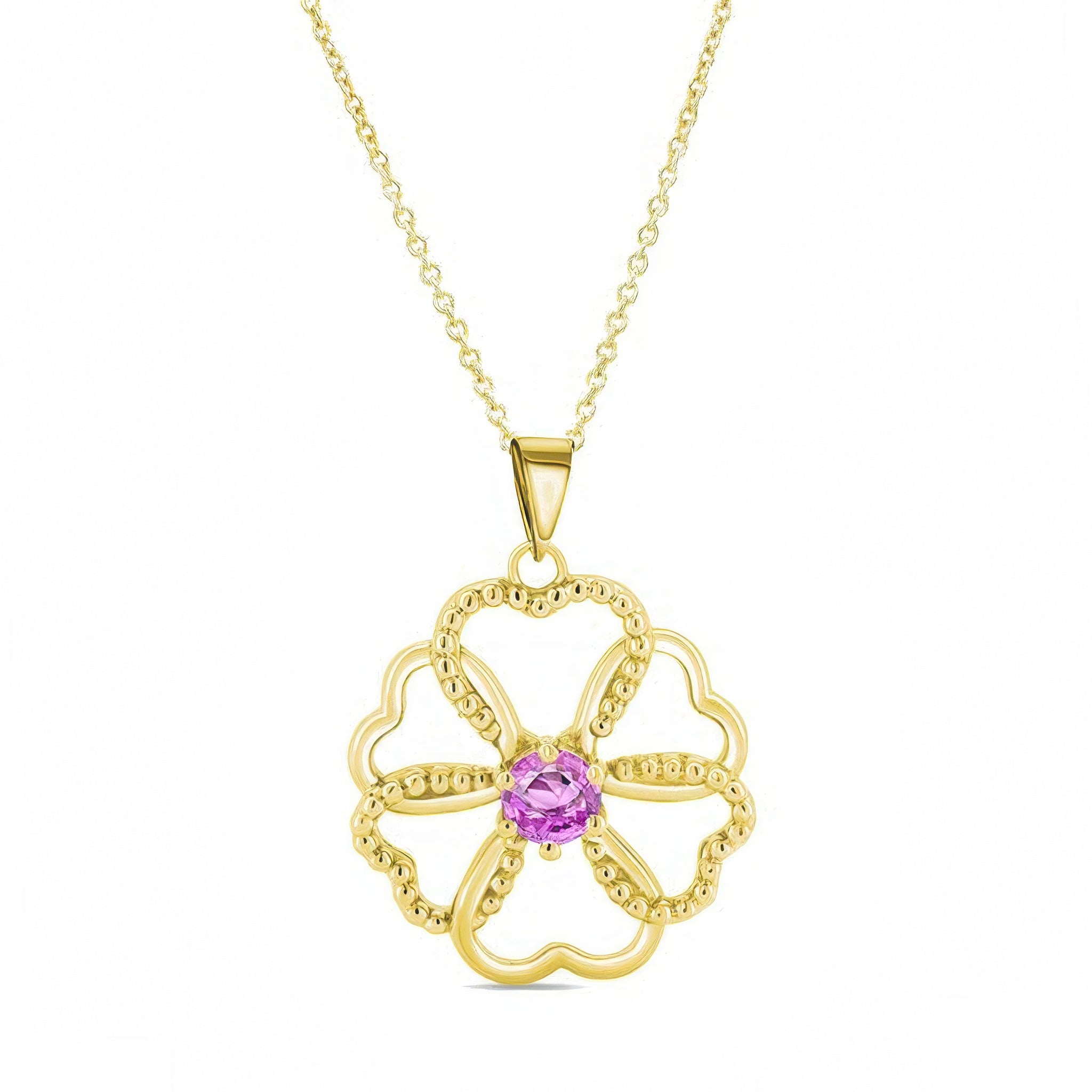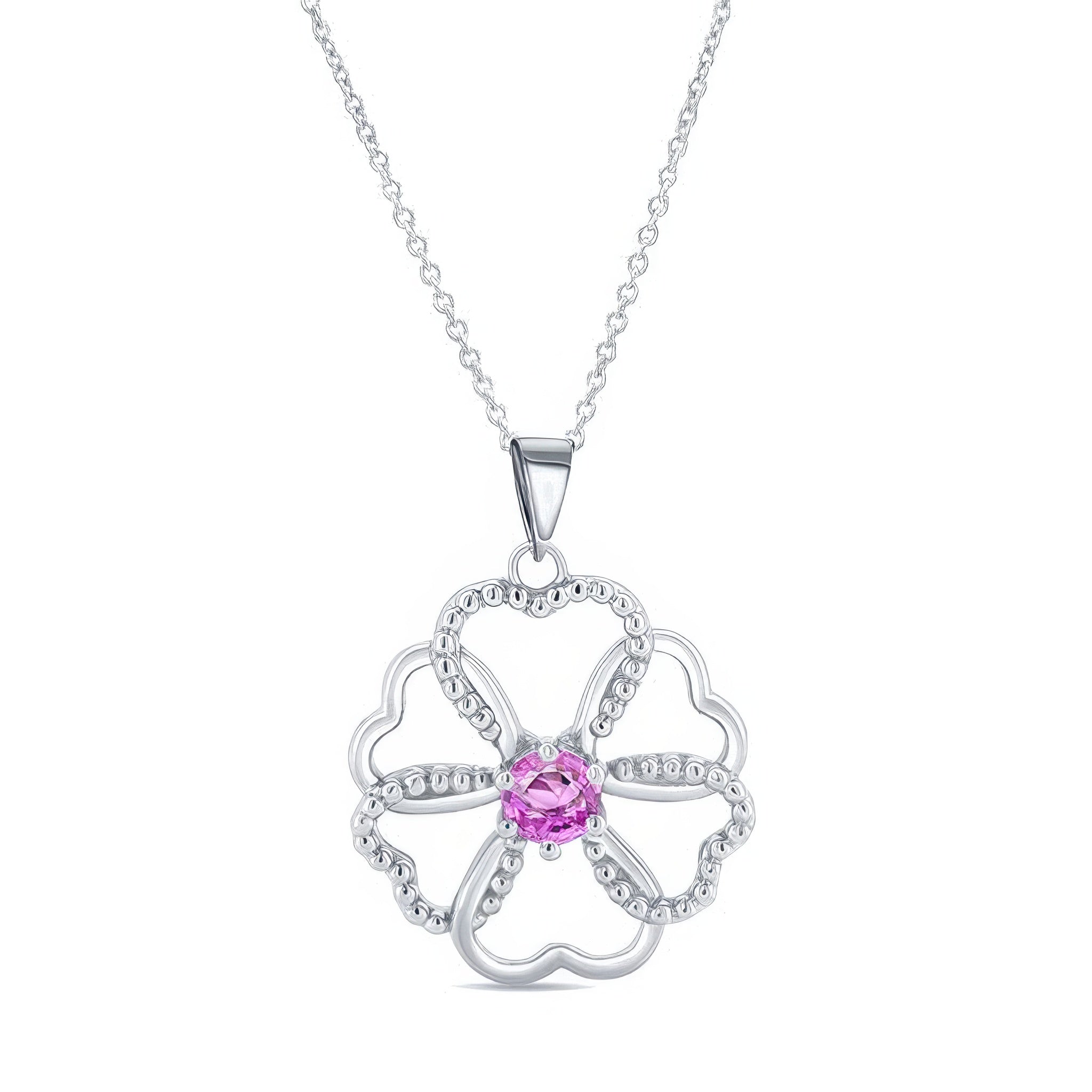 A beautiful pink sapphire intertwined hearts necklace featuring intertwined heart shapes and a half carat pink sapphire center.
