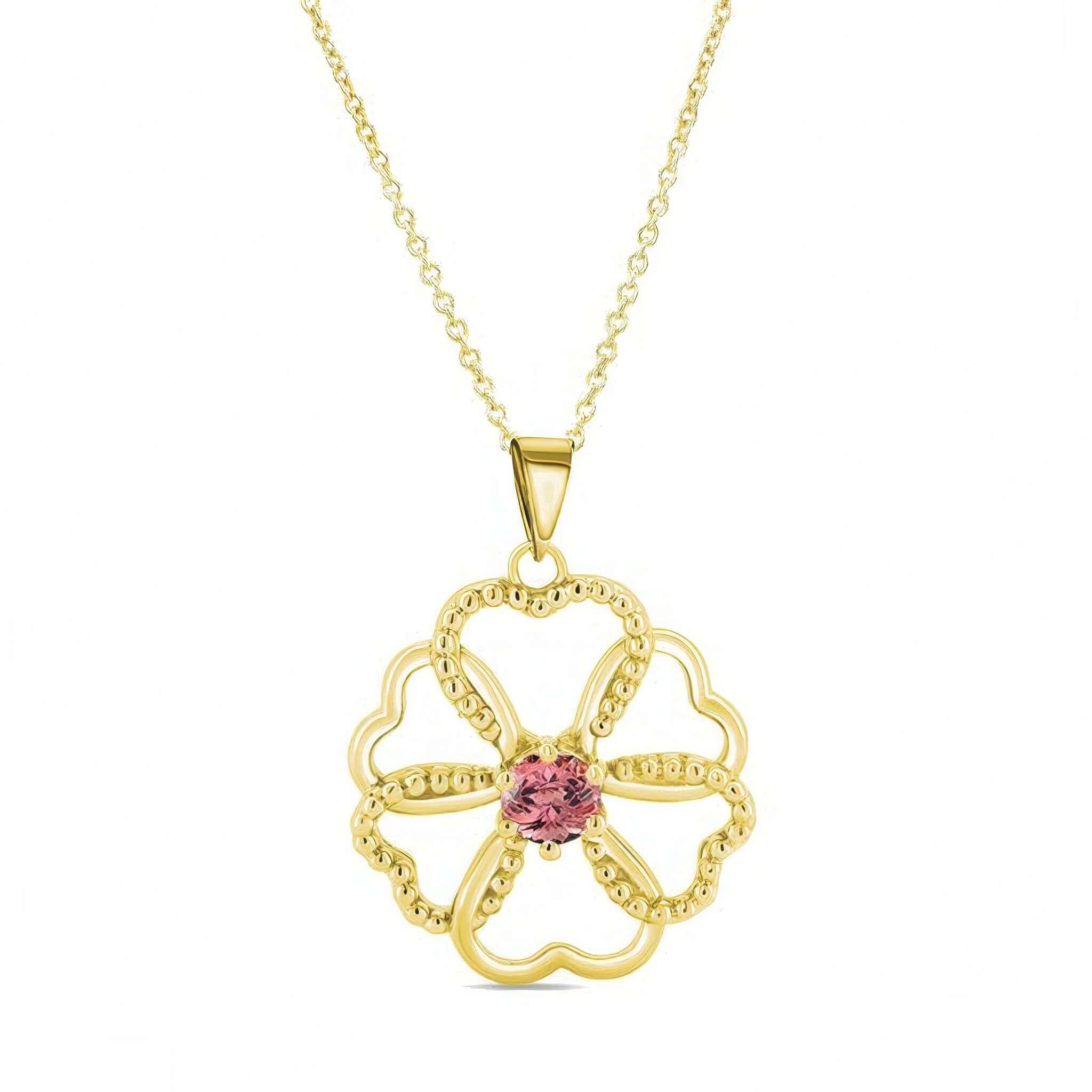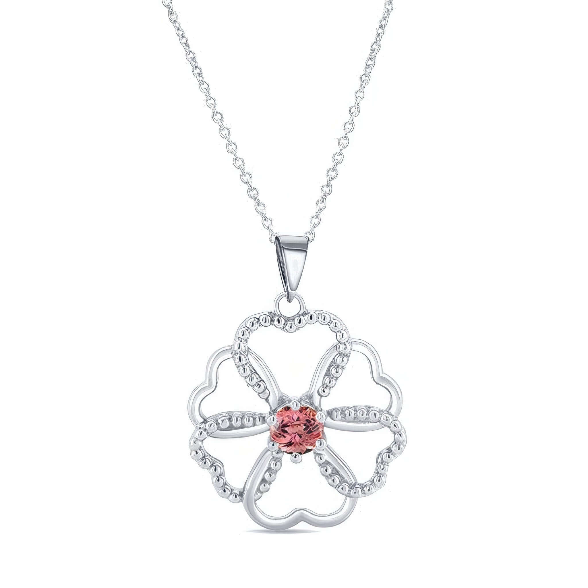 A beautiful pink tourmaline intertwined hearts necklace featuring intertwined heart shapes and a half carat pink tourmaline center.
