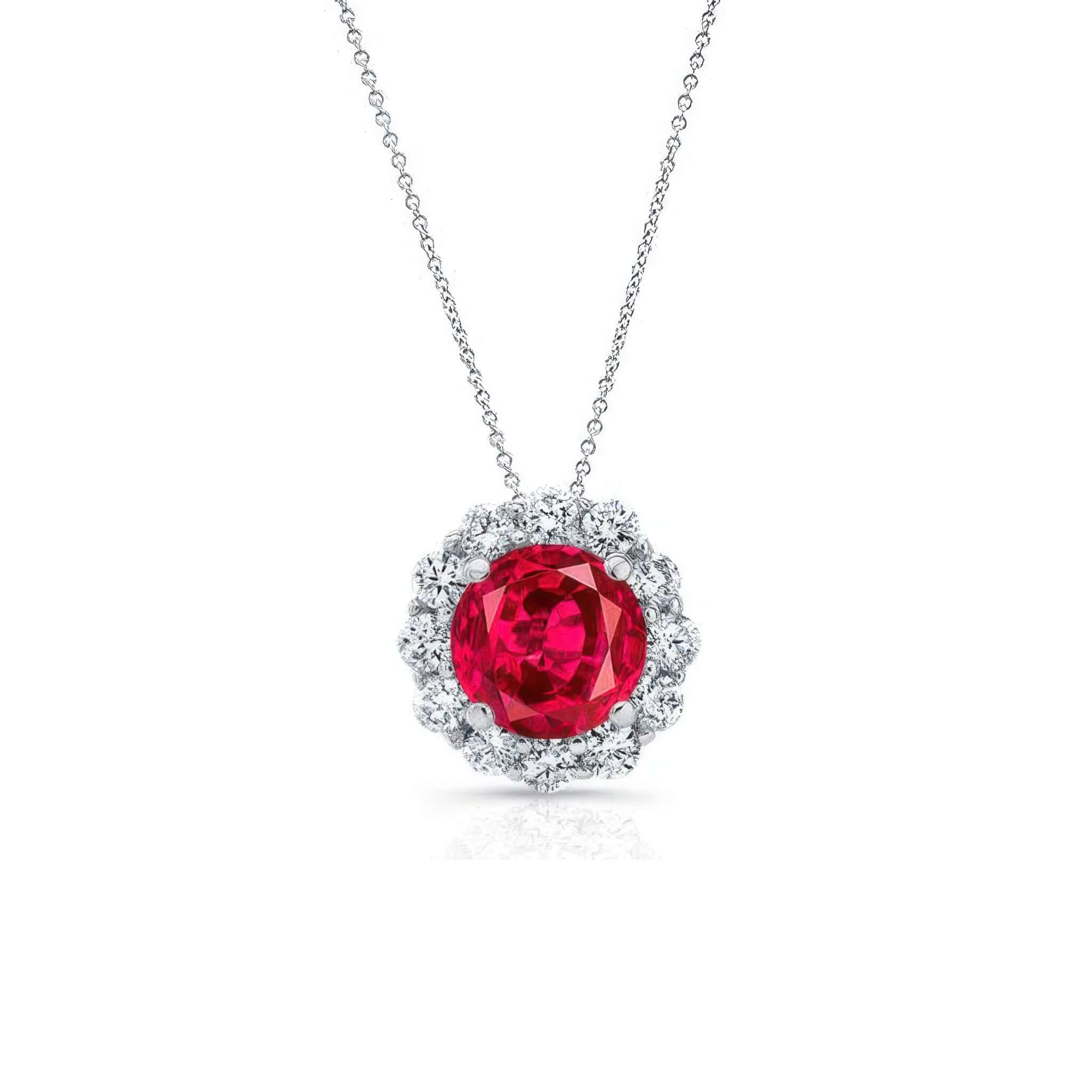 A stunning ruby and diamond halo necklace featuring a prong set half carat round ruby center adorned with a halo of shared prong set diamonds for a touch of sophistication.