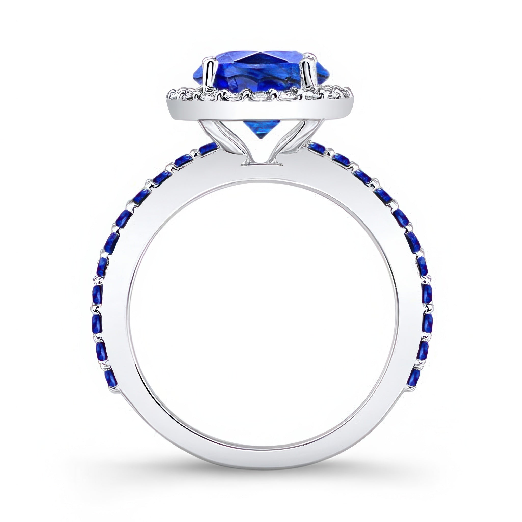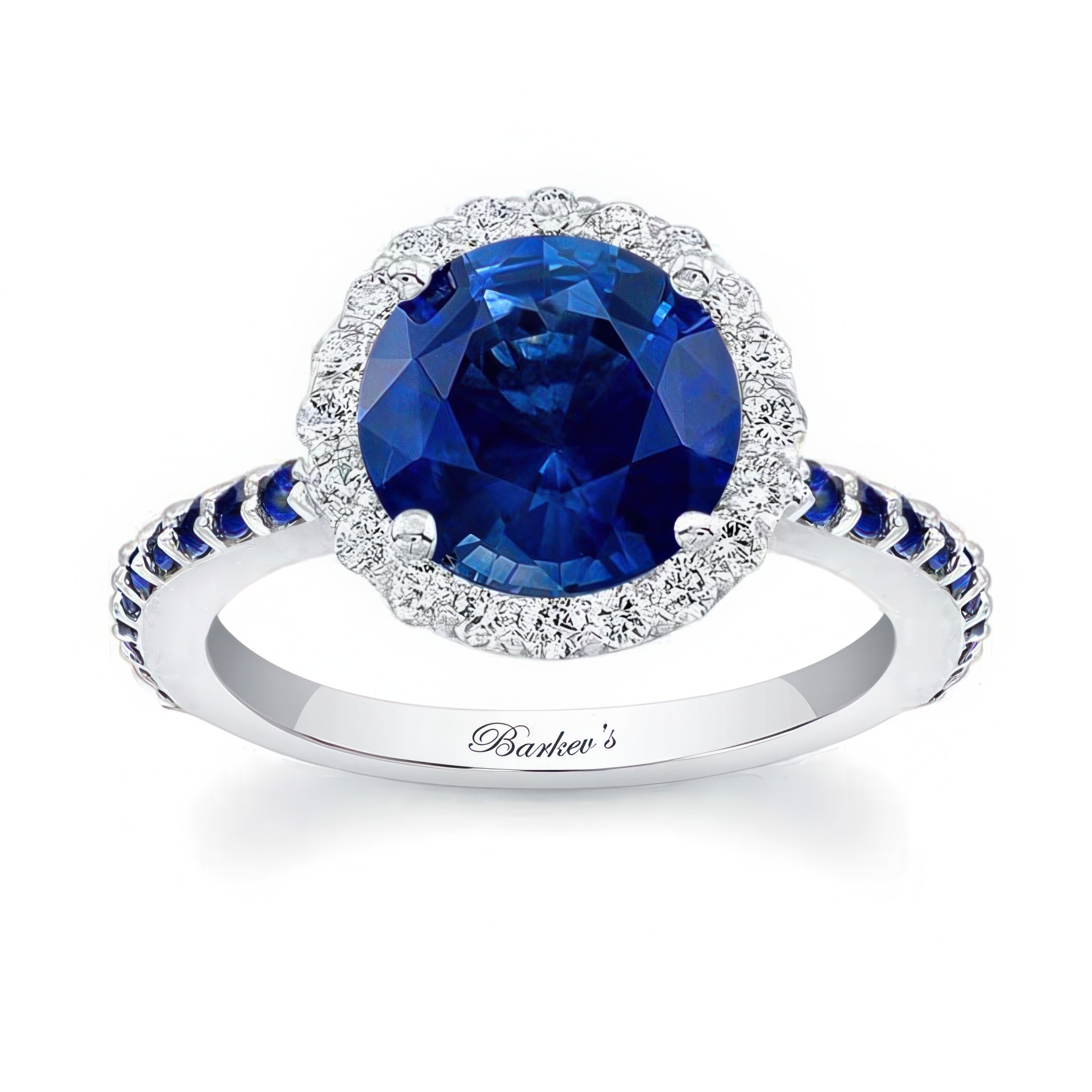 This 2 carat halo blue sapphire engagement ring features shared prong set diamonds around the center and blue sapphires cascading down the shank for a look of sheer elegance.
