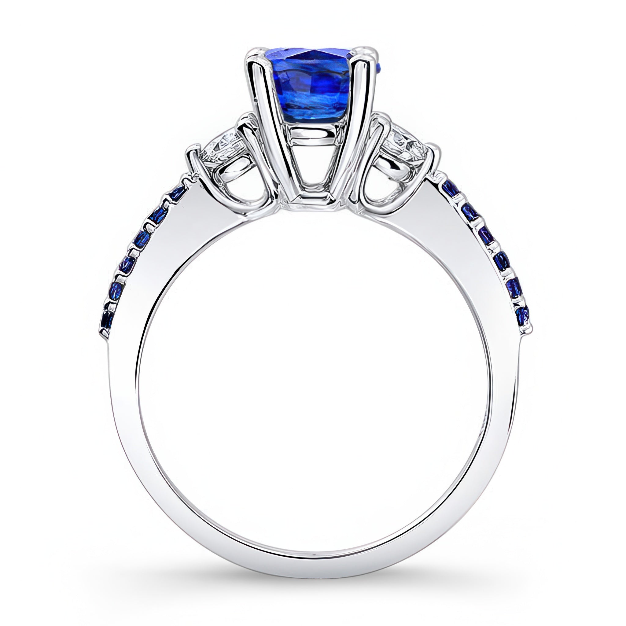 This 3 stone sapphire engagement ring features accent stones flanking the prong-set round center. The dainty shoulders are adorned with shared prong set melees adding the finishing touch of elegance to this ring.