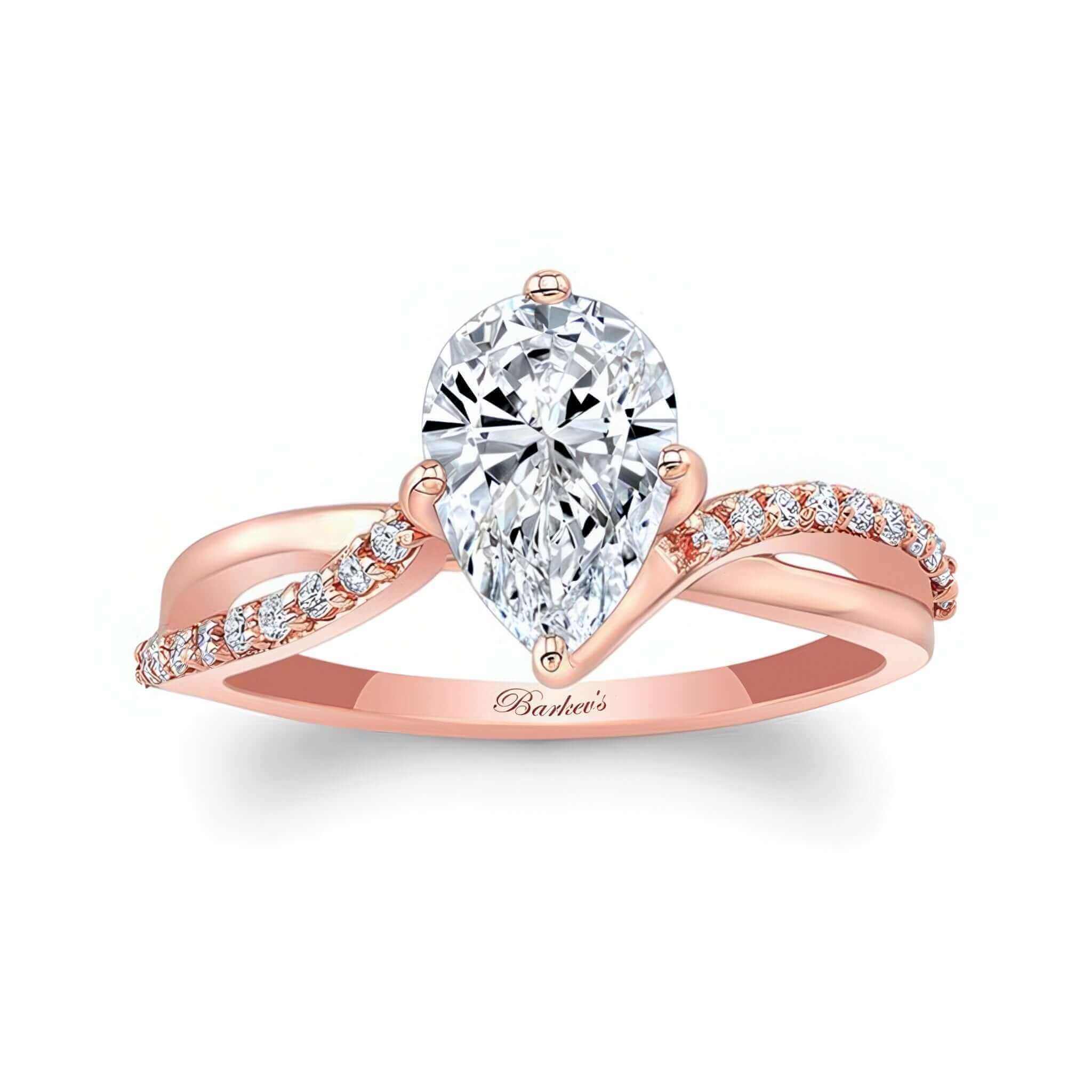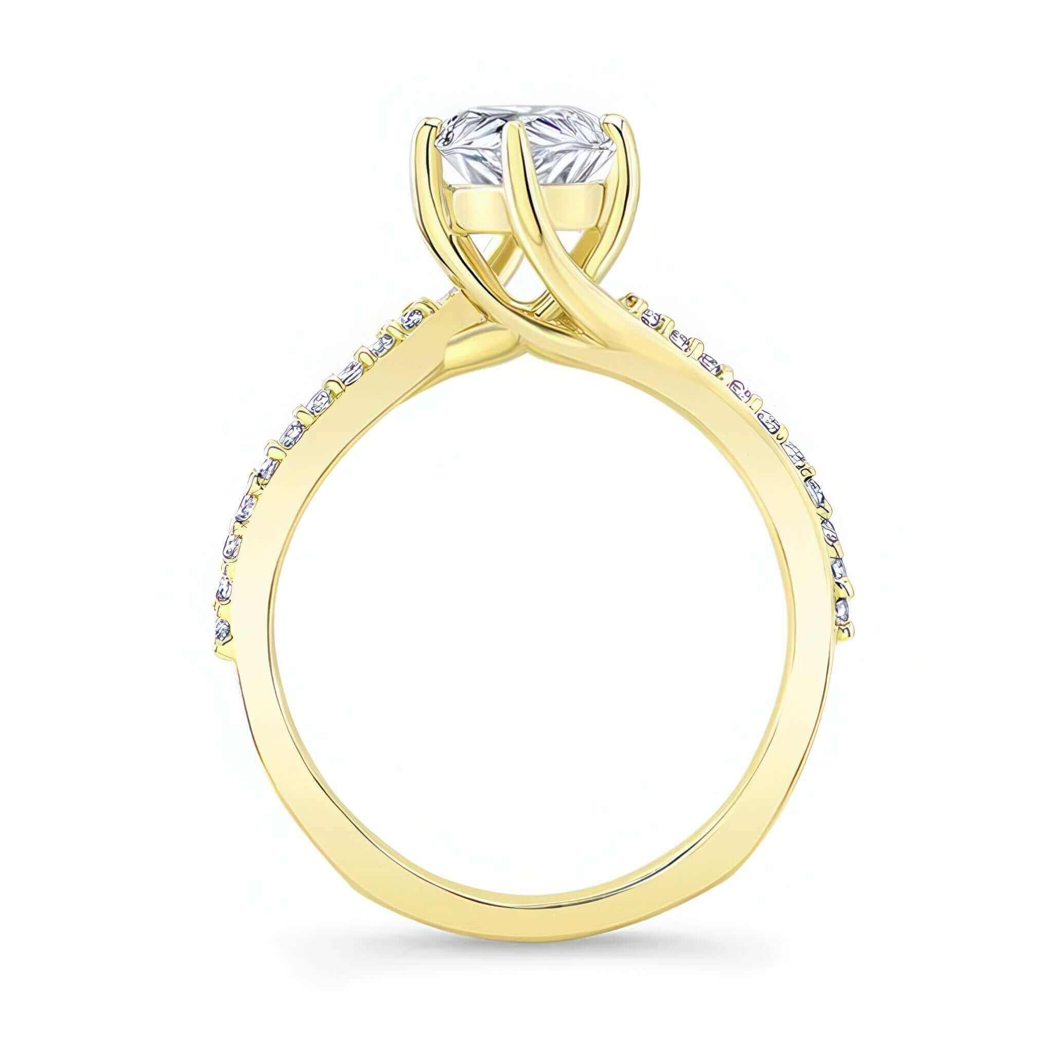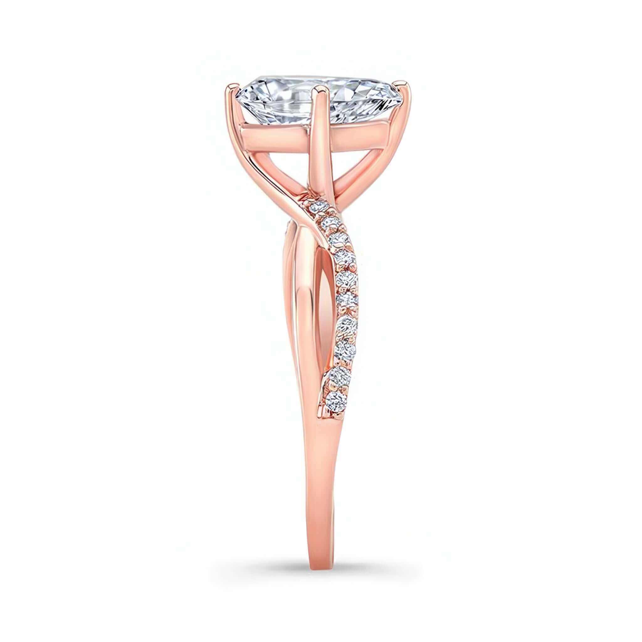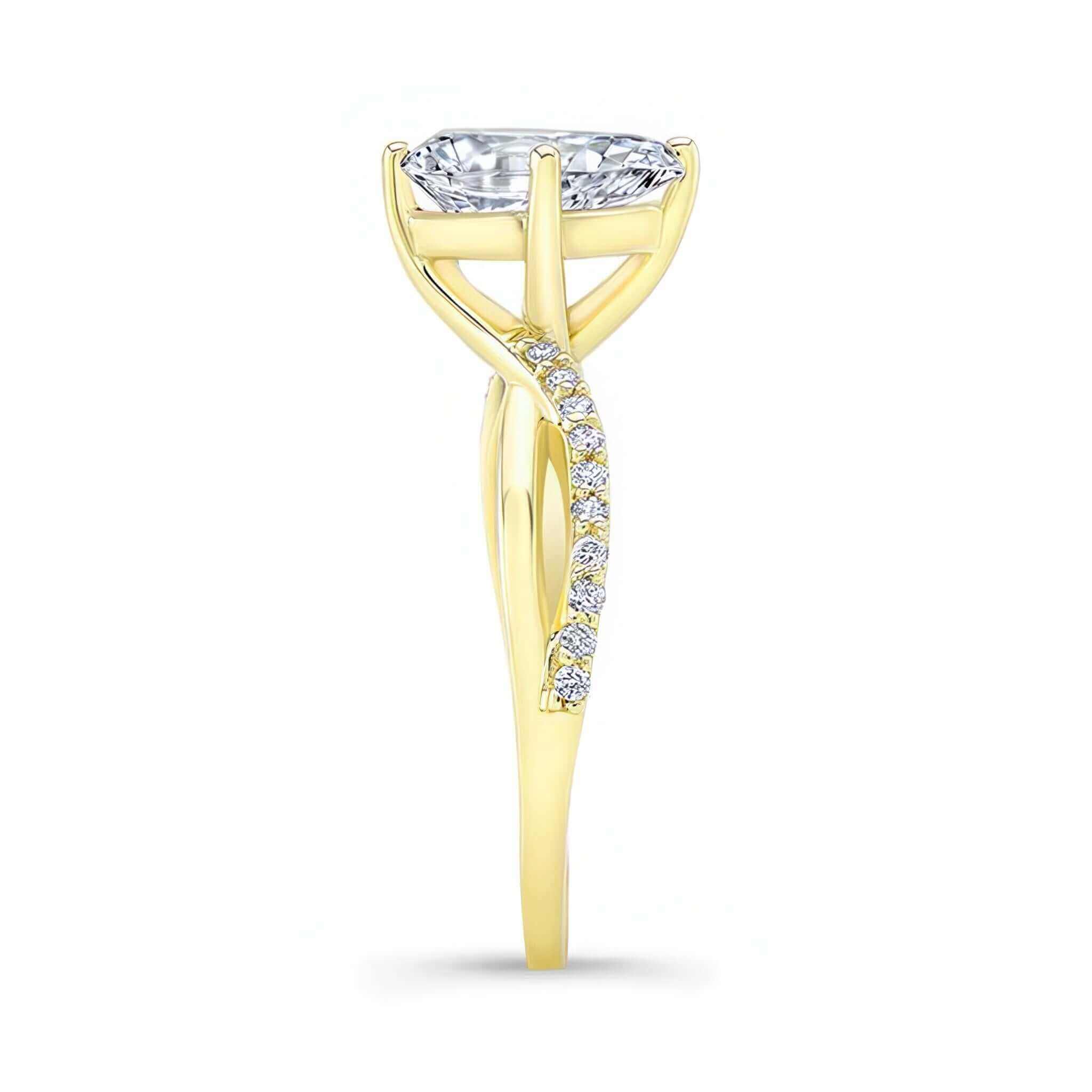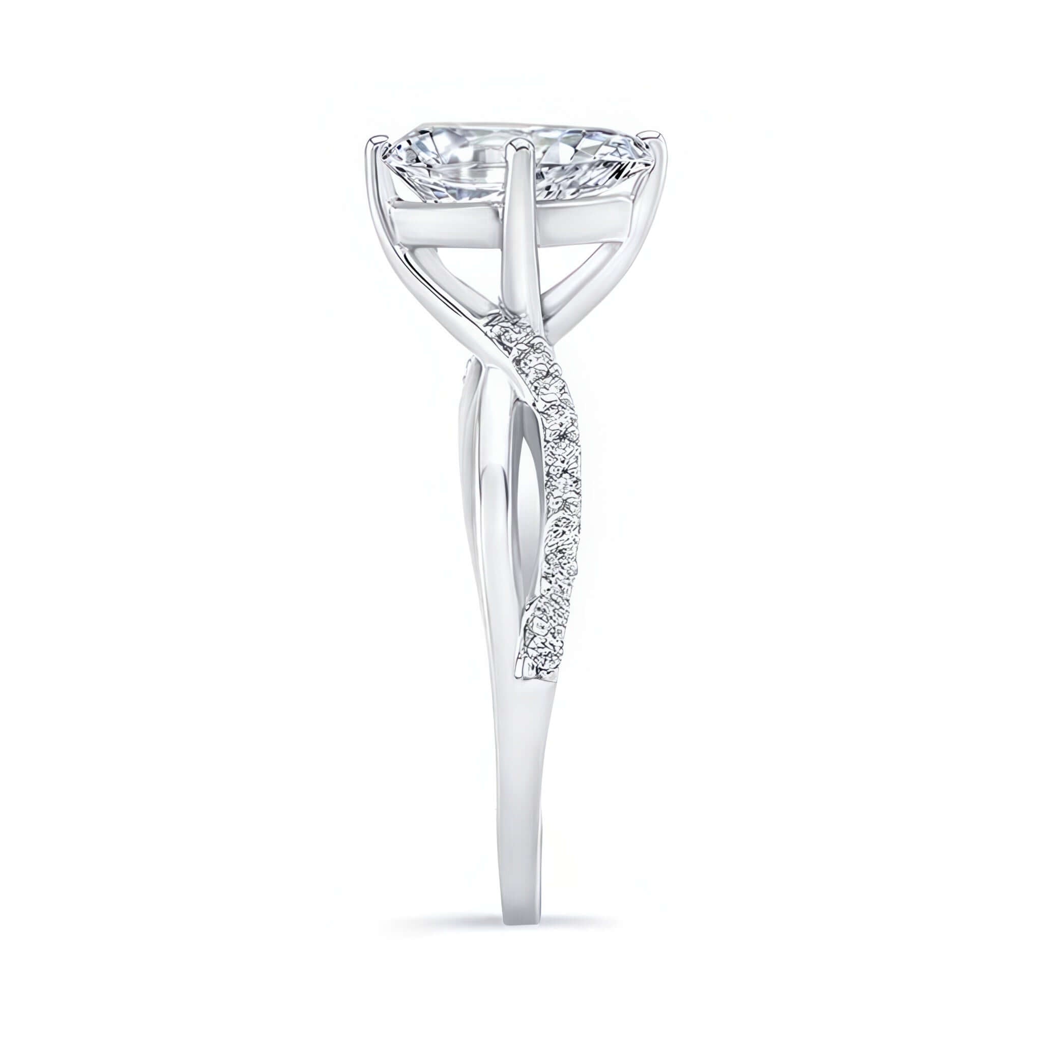 This pear shaped lab grown diamond engagement ring with twisted band features open curving shoulders sweeping up to create the prongs that hold the almond shaped center while the opposing sides of the shank are adorned with shared-prong set diamonds for a subtle sparkle that will draw the eye.
