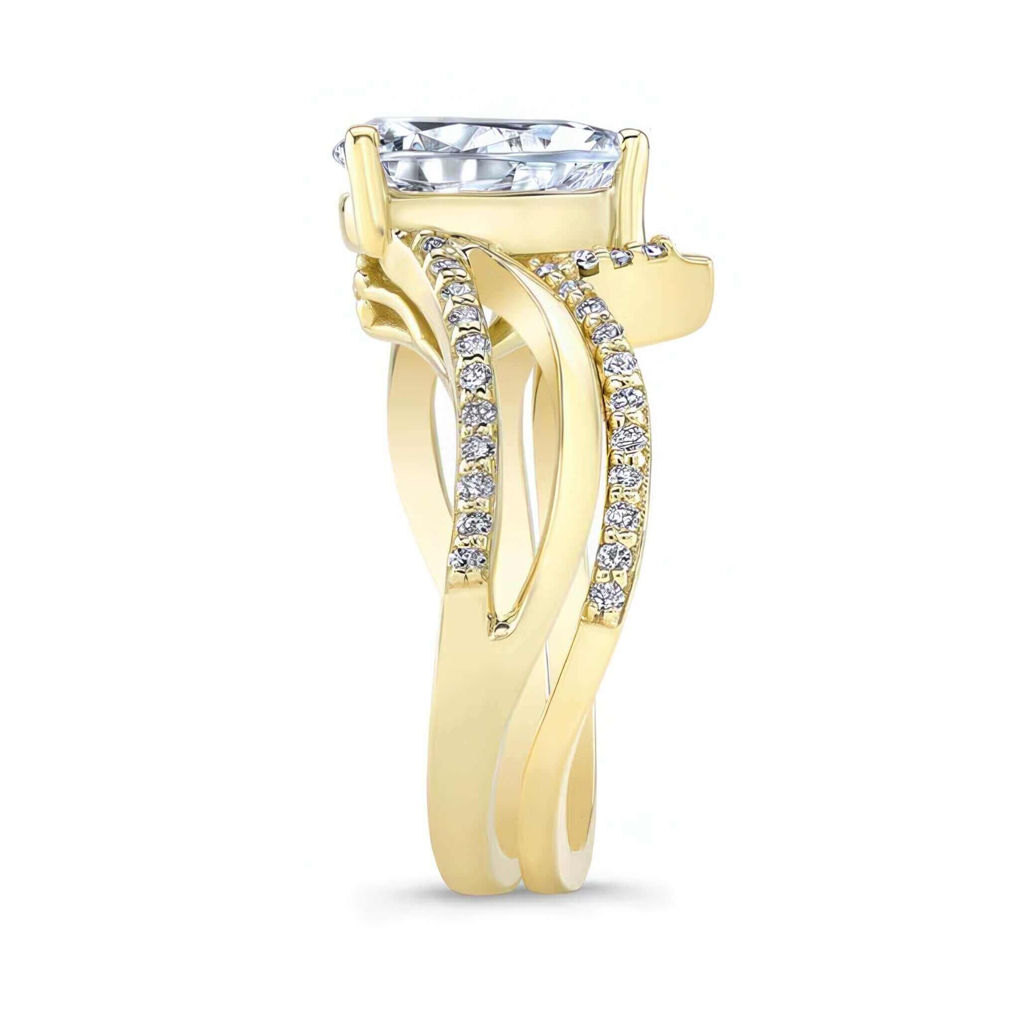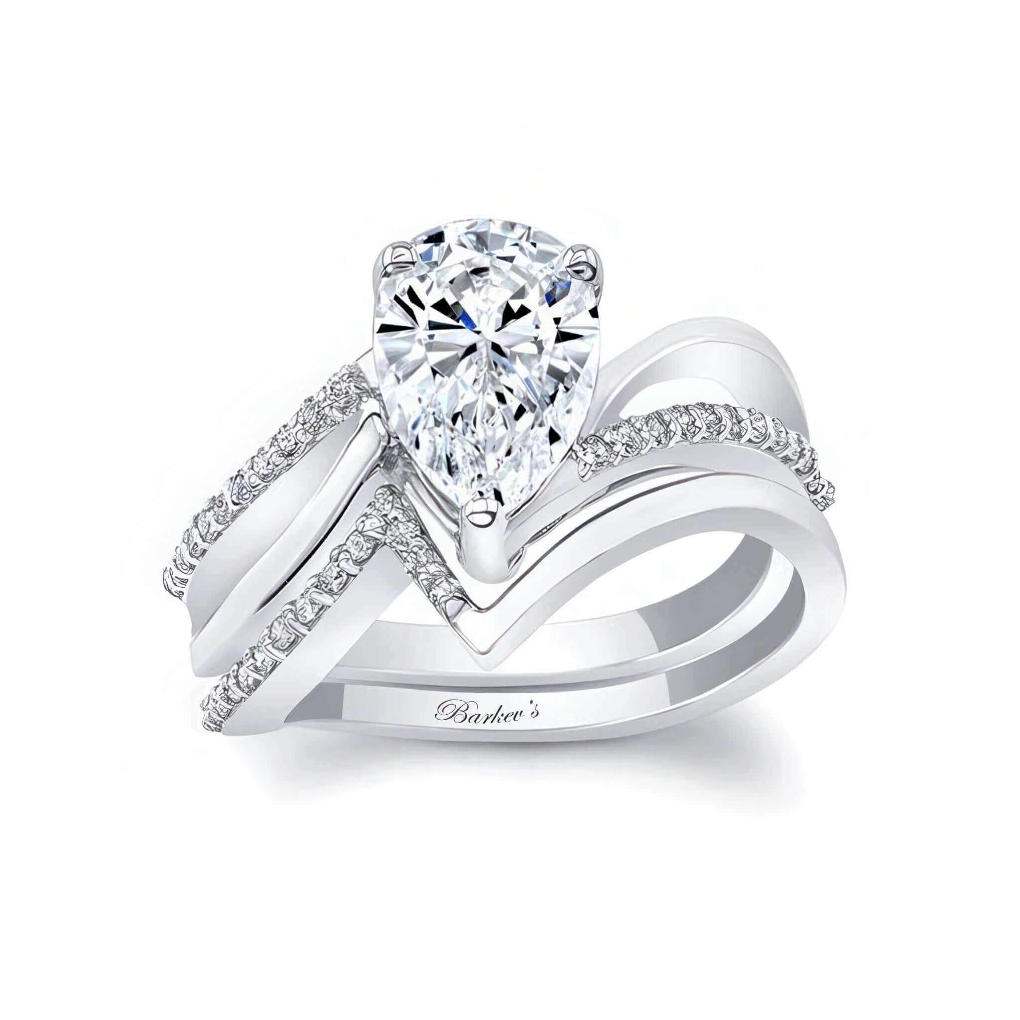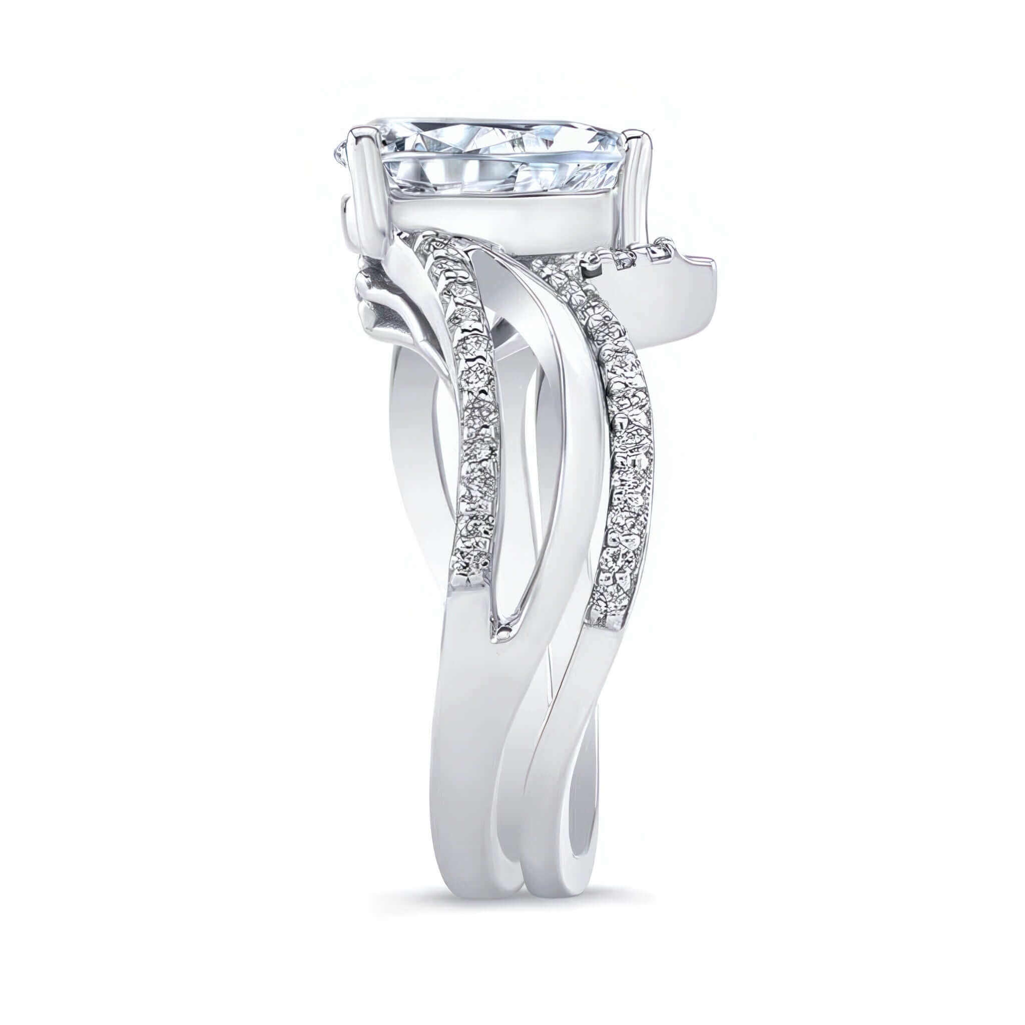 This split shank pear lab grown diamond bridal set features a center glorified by two graceful swirls, one of which is decorated by a row of prong set diamonds and a matching wedding band adding the final touch to its overall glamorous effect.
