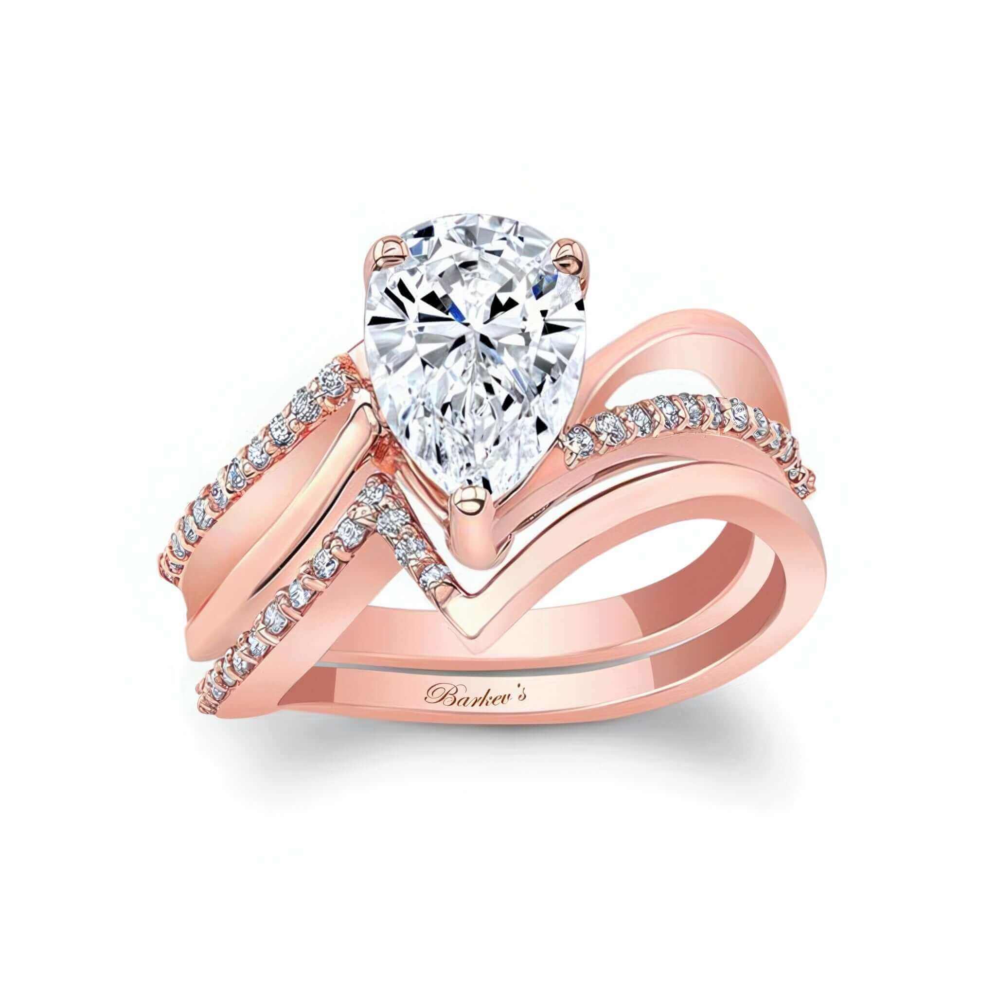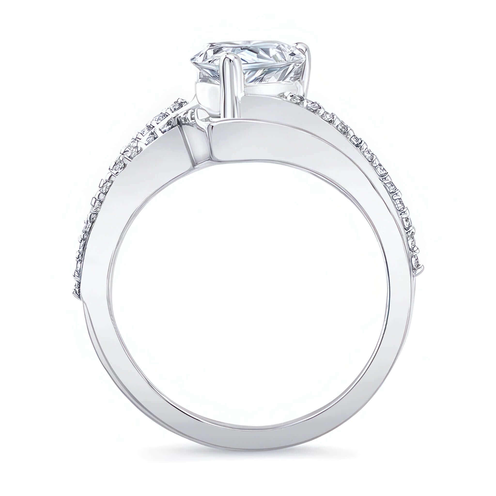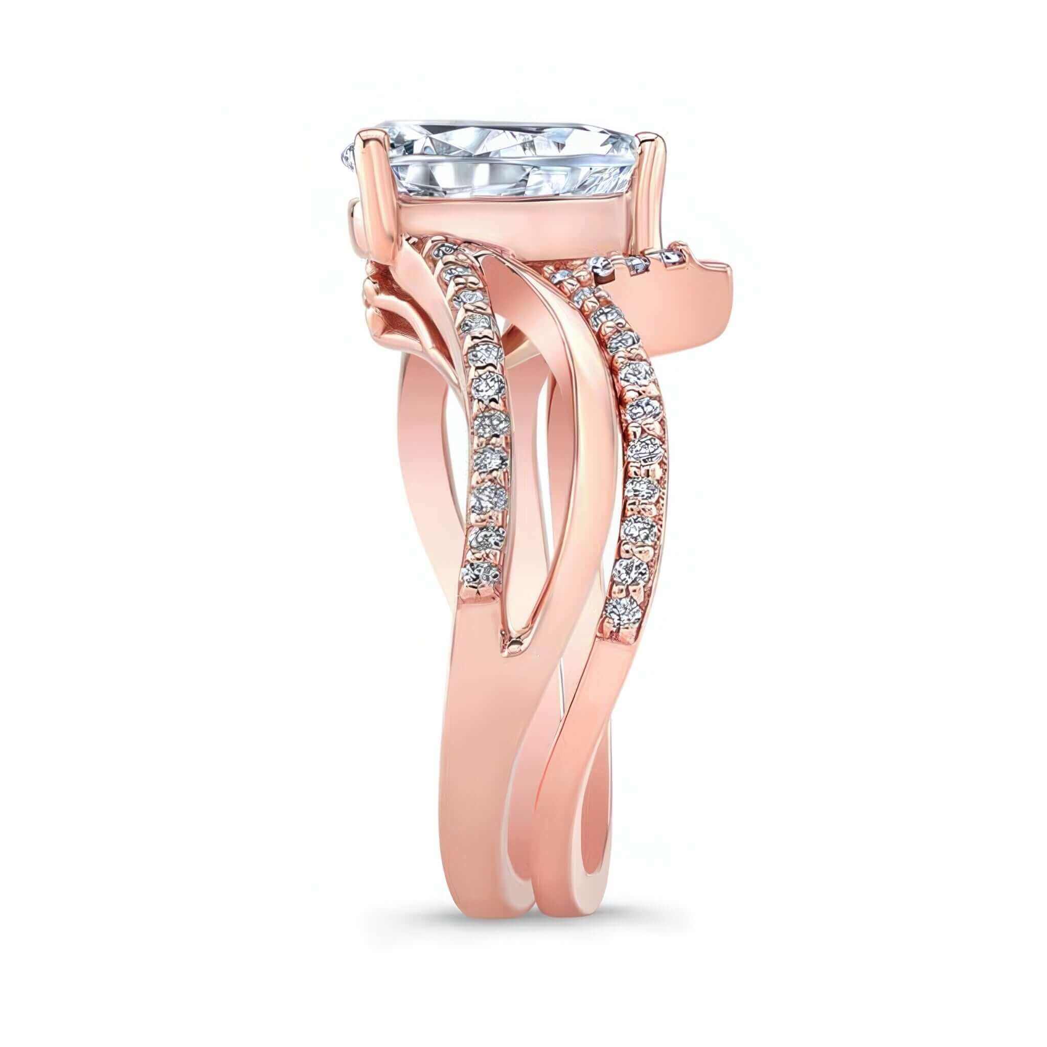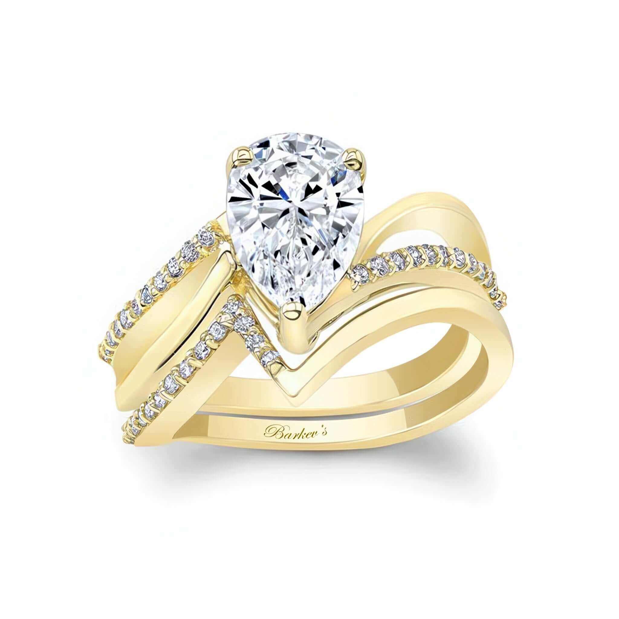 This split shank pear lab grown diamond bridal set features a center glorified by two graceful swirls, one of which is decorated by a row of prong set diamonds and a matching wedding band adding the final touch to its overall glamorous effect.