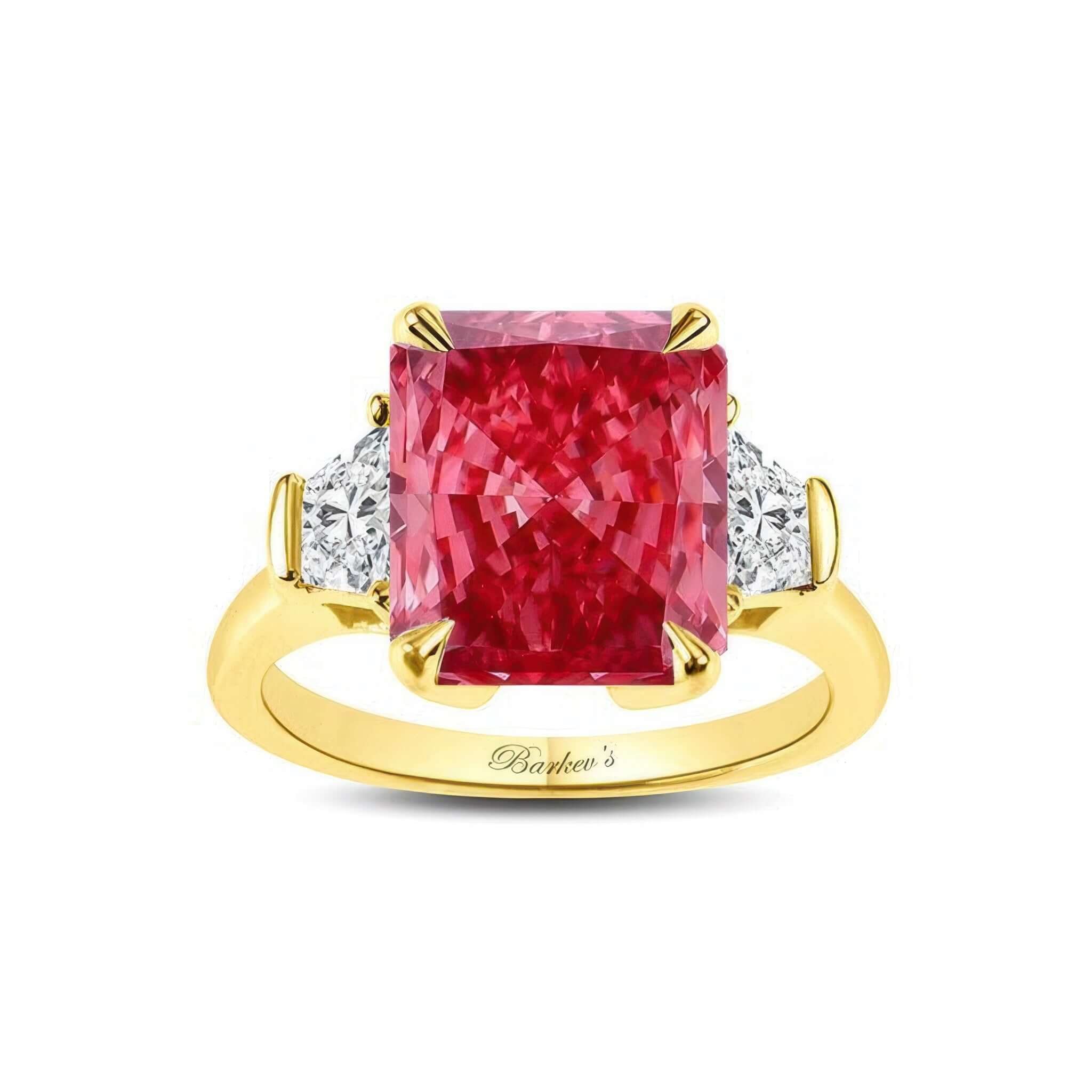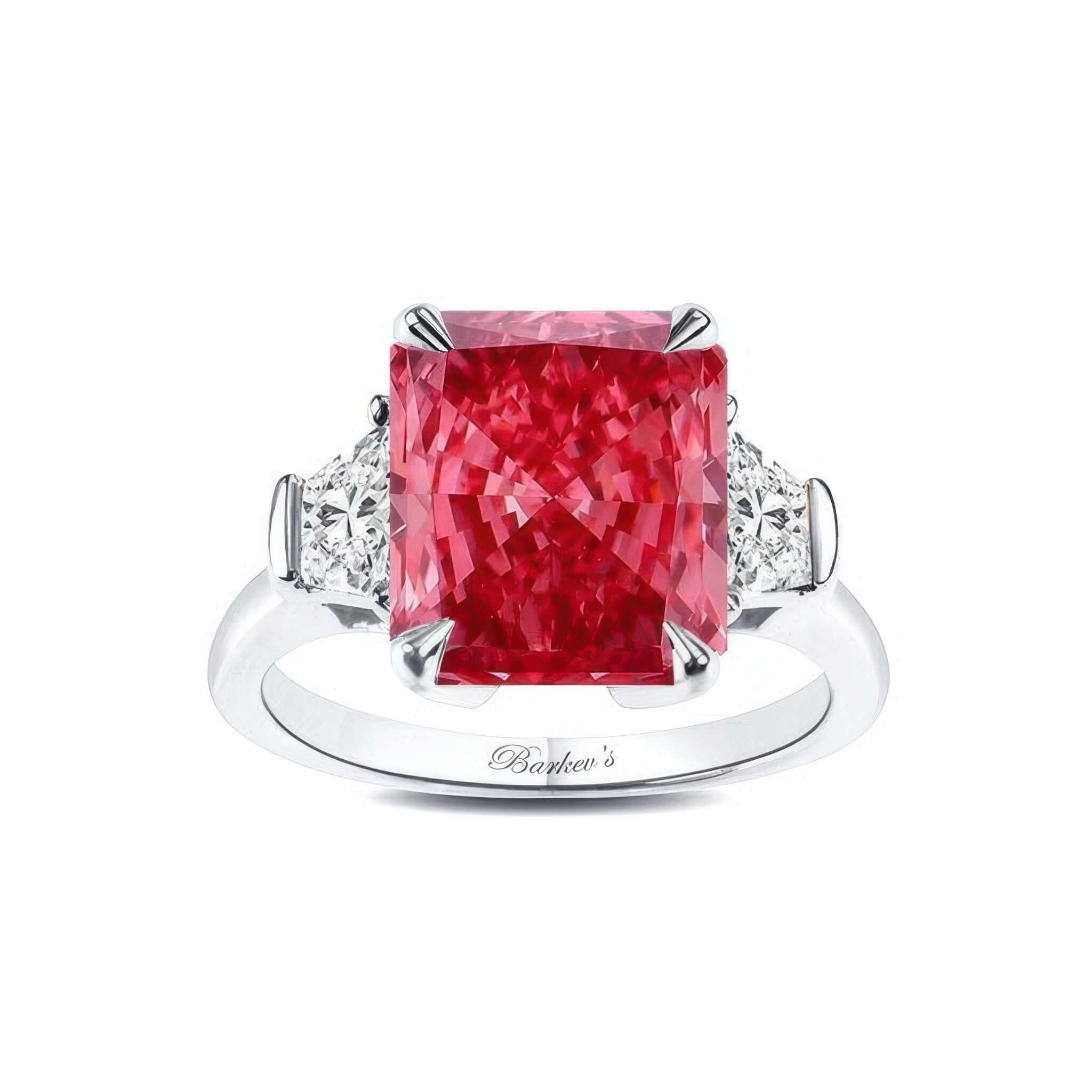 An incredible 5 carat lab pink diamond ring featuring a three stone design with a radiant cut center and trapezoid diamonds on each side for a unique look.