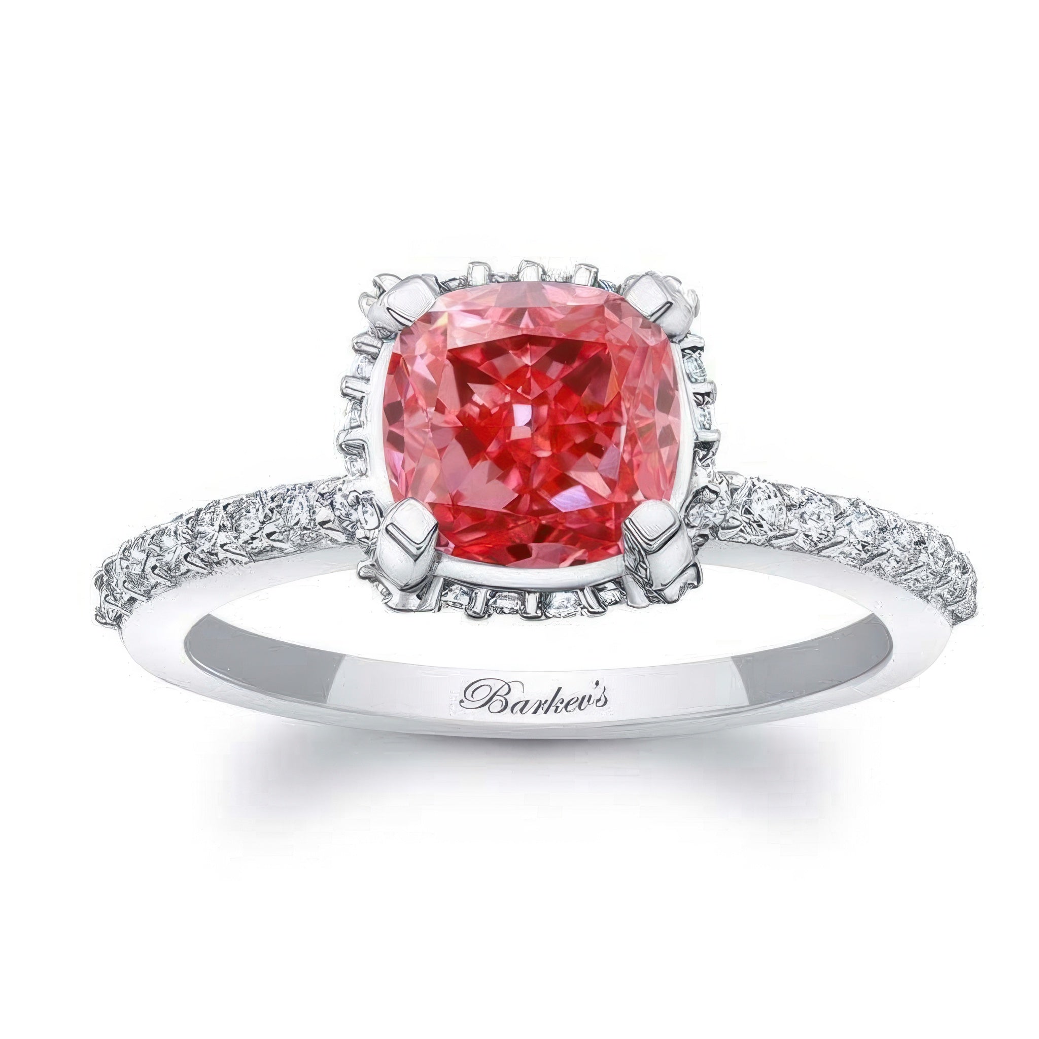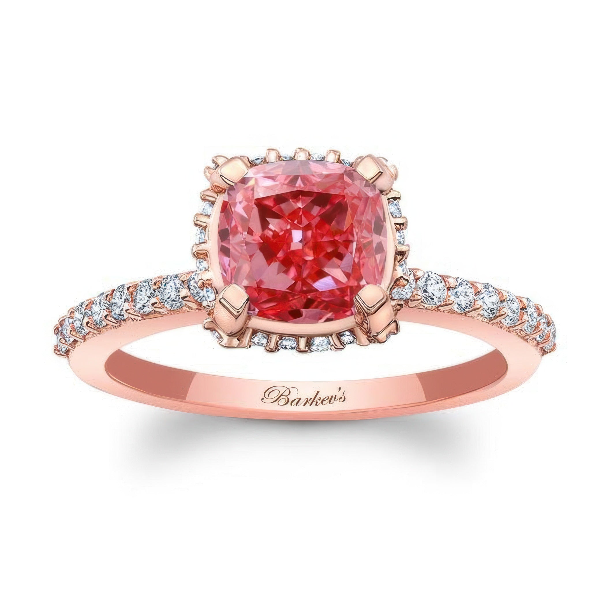 This stunning cushion halo lab grown pink diamond engagement ring boasts an elegant design combining a beautiful center and a diamond halo encircling it underneath with more diamond melees adorning the band.