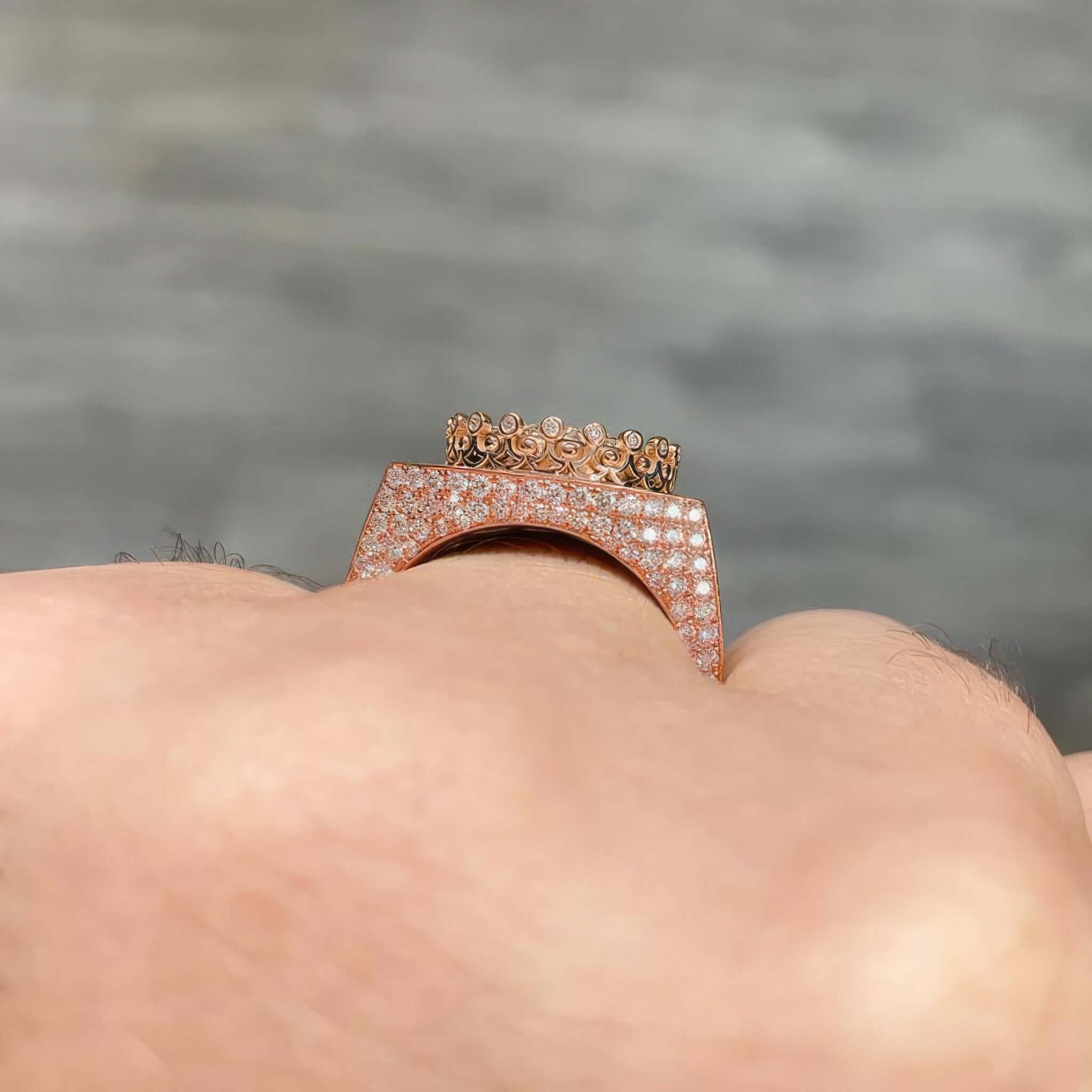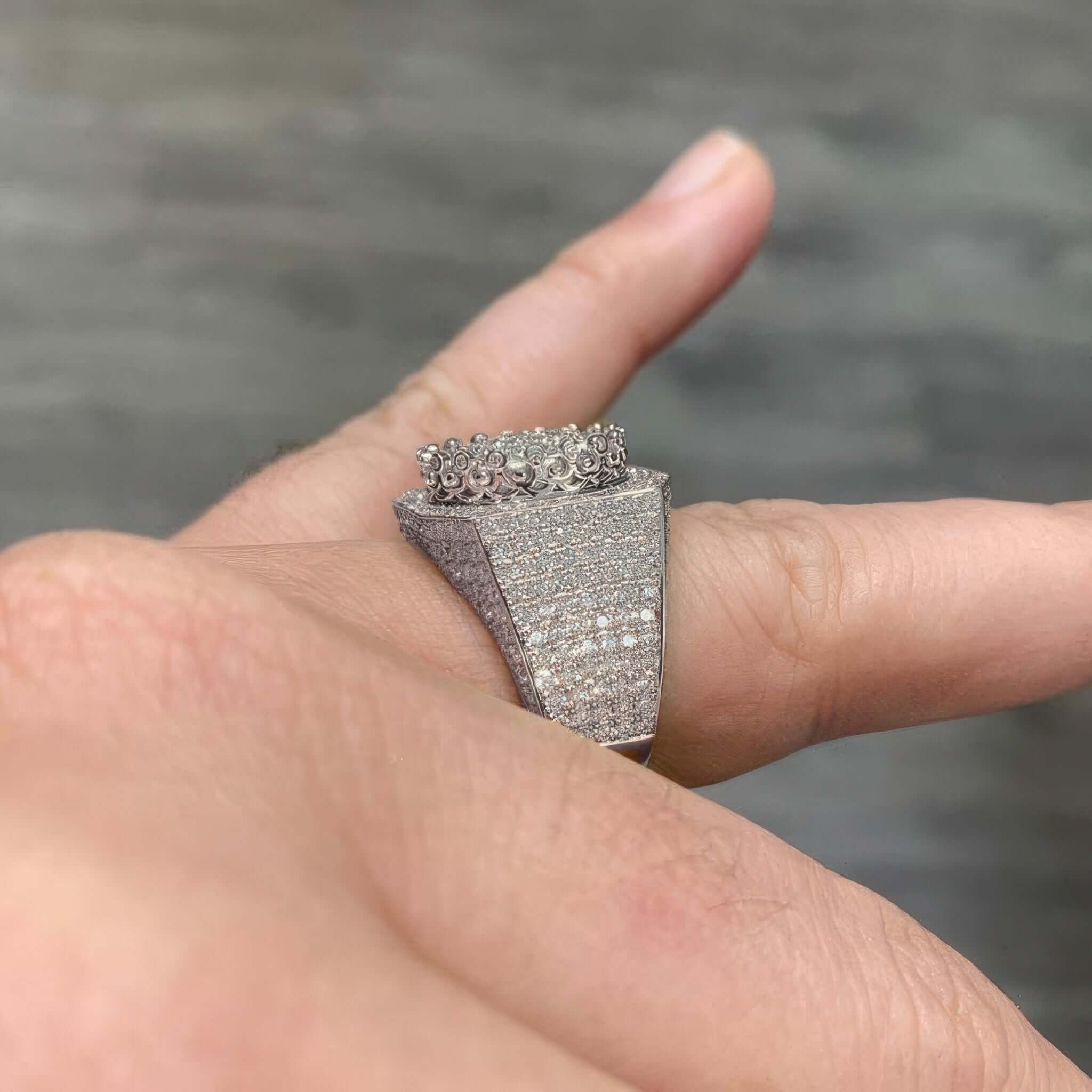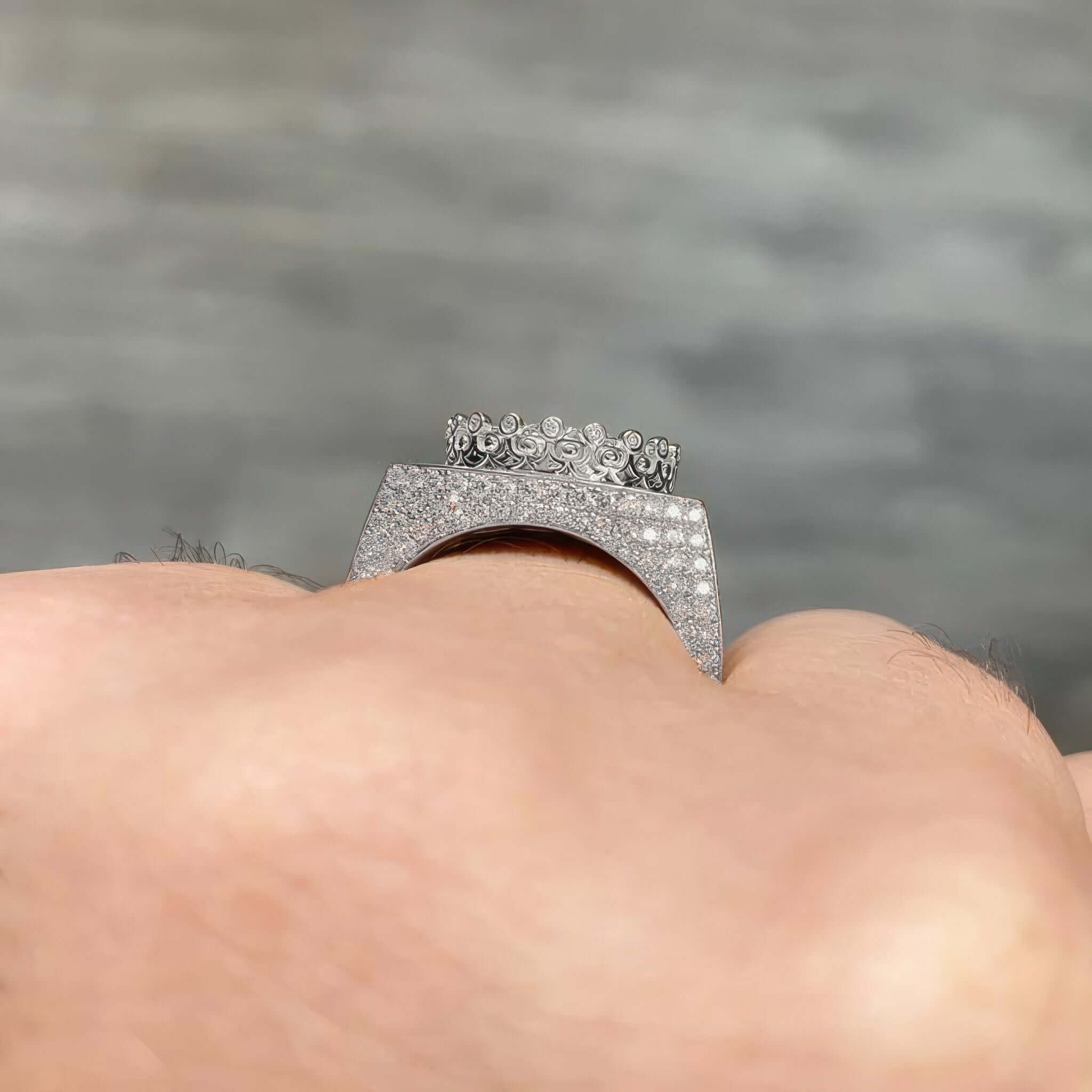 A stunning mens diamond ring featuring a detailed royal crown design encrusted with diamonds all over for a superior look.