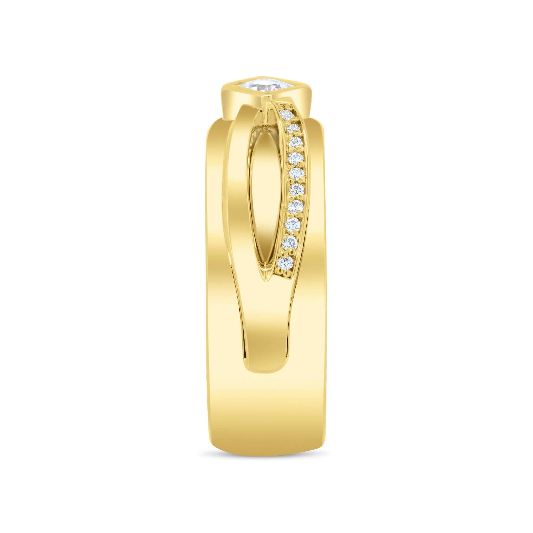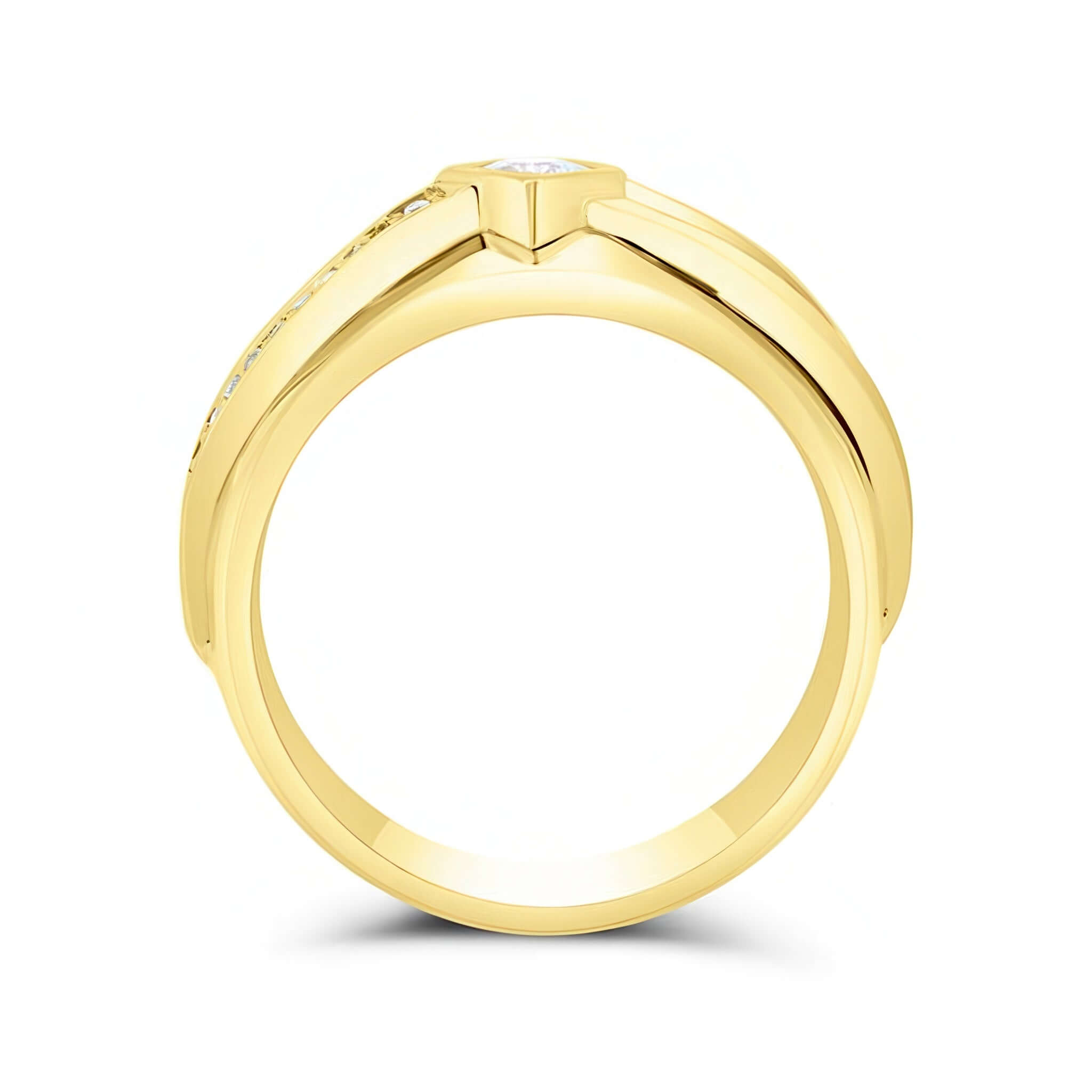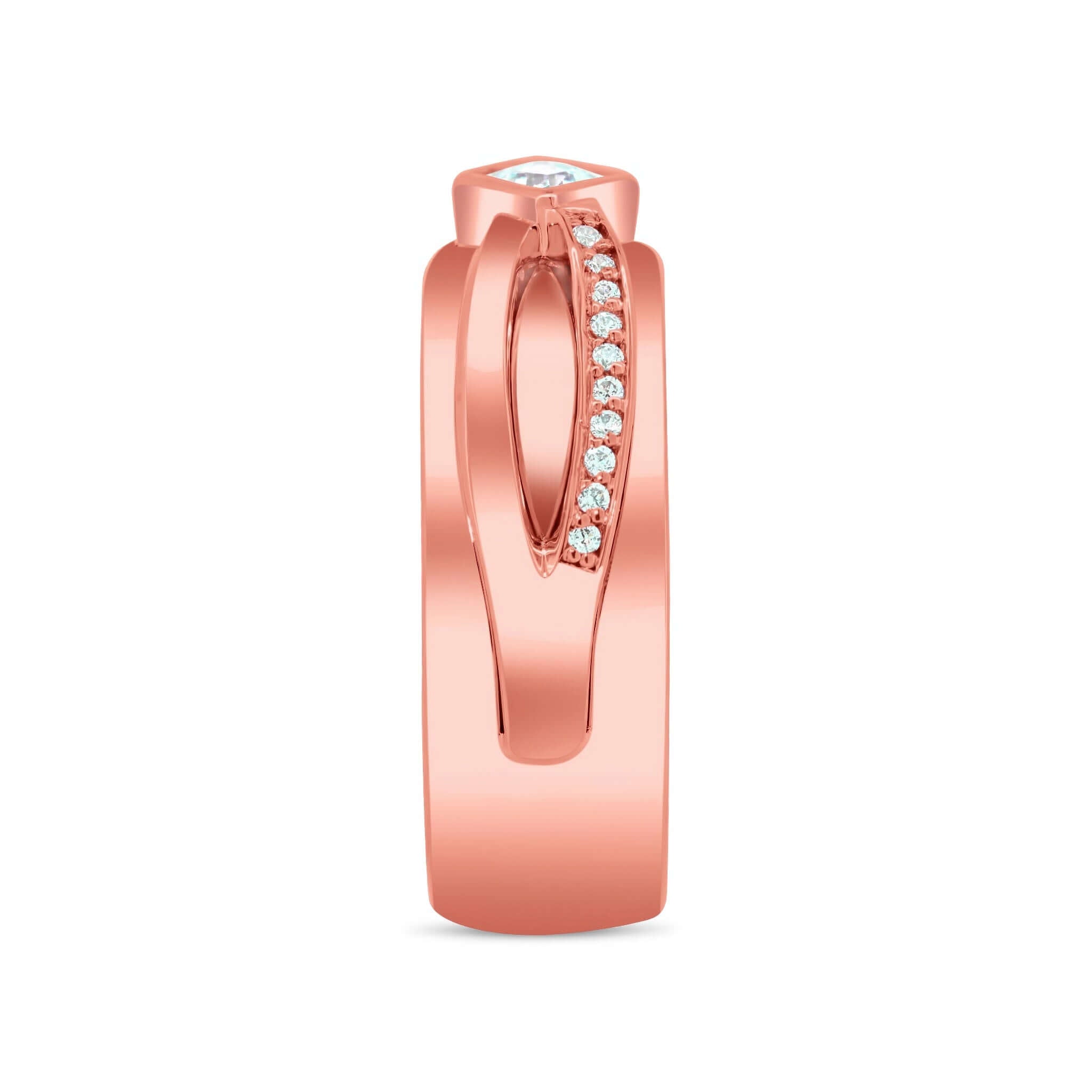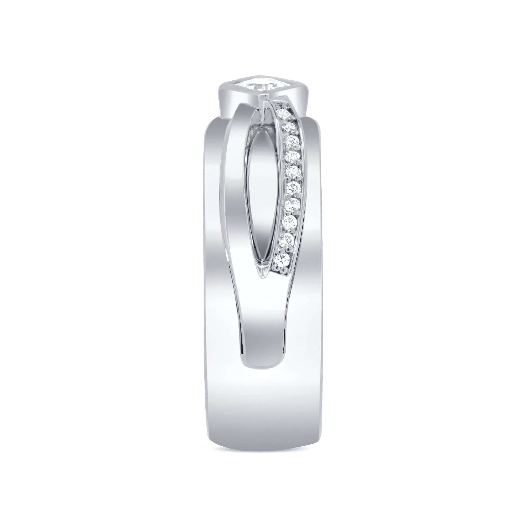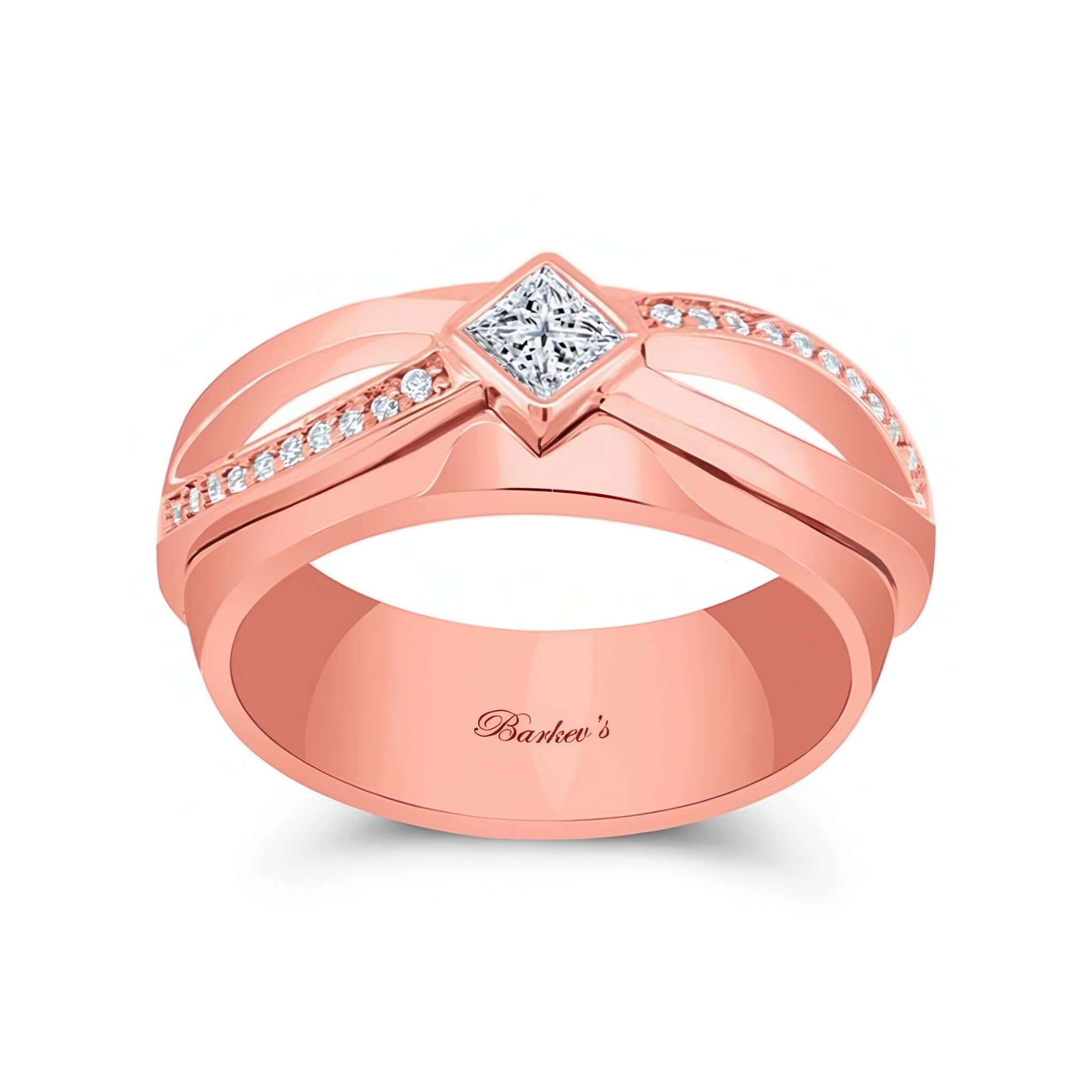 This mens unique diamond band features a princess cut center with shared prong set diamonds on the sides of a unique stylish band