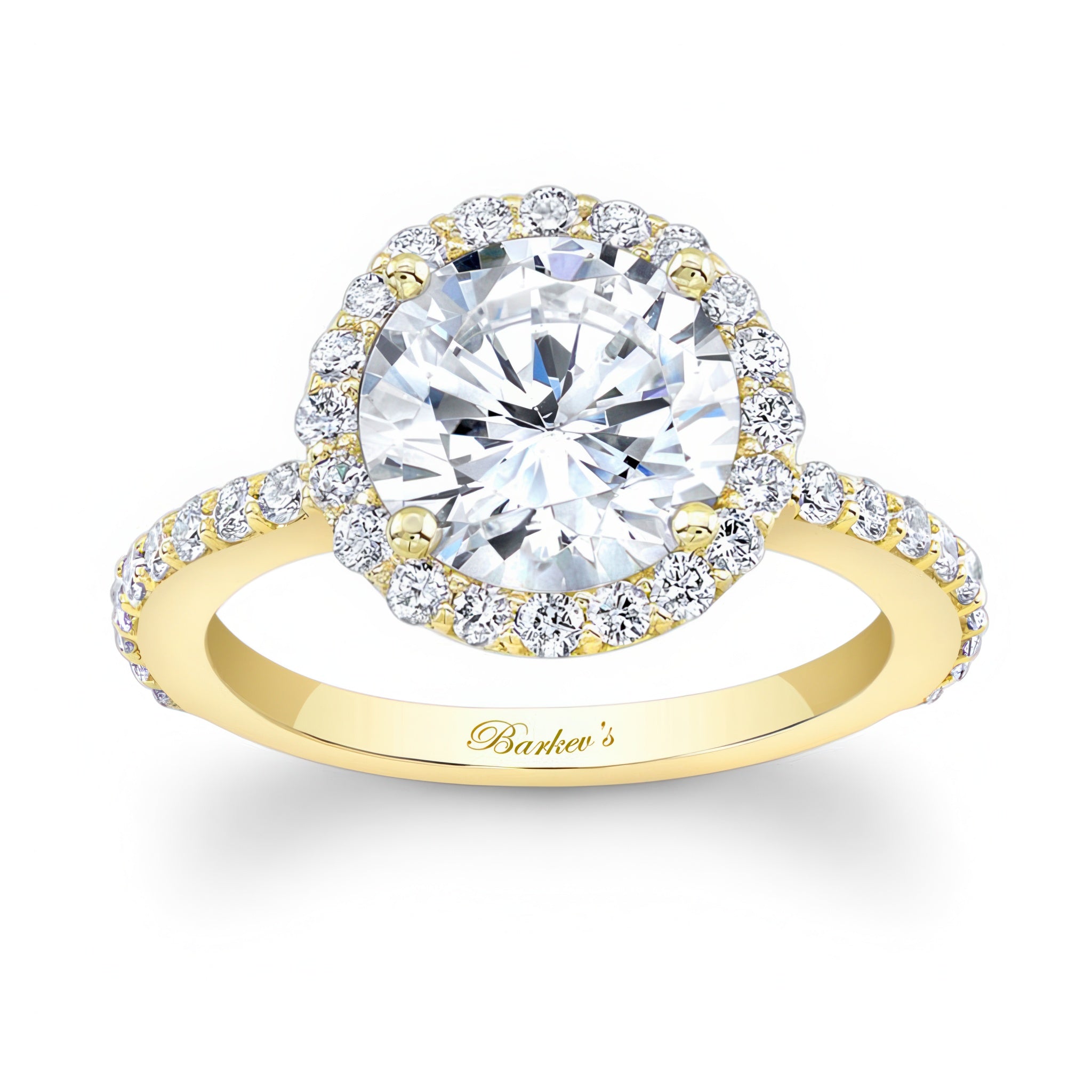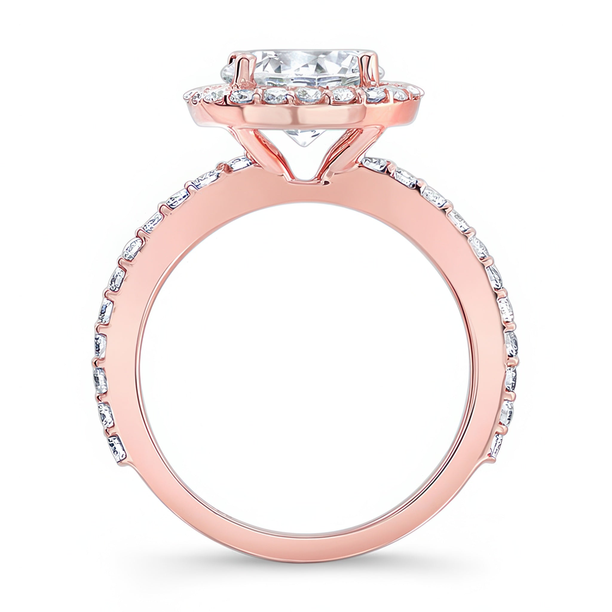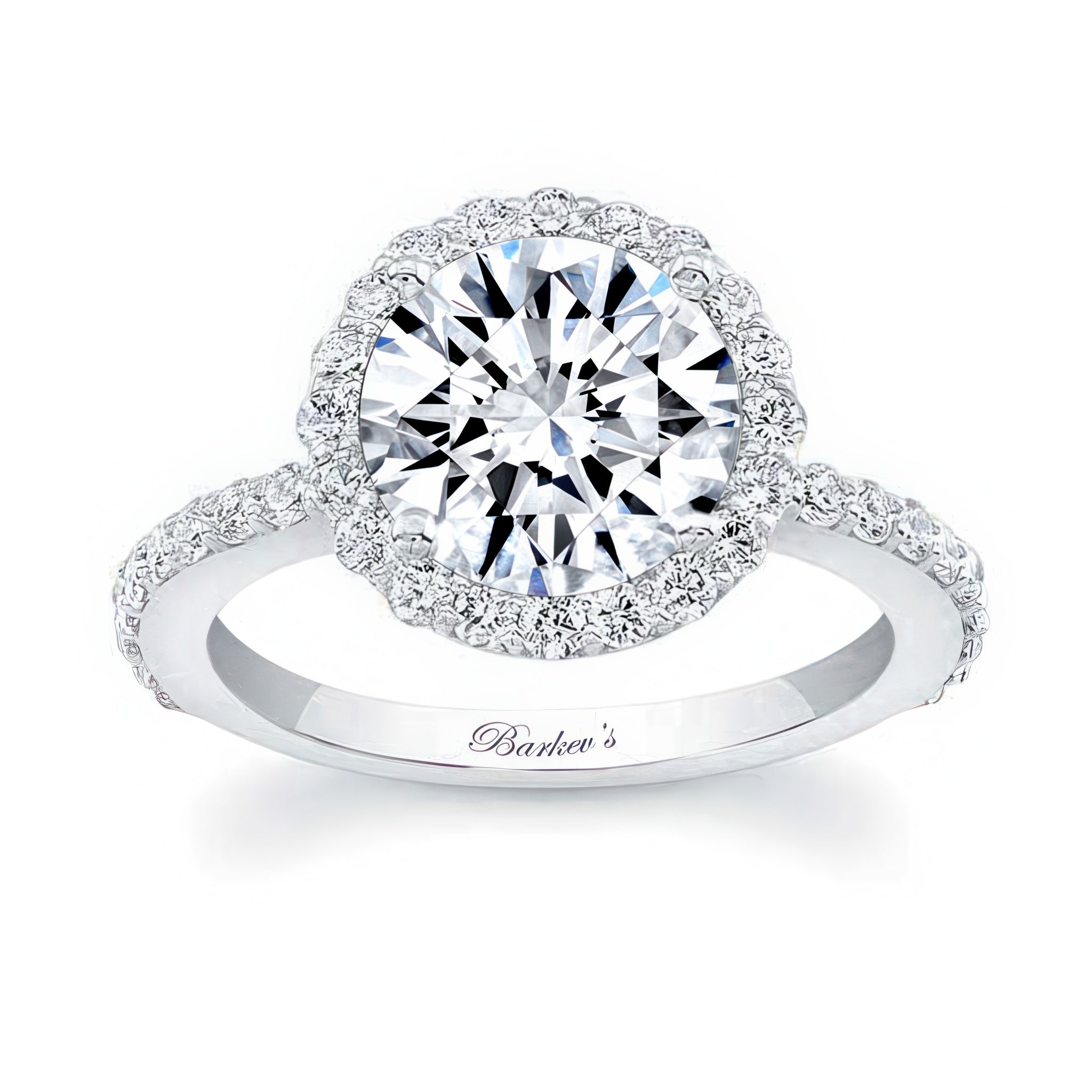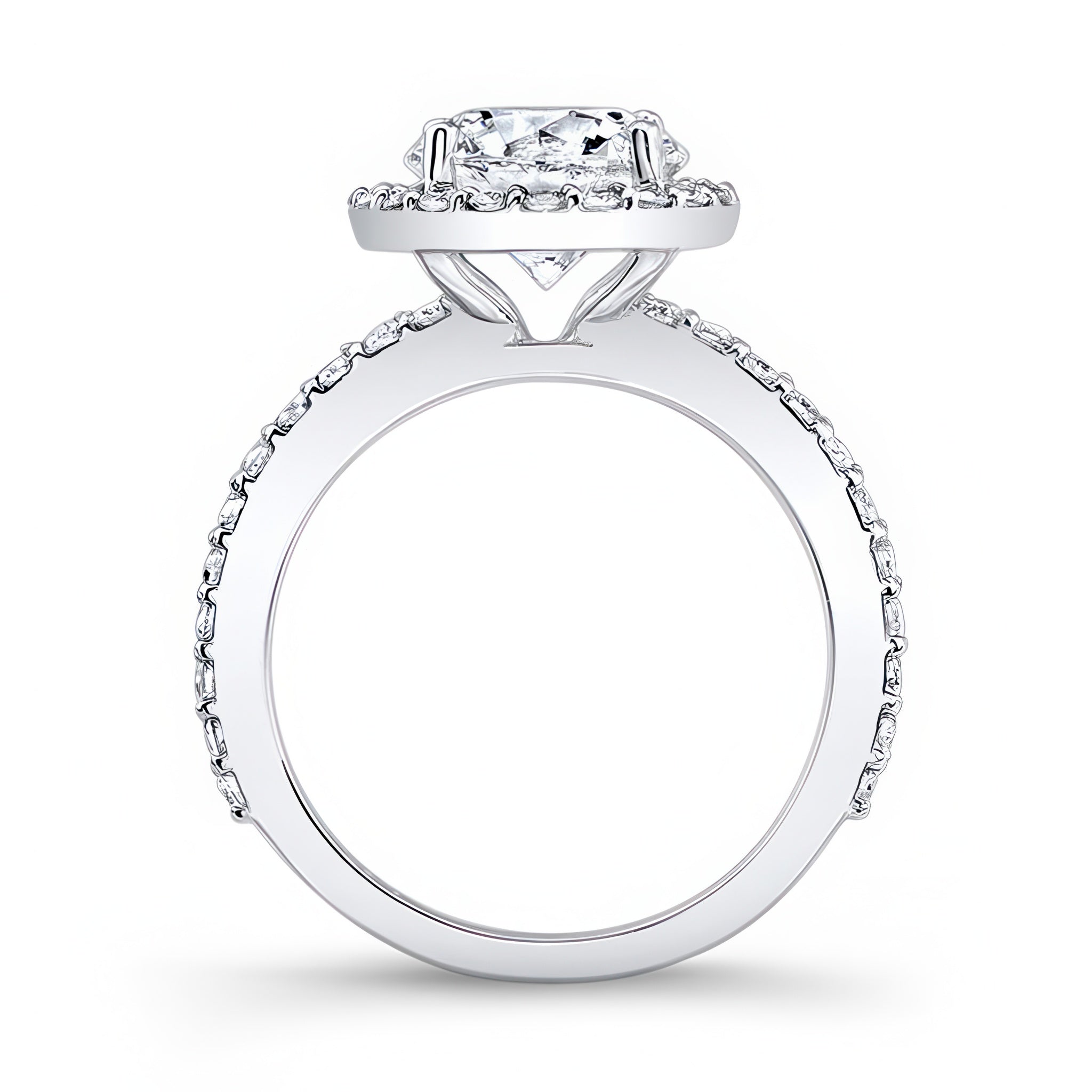 This 2 carat moissanite halo engagement ring features shared prong set diamonds around the center and more cascading down the shank for a look of sheer elegance.