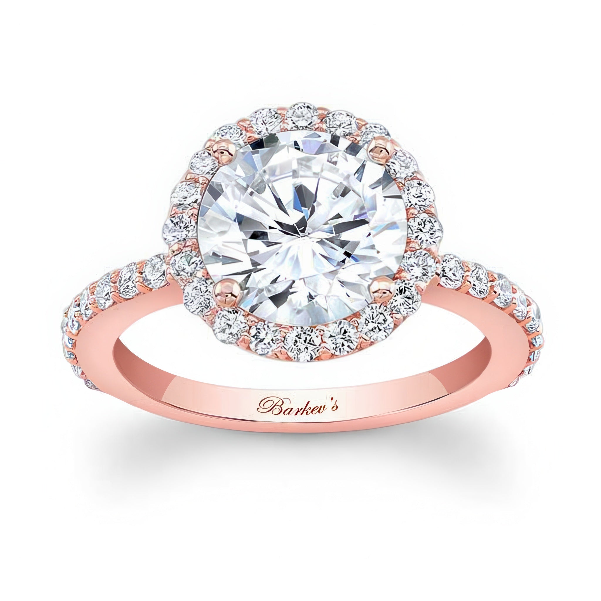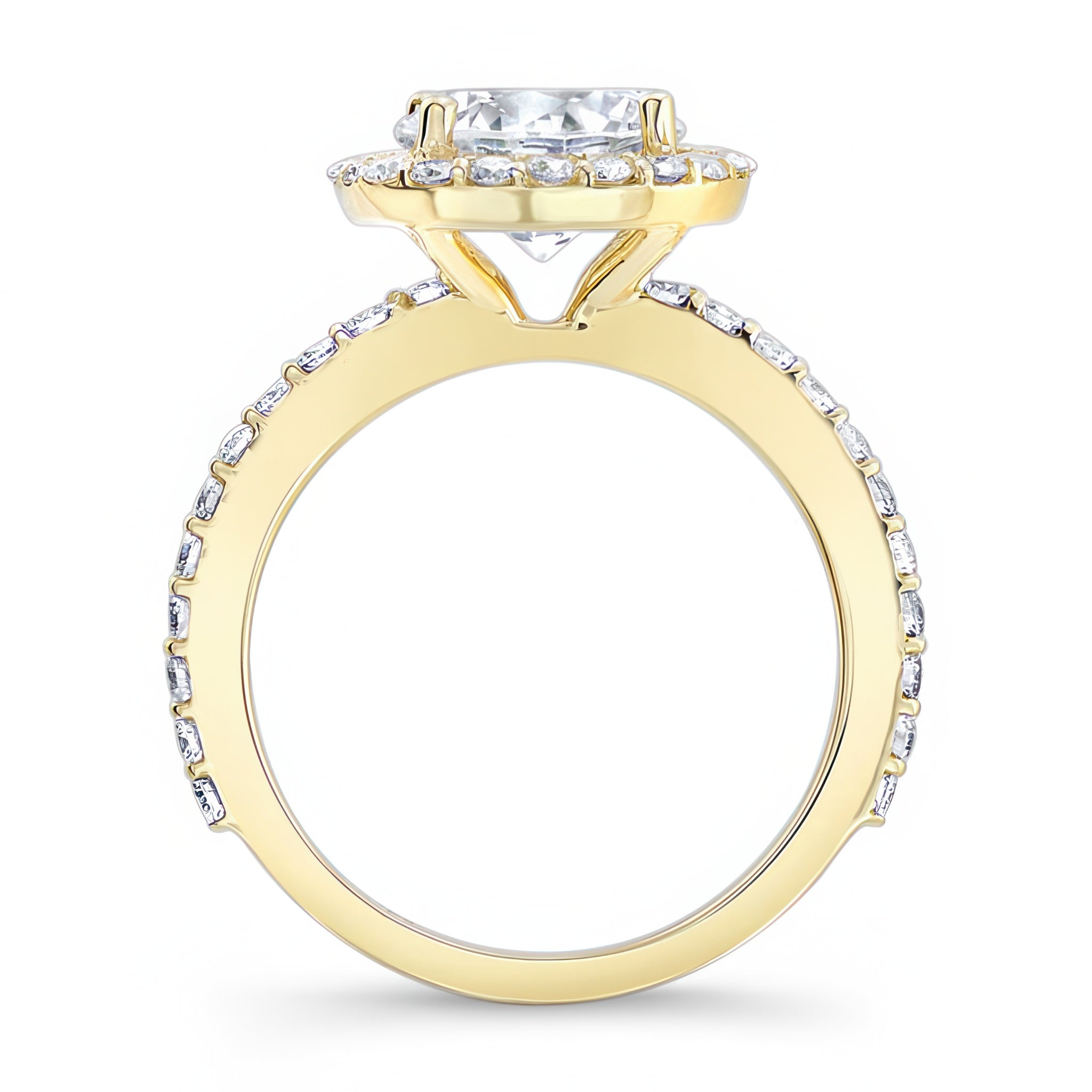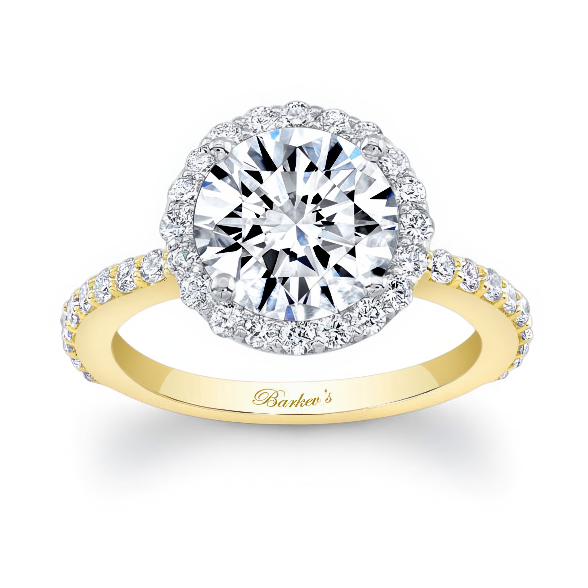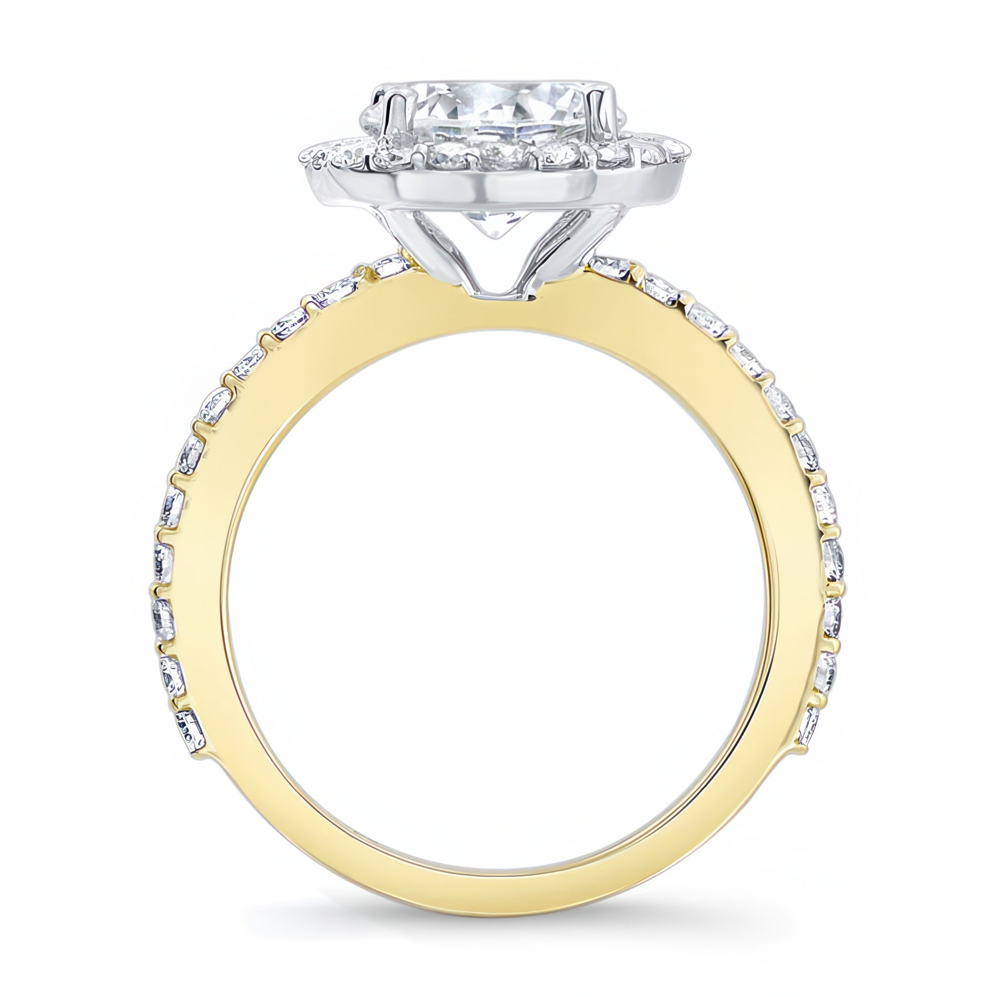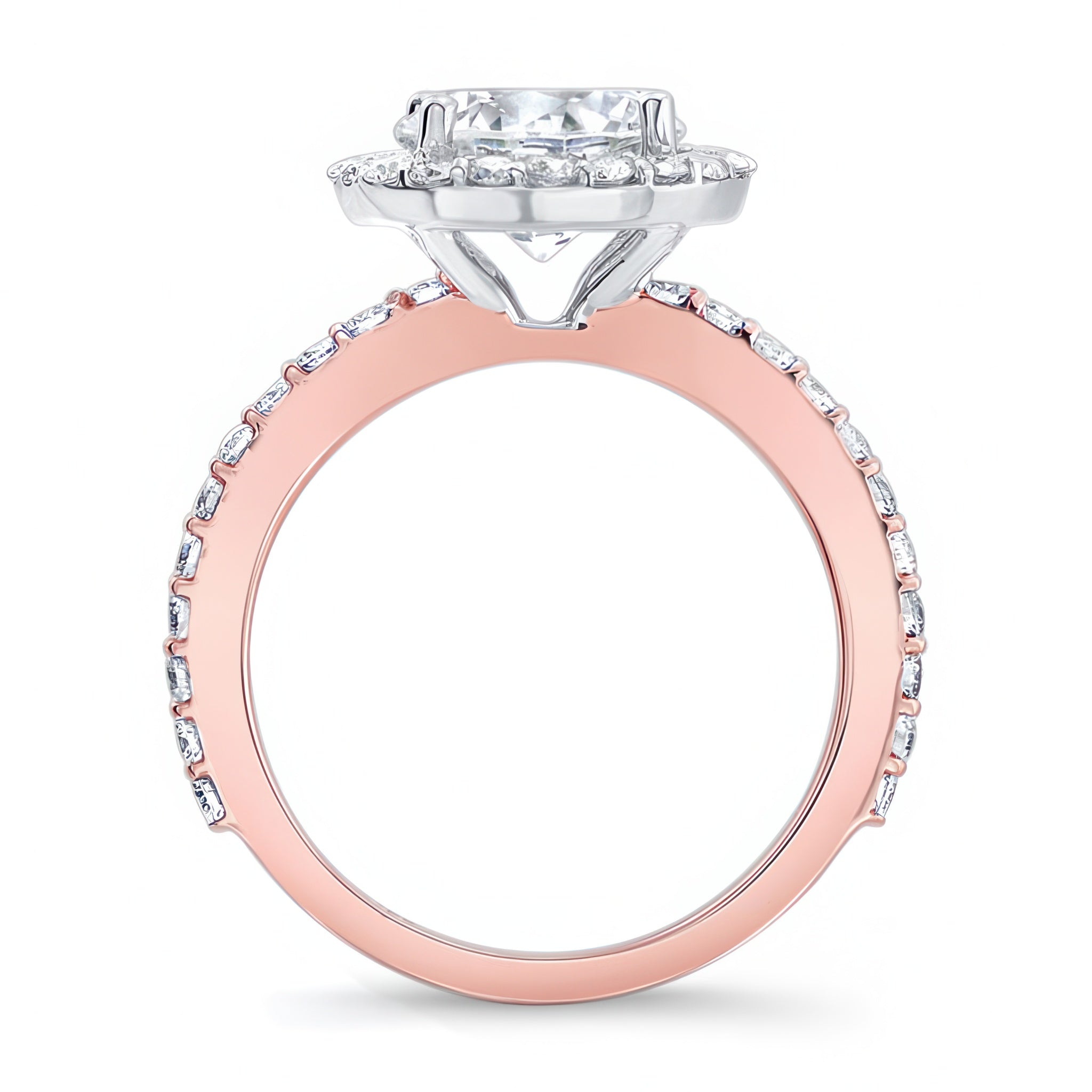 This 2 carat moissanite halo engagement ring features shared prong set diamonds around the center and more cascading down the shank for a look of sheer elegance.