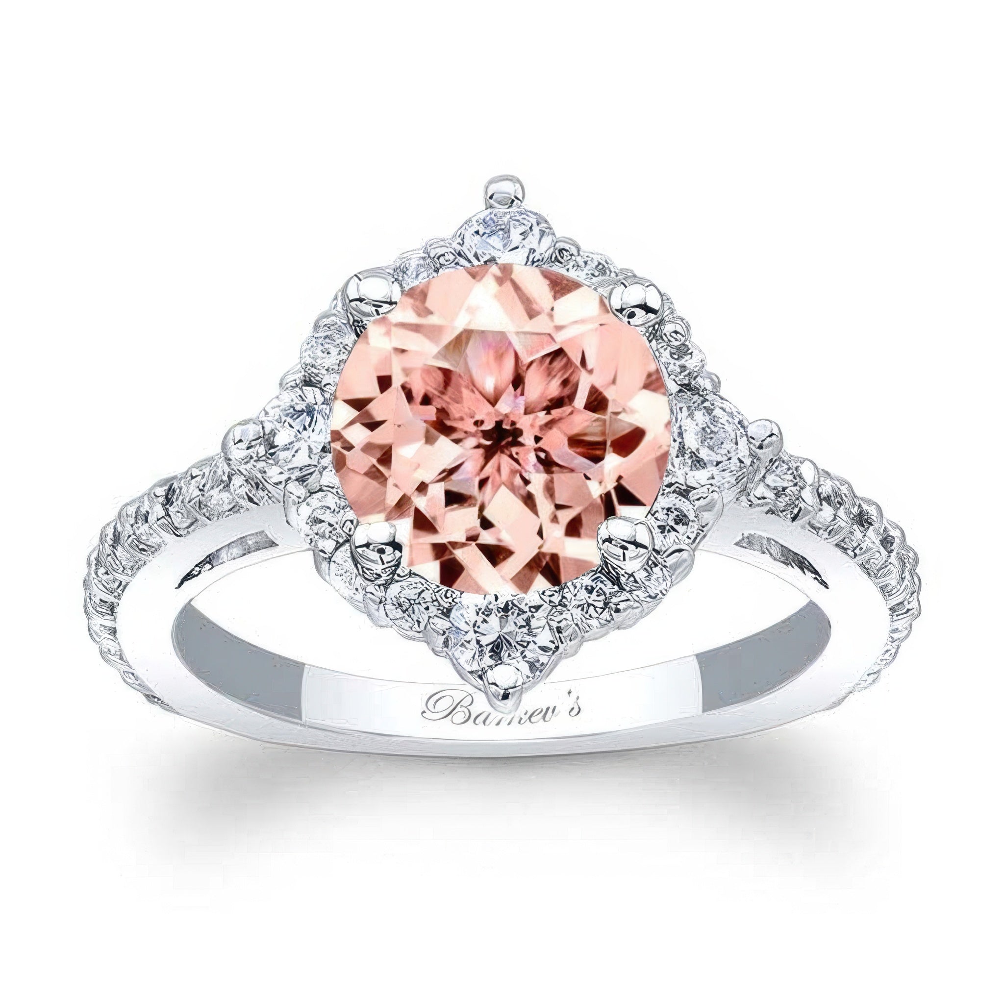 This 2 carat morganite halo diamond ring features a prong set round center artfully embellished with diamond melees for a twist on the traditional halo ring. The narrow shank is set with shared prong set diamonds for an elegant finish.