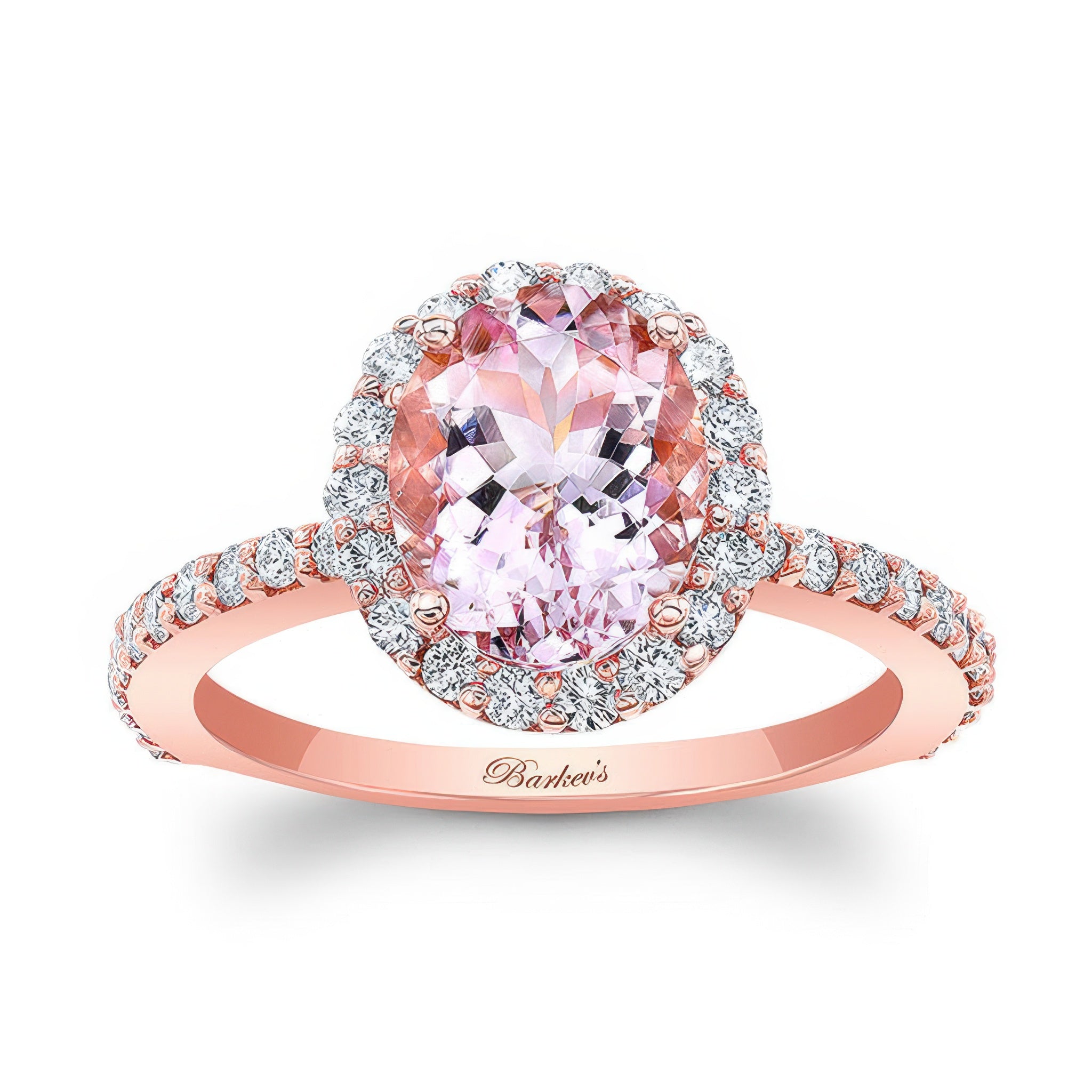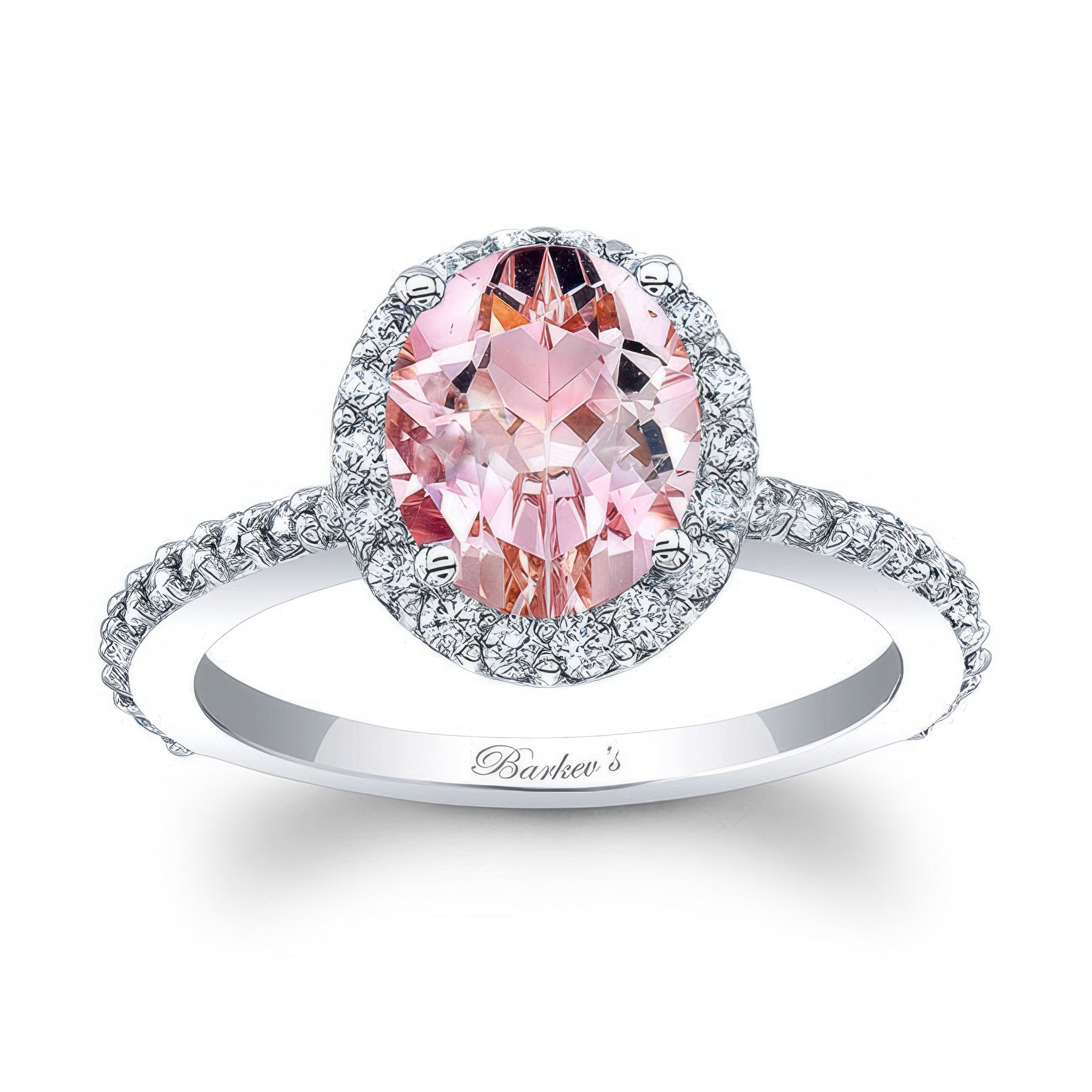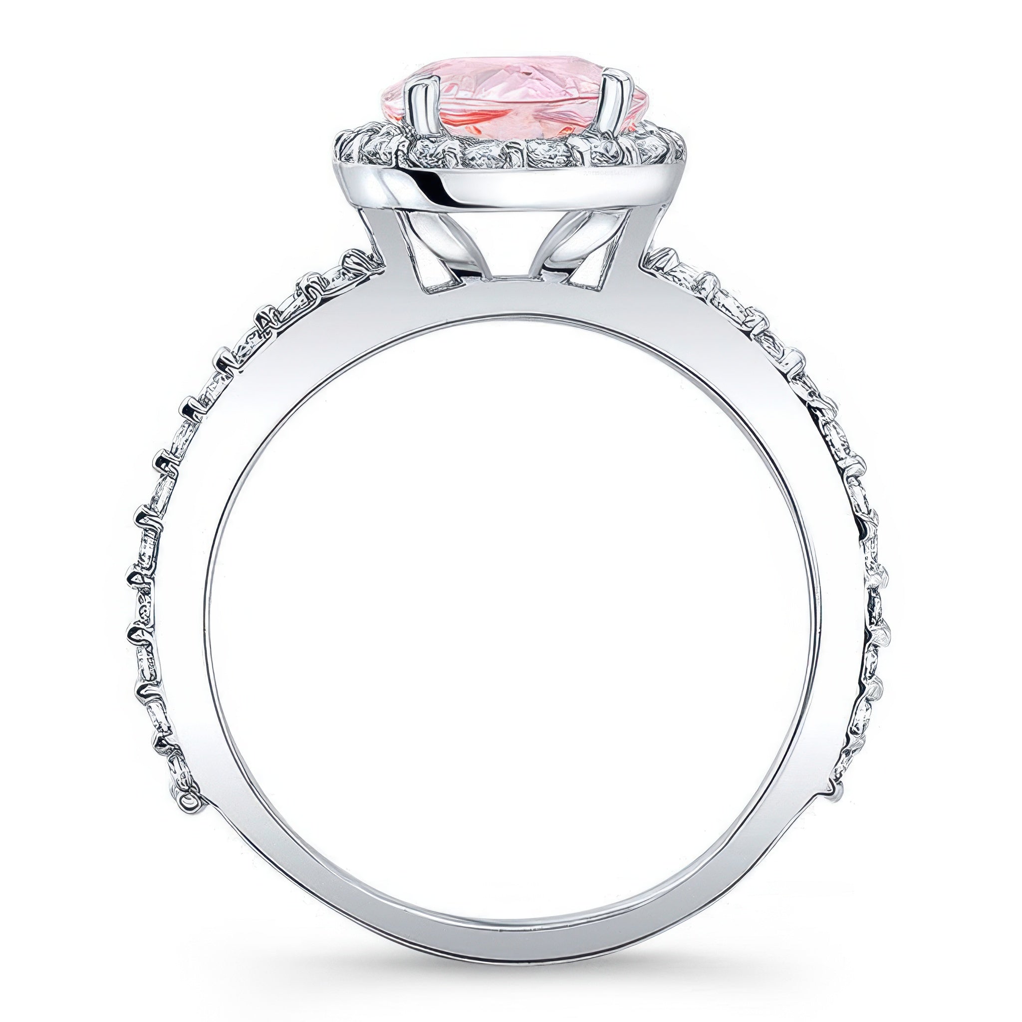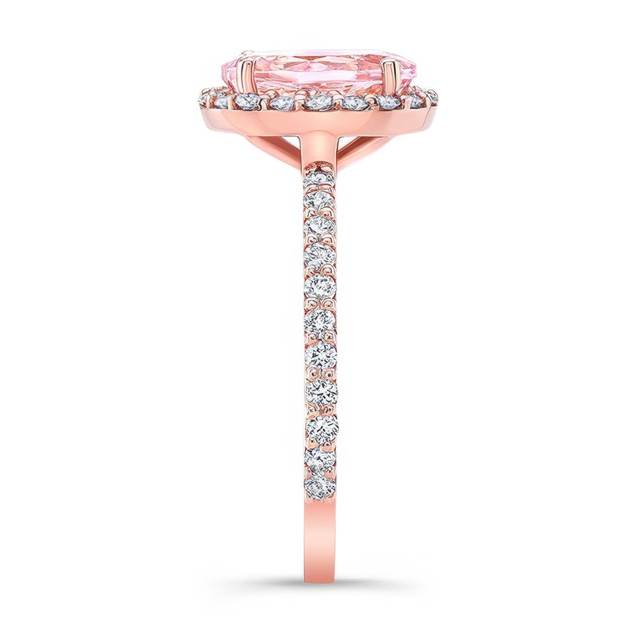 Stunning, in vogue, this 2 carat oval morganite halo engagement ring will capture the eye of many admirers. Shared prong set diamonds encircle the oval center and cascade down the dainty shank for a look of sheer elegance.