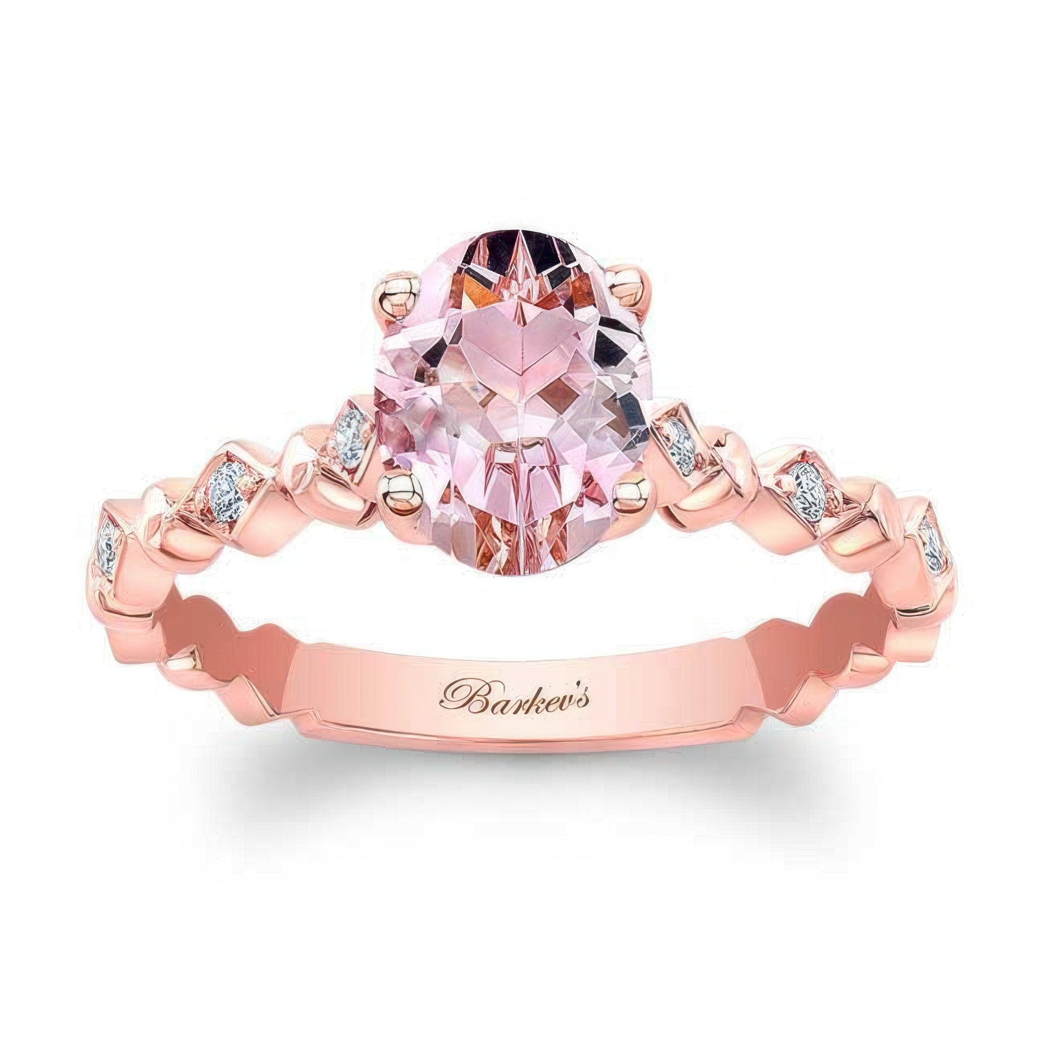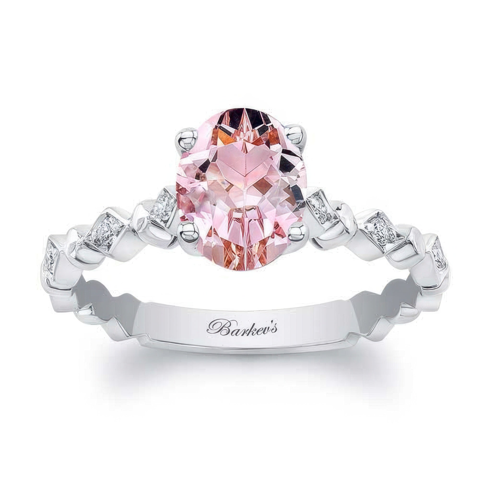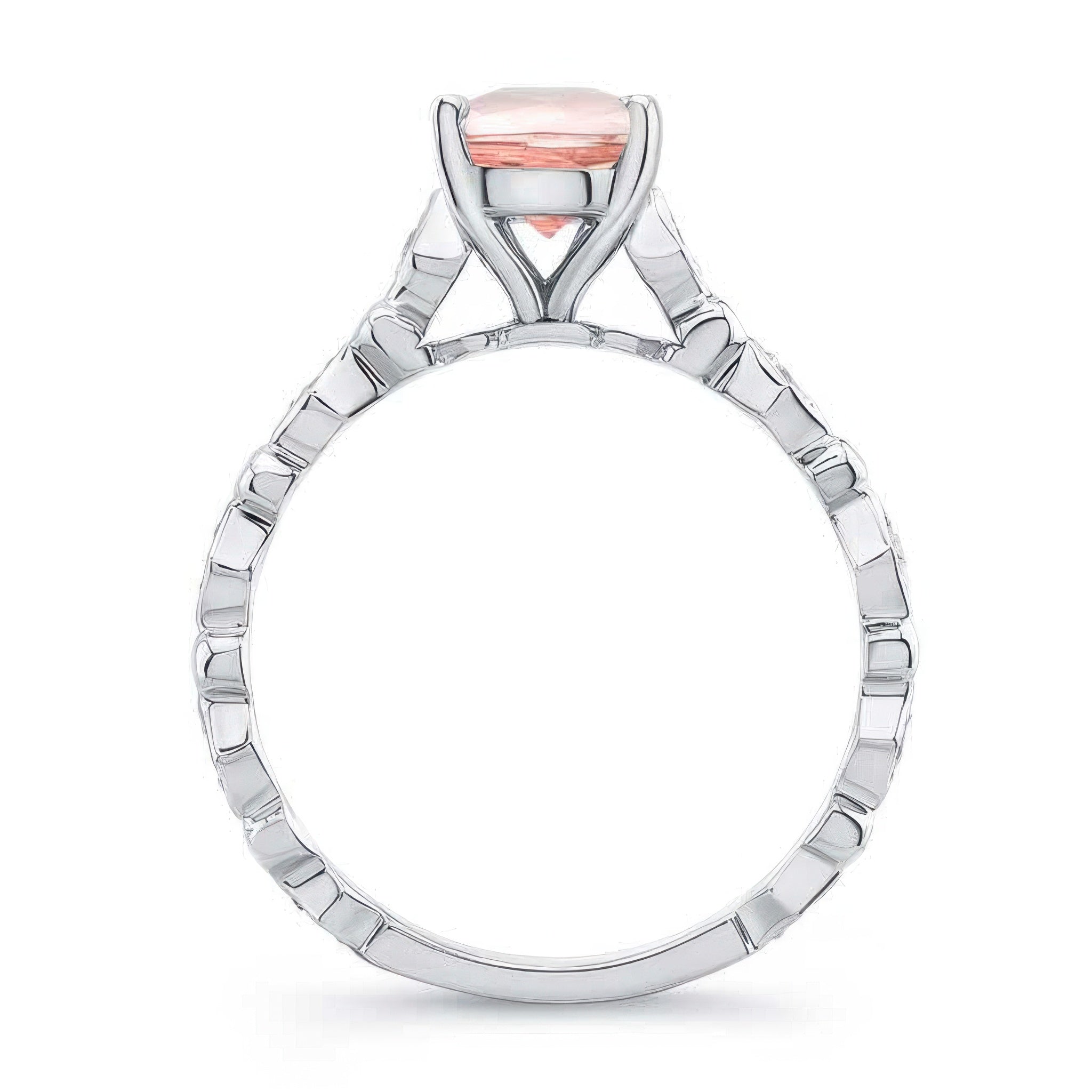 This art deco oval morganite engagement ring combines simplicity and uniqueness in a dainty design. The center stone sits beautifully on the playful diamond pave setting adorning the band.