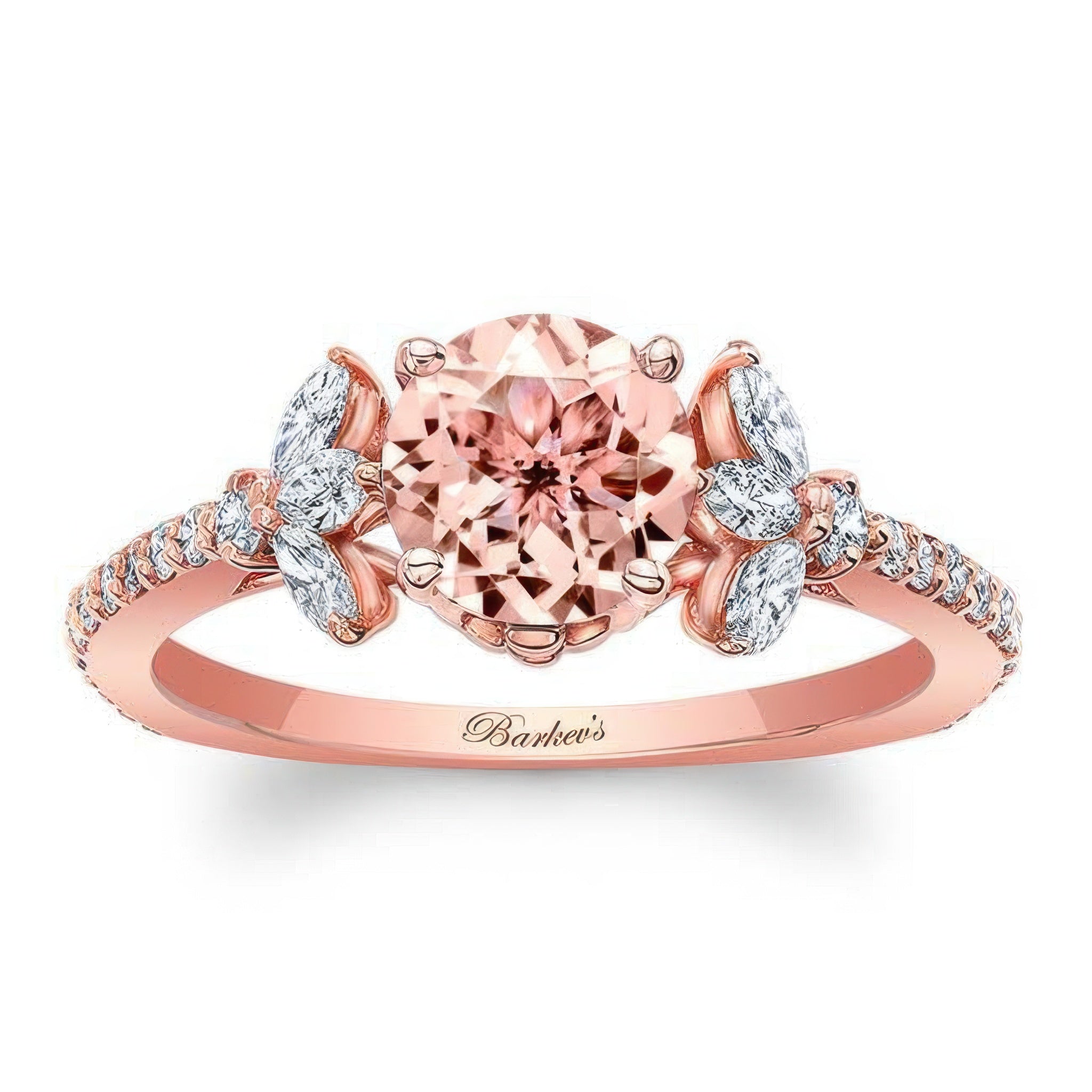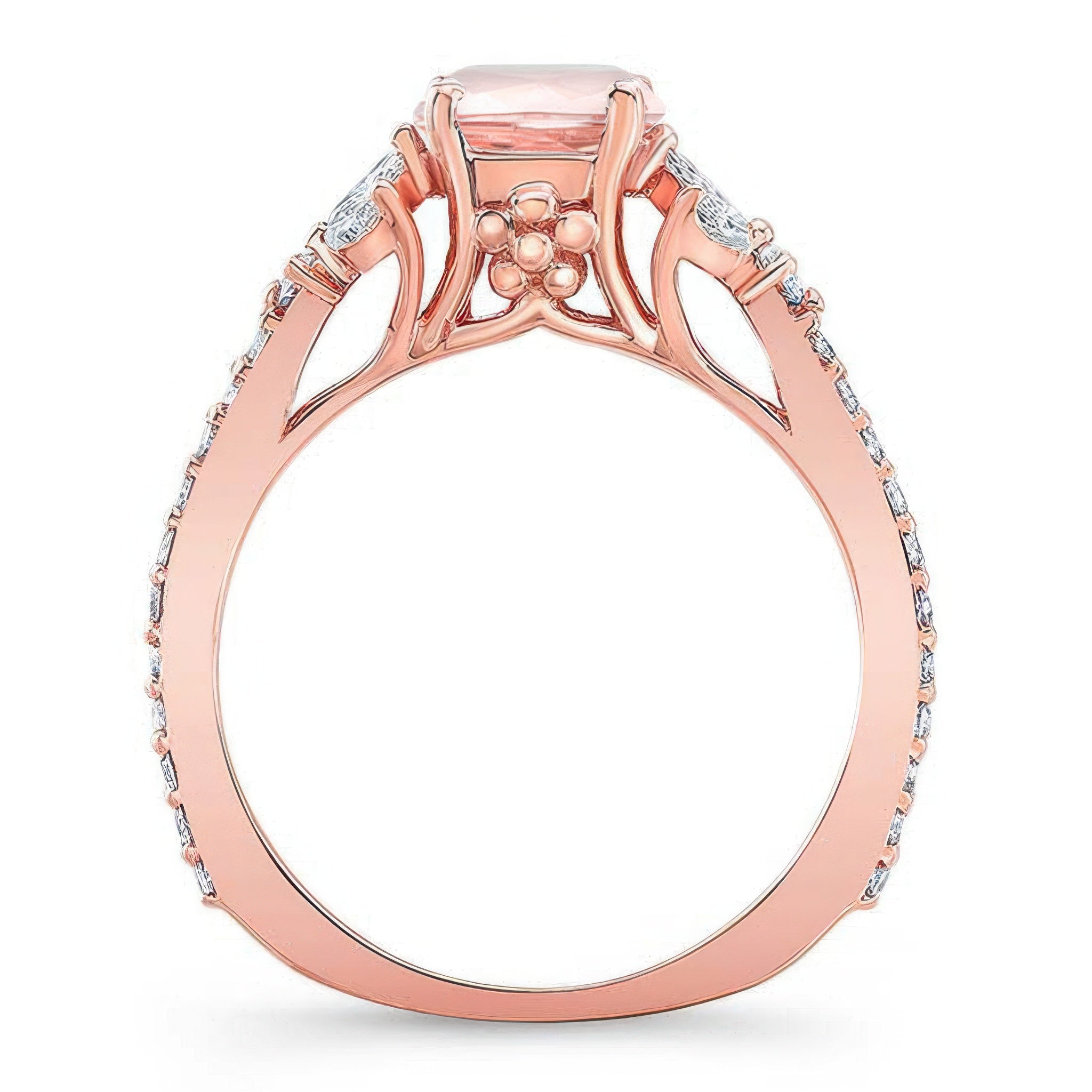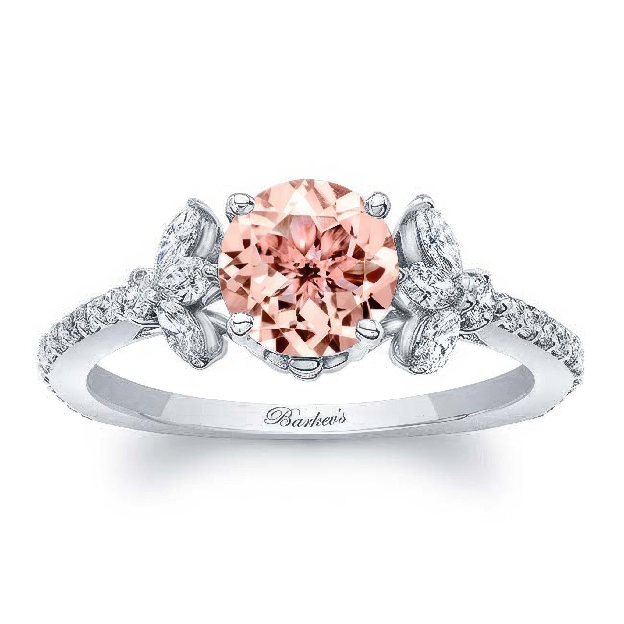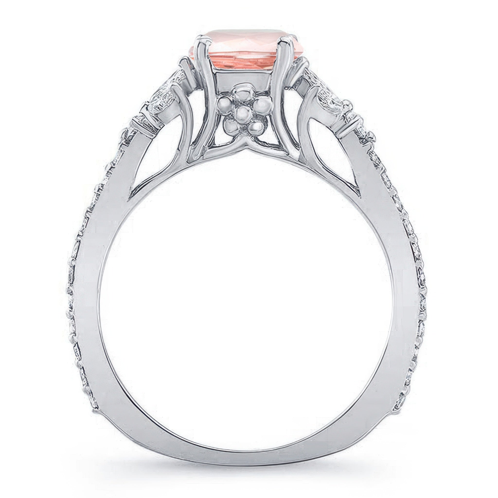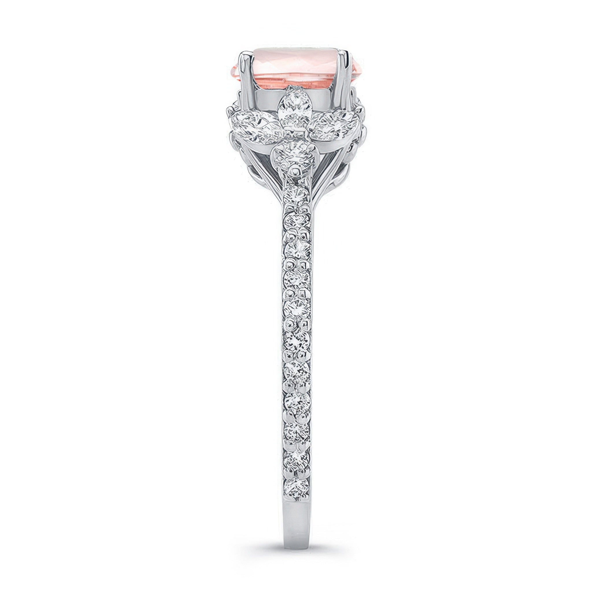 A beautiful morganite and diamond leaf engagement ring featuring a prong set center that's flanked on each side by a round diamond acting as a base while a spray of marquise cut diamonds radiate outwards forming an elegant leaf shape. The final touch is a sprinkle of diamond melees on the shank for a sparkling look.