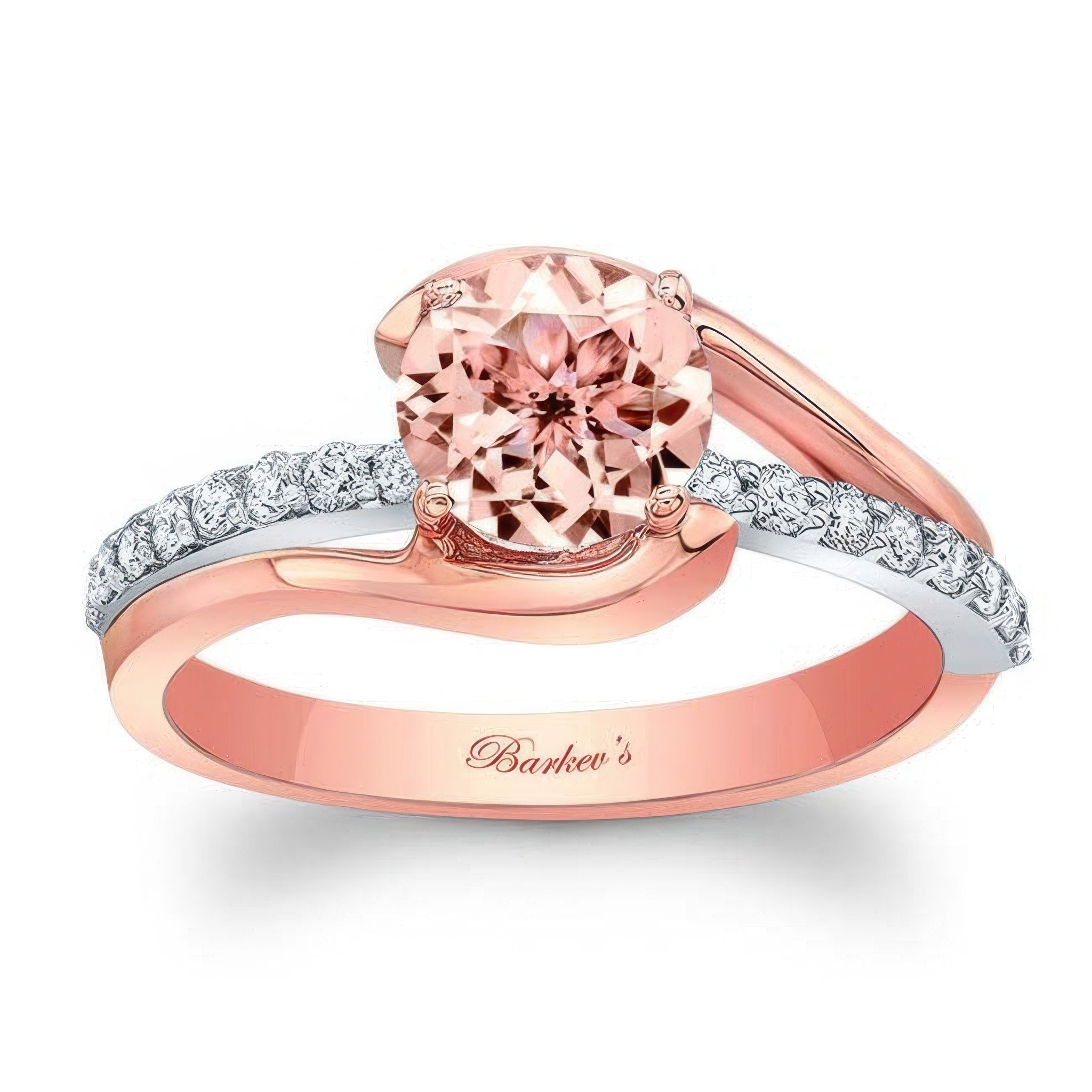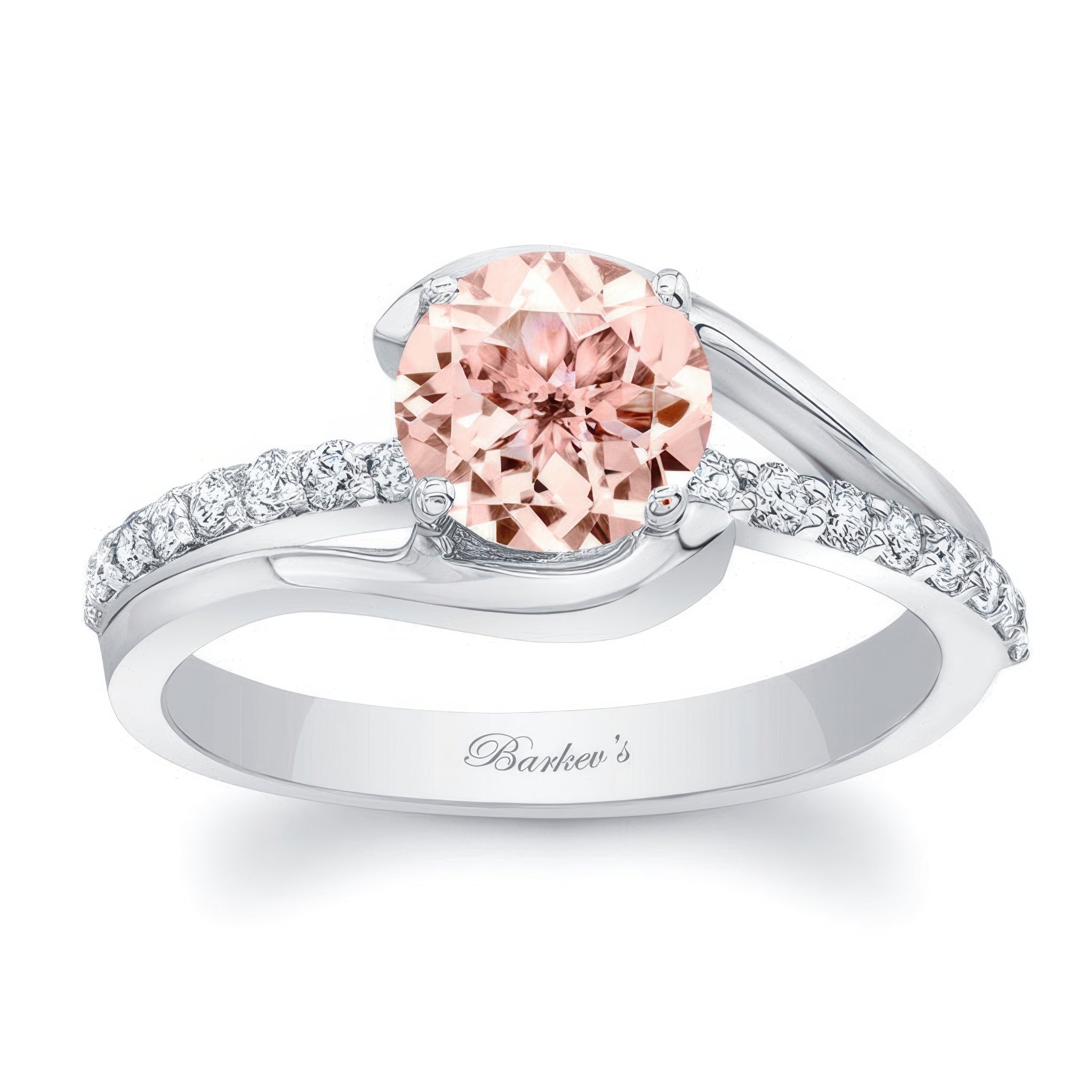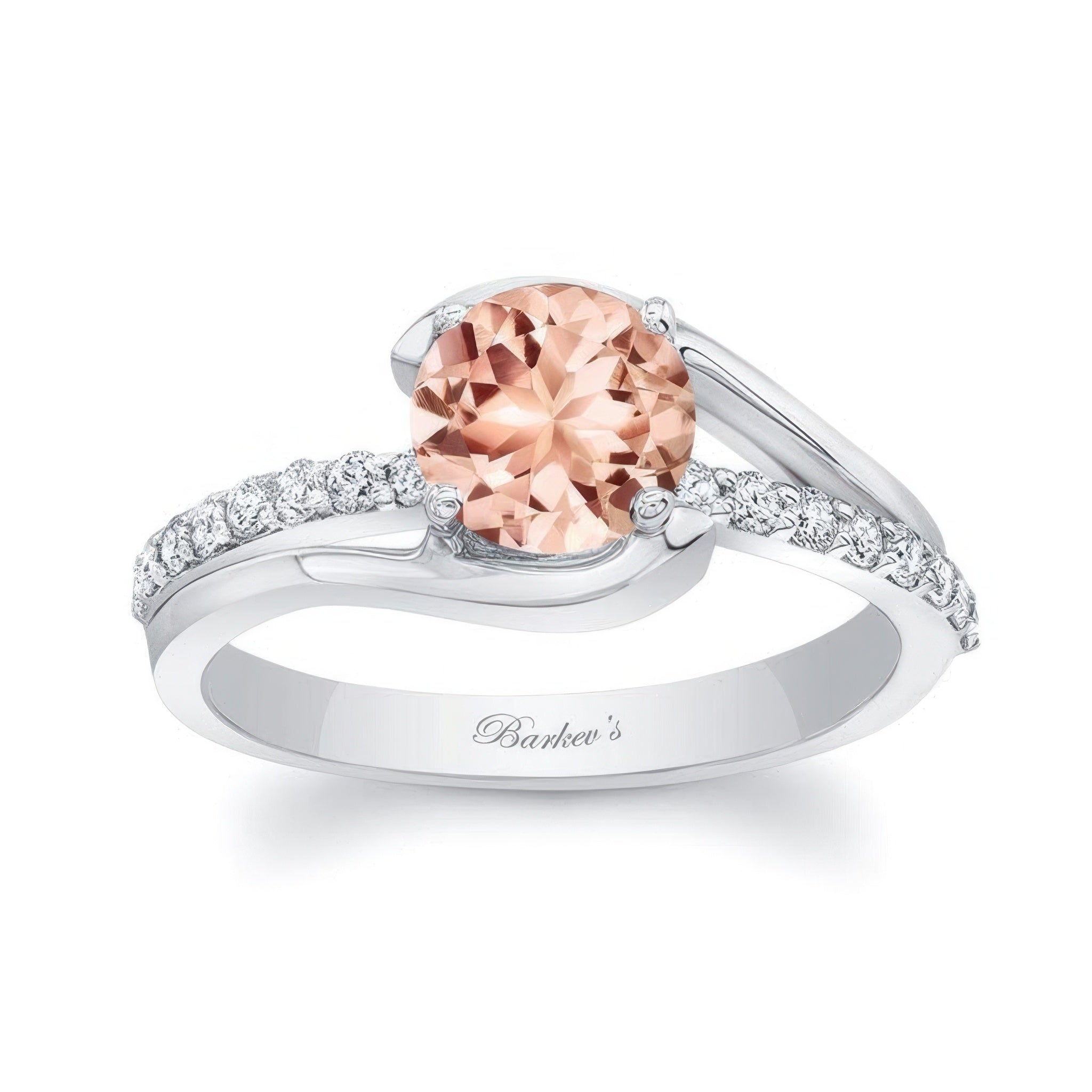This simple 1 carat round morganite ring features a split shank that swirls to cradle the round center while a shared prong set diamond bridge crosses underneath for a dramatic fashion statement.