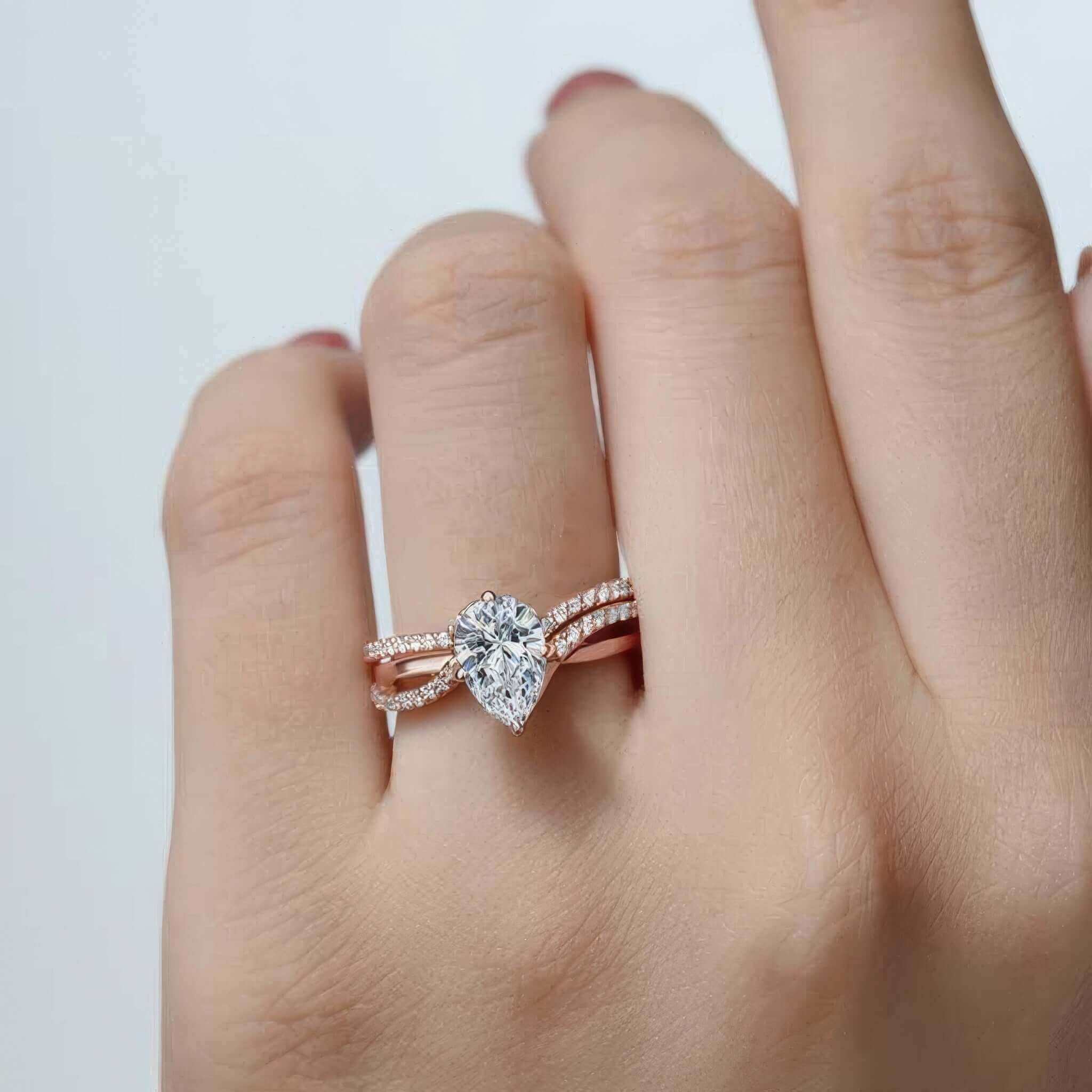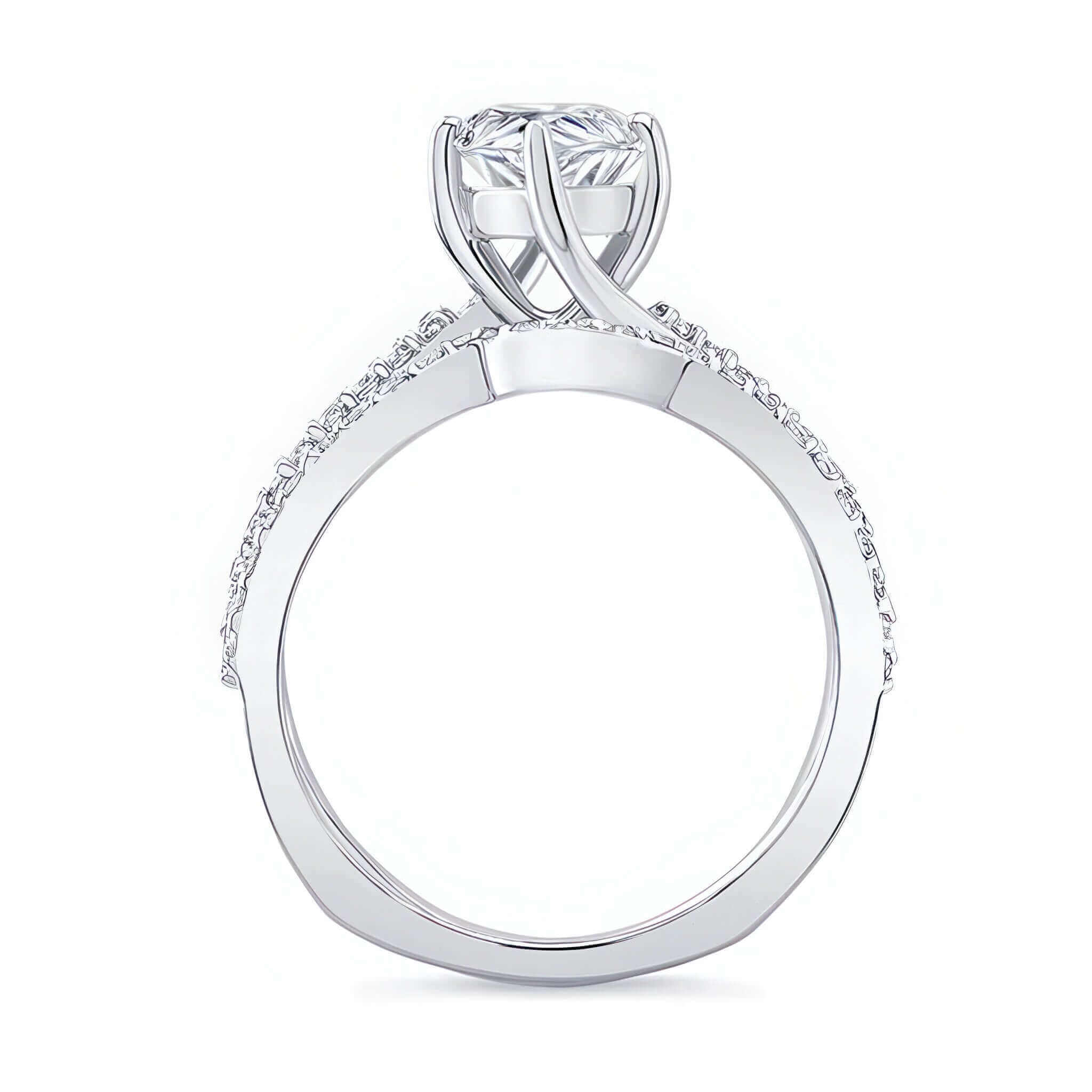 This pear shaped twist bridal set features open curving shoulders sweeping up to create the prongs that hold the almond shaped center while the opposing sides of the shank and matching wedding band are adorned with shared-prong set diamonds for a subtle sparkle that will draw the eye.