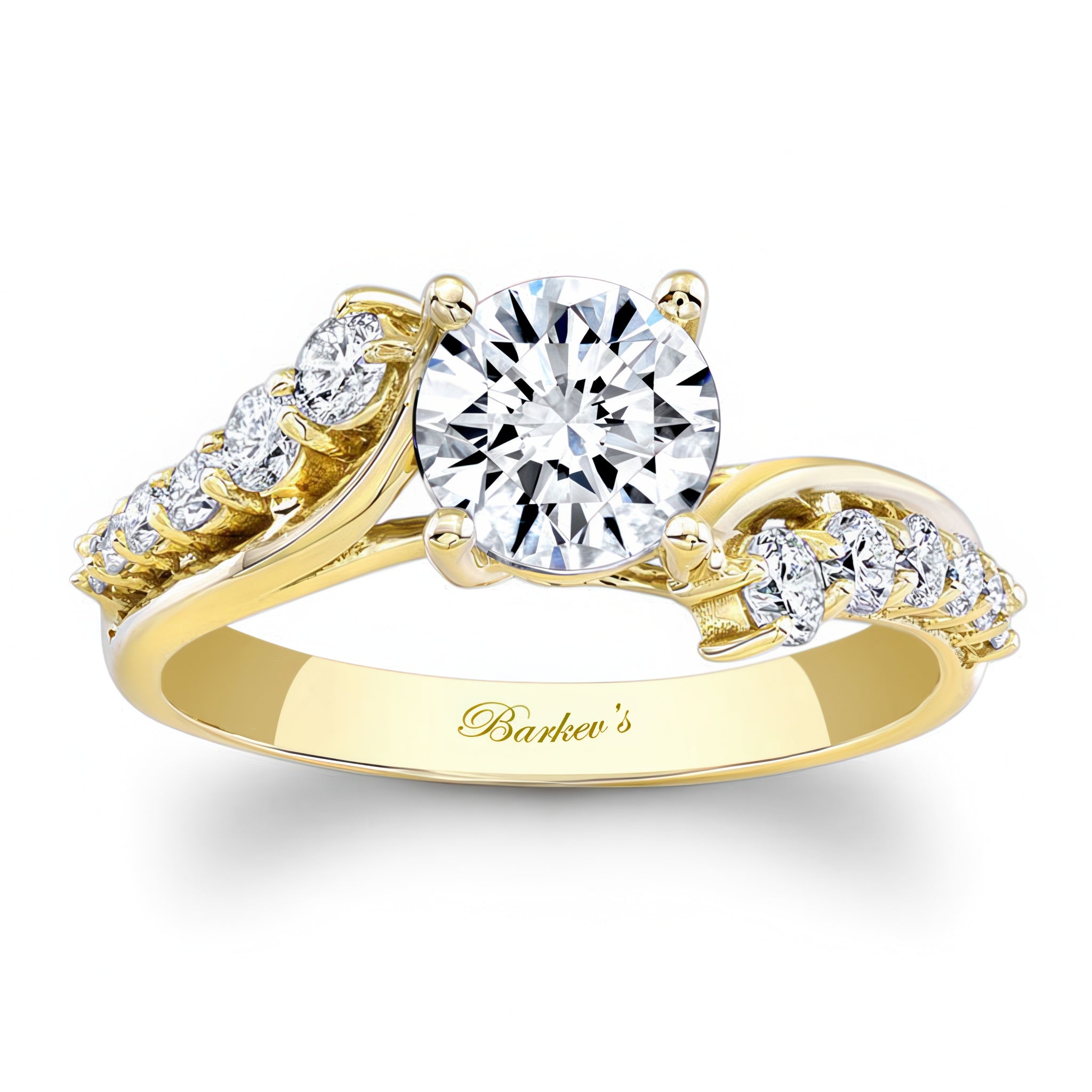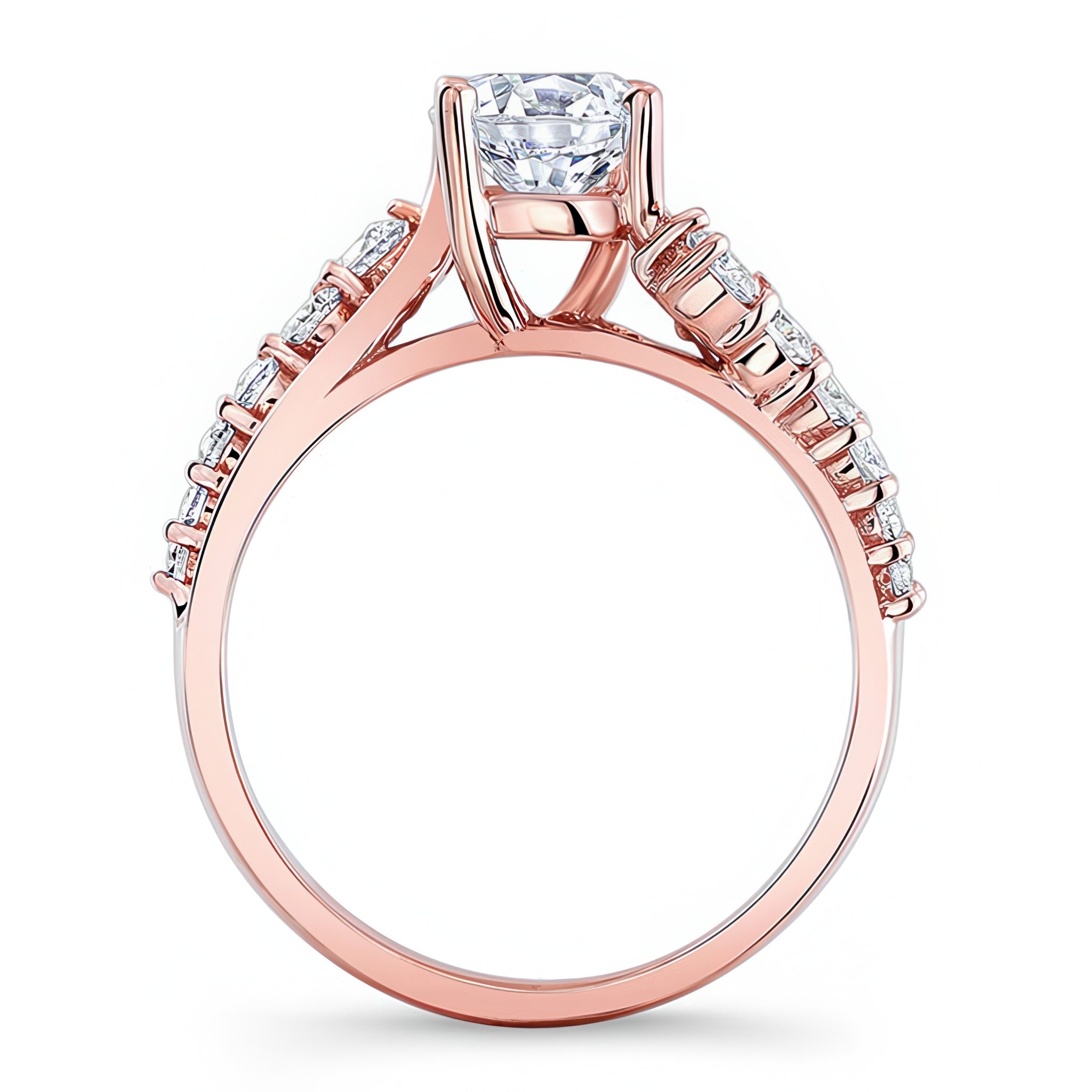 This classic diamond ring sports a prong set round center with a curving shank adorned with shared prong set diamonds cascading down opposing shoulders for a sophisticated look.