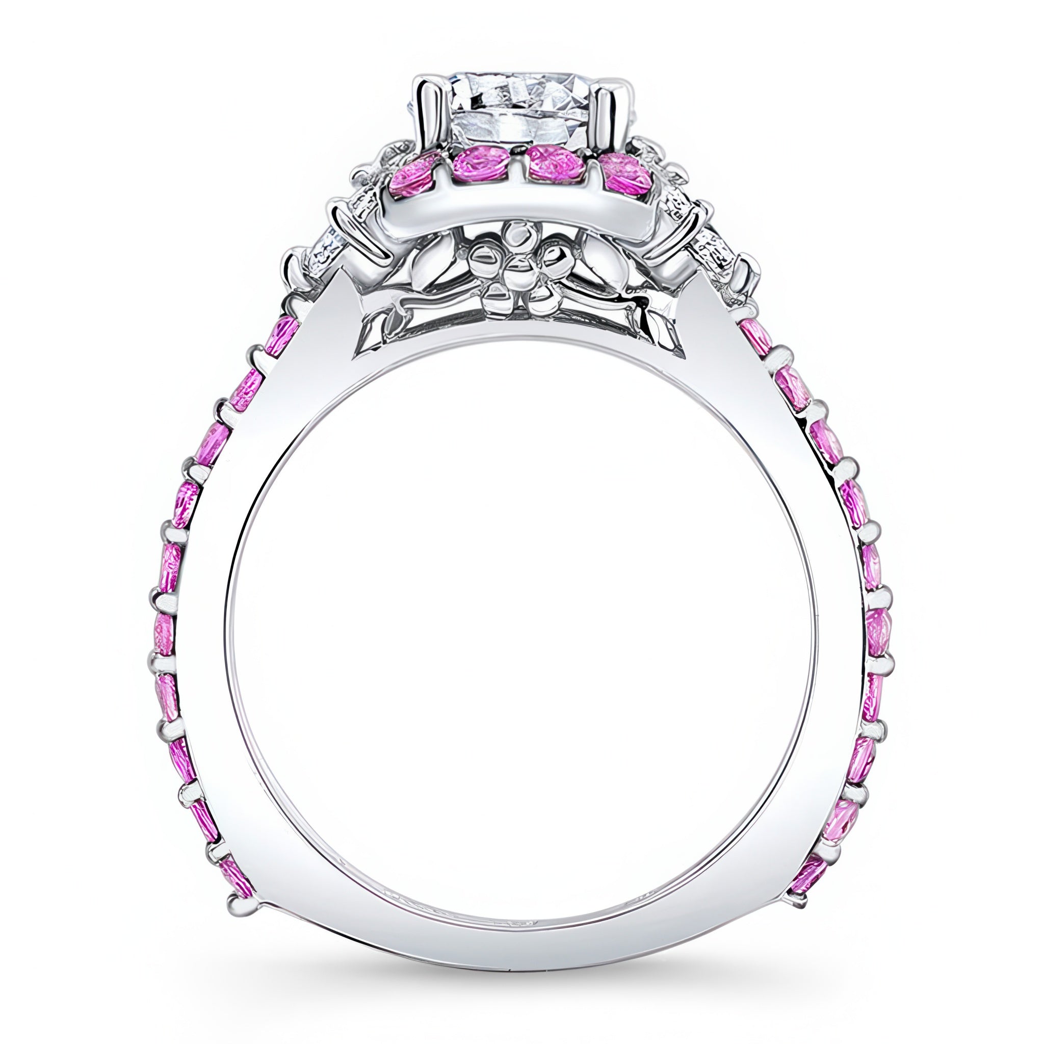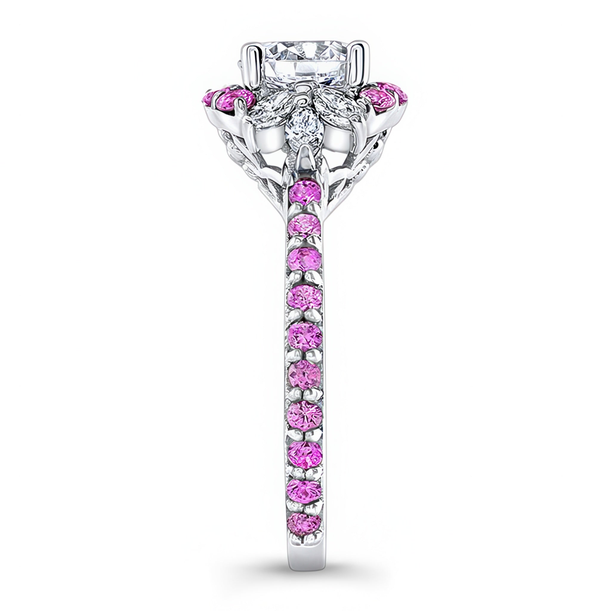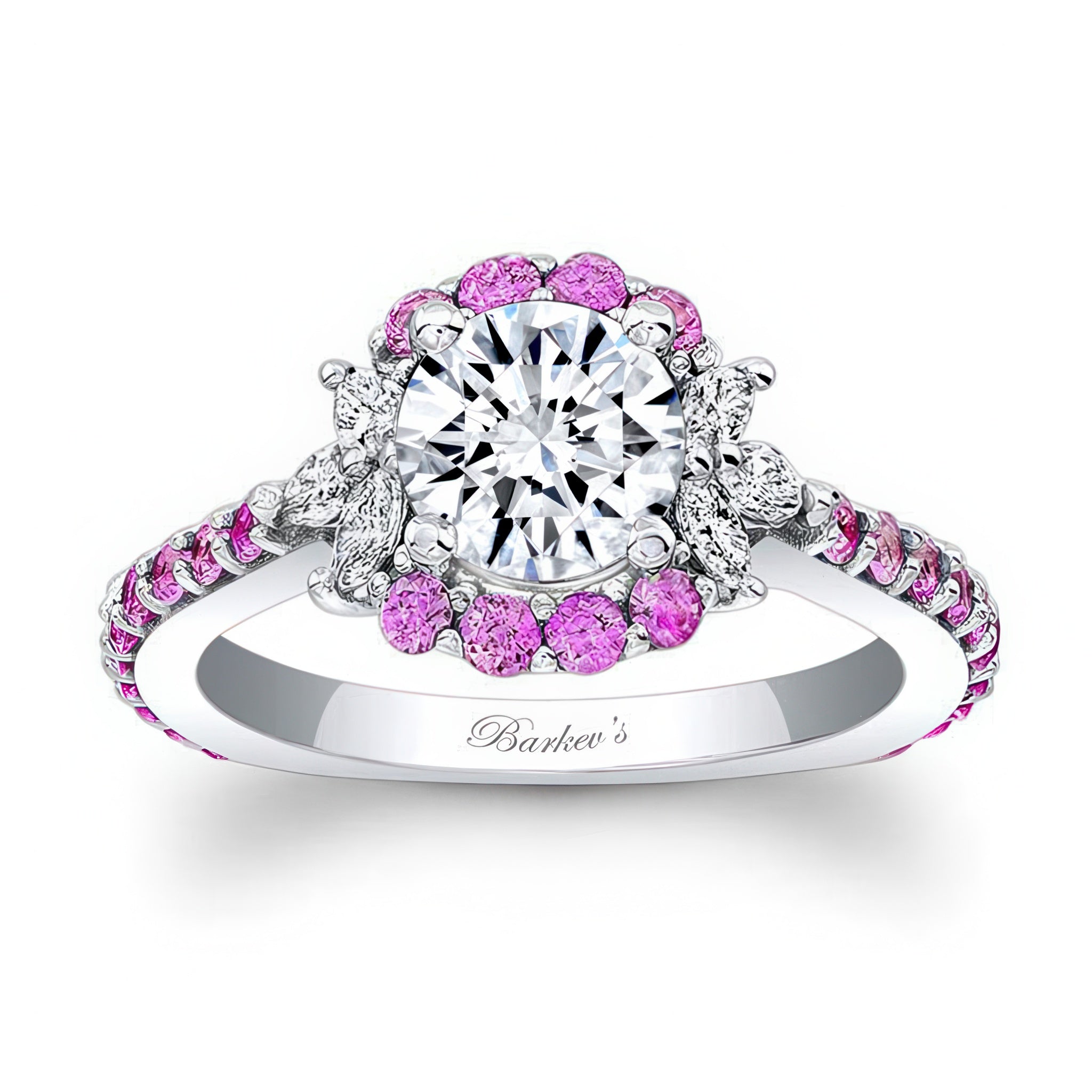 This marquise halo pink sapphire accent ring features a prong set round center encircled with round and marquise cut diamonds and pink sapphires for a stunning alternative to a traditional halo ring.
