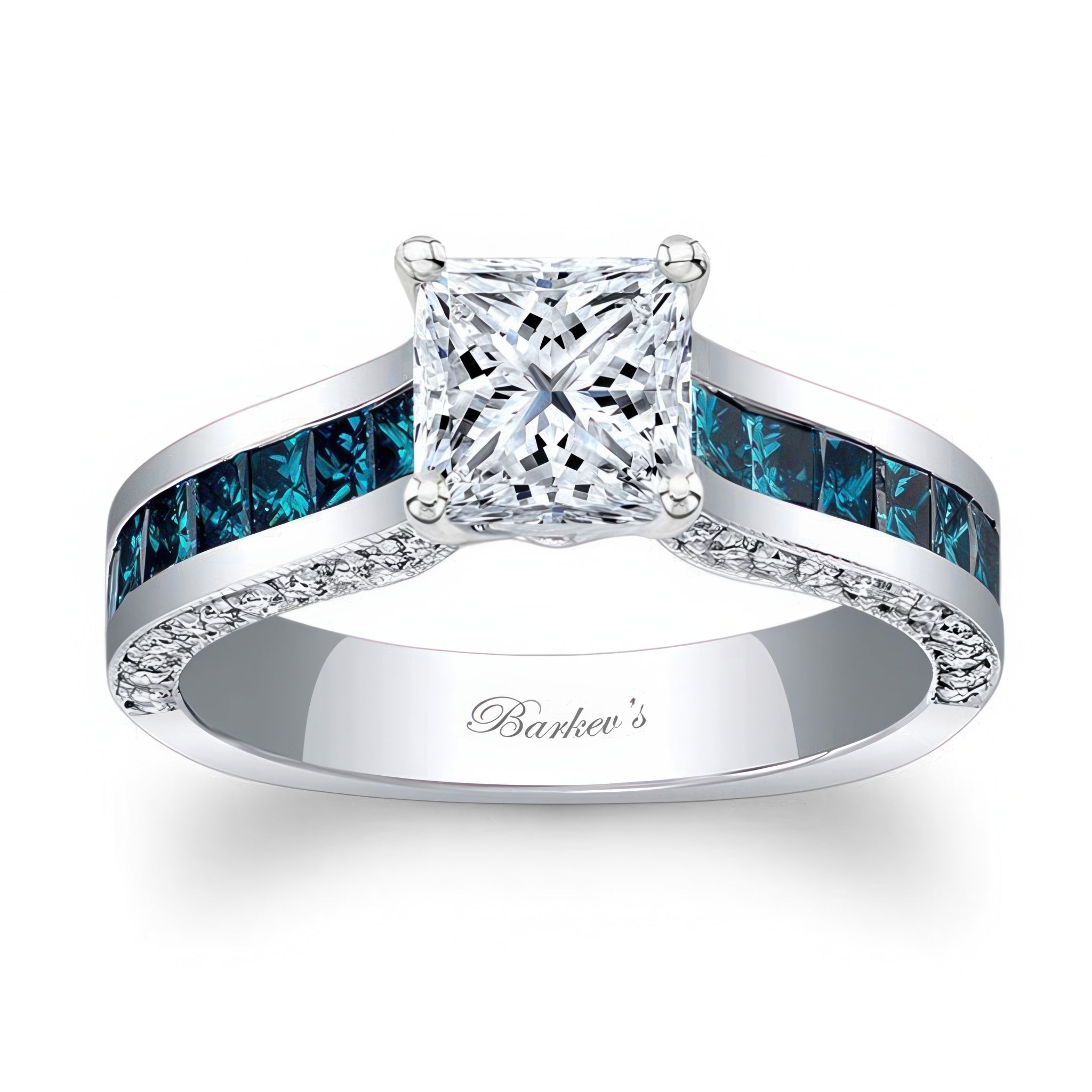 This princess cut blue diamond accent ring has a prong set center with a channel of princess cut blue diamonds on the shoulders and pave set diamonds on the sides for an elegant touch of sophistication.