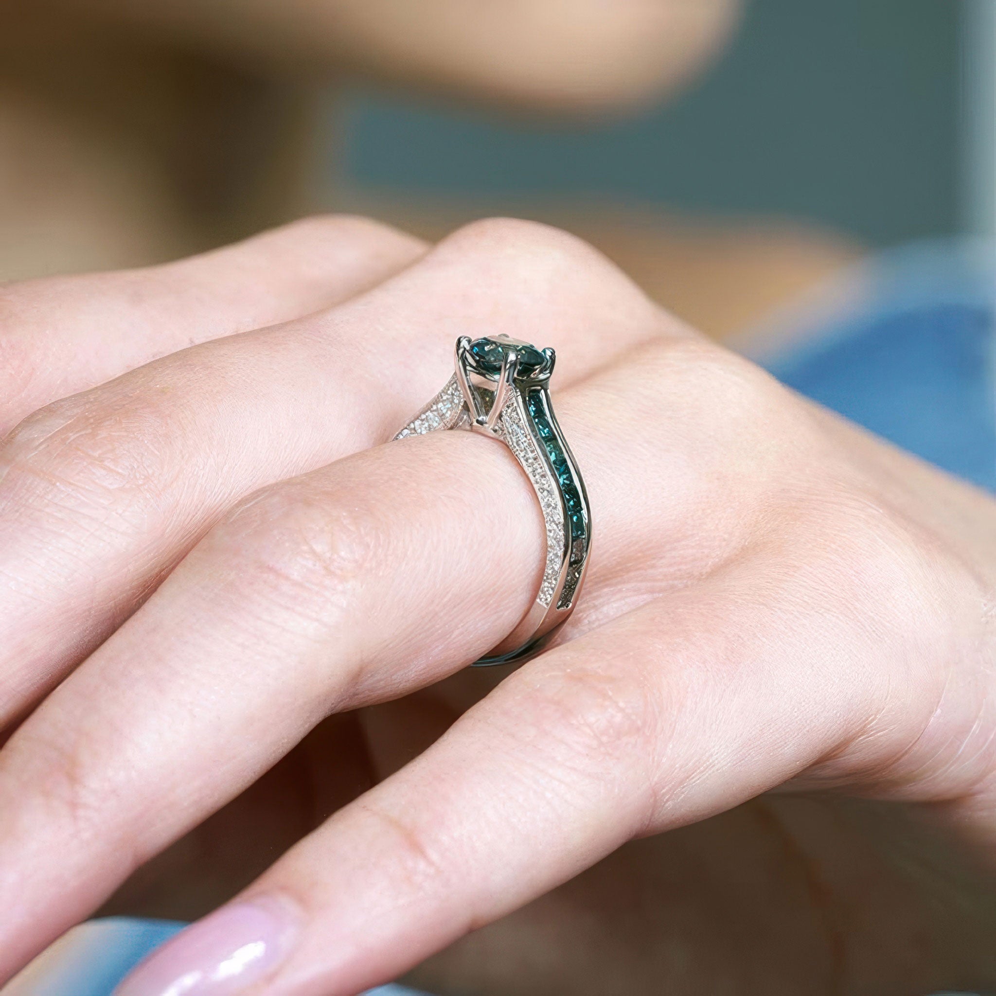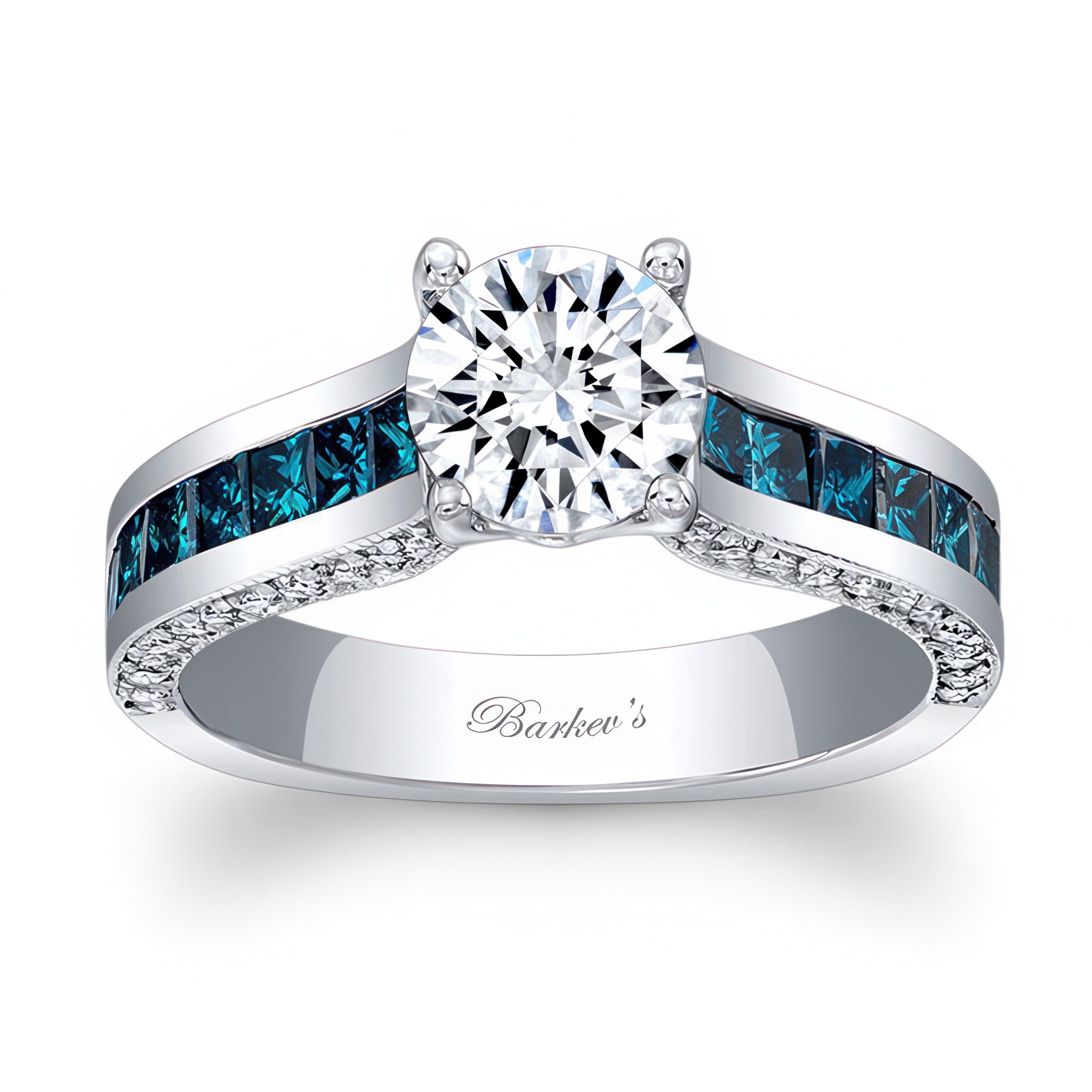 This round and princess cut blue diamond accent ring has a prong set center with a channel of princess cut blue diamonds on the shoulders and pave set diamonds on the sides for an elegant touch of sophistication.