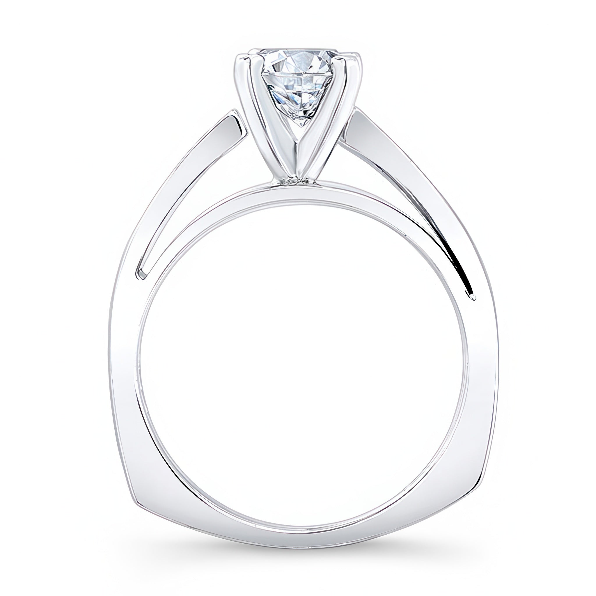 This solitaire round diamond ring is artfully designed with a split shank and cathedral shoulders that rise to the prong-set center with a bright polished gallery.
